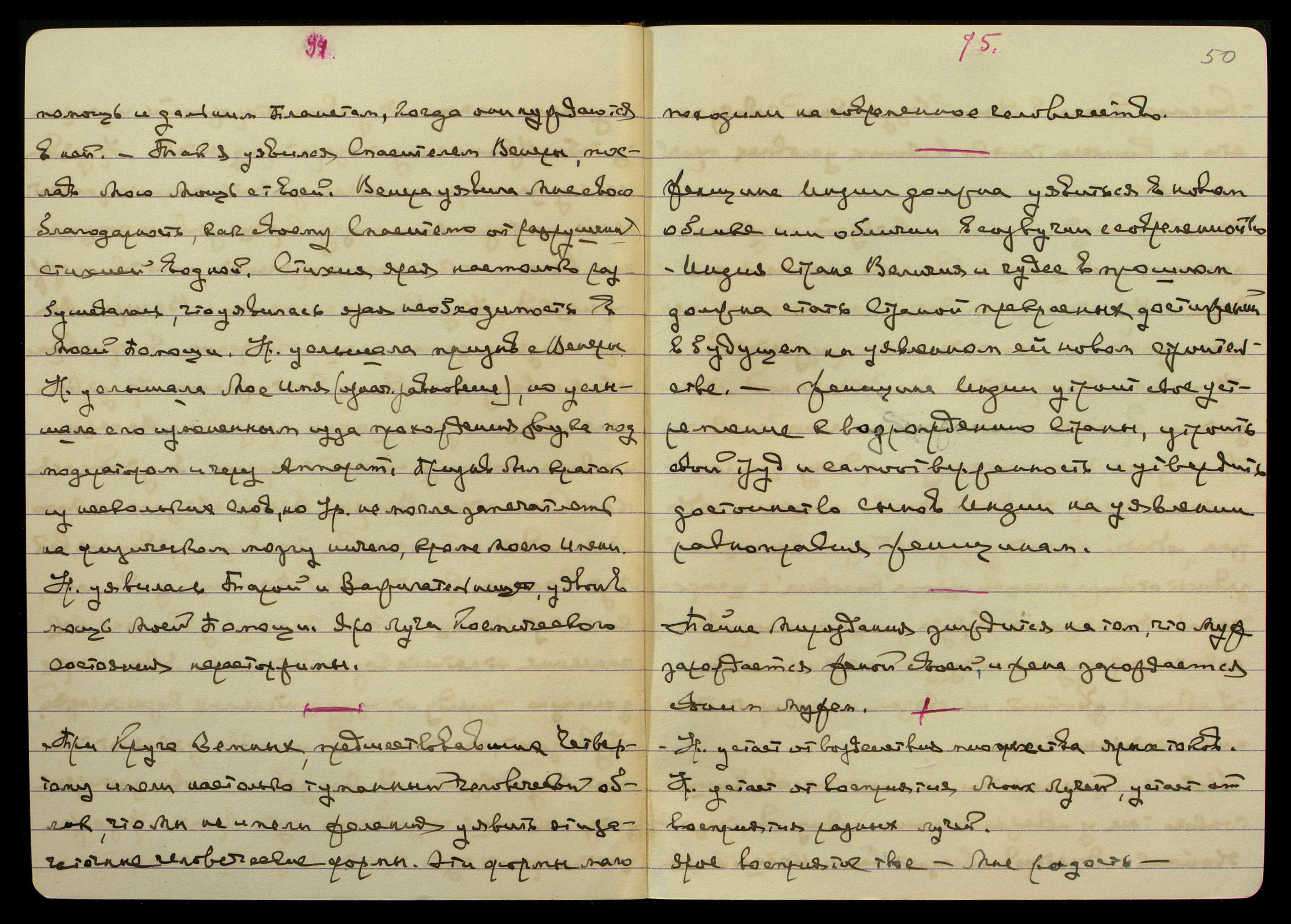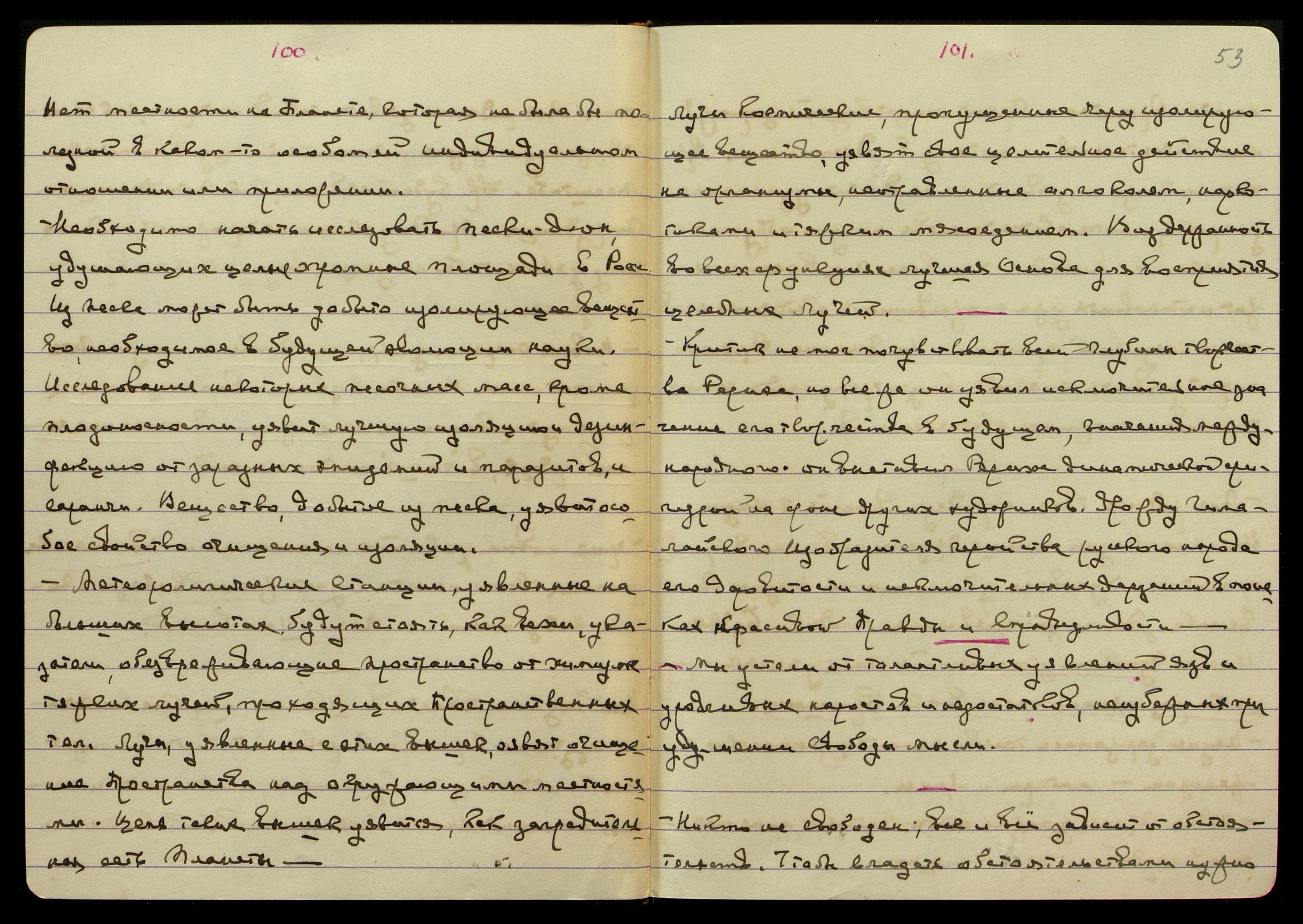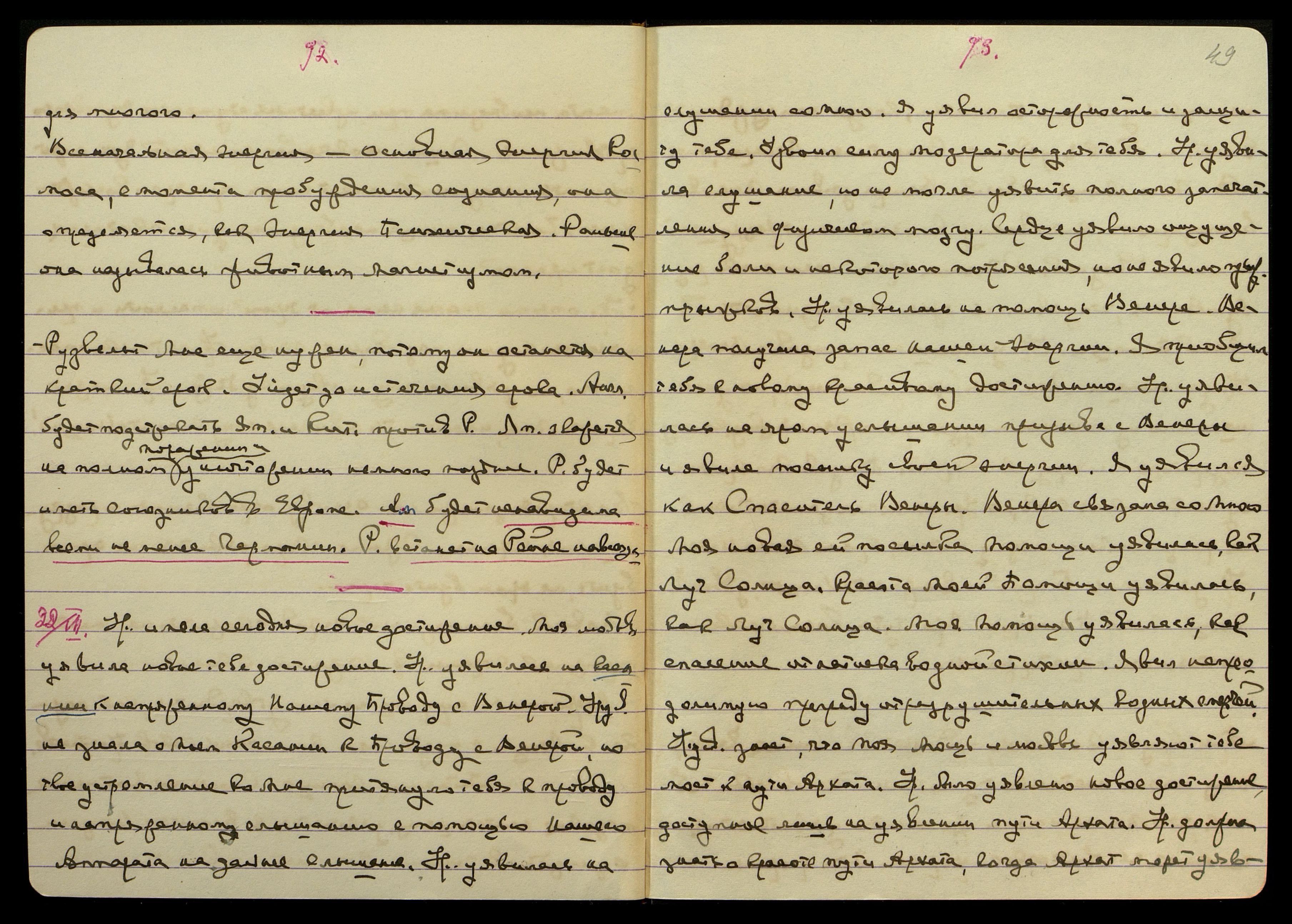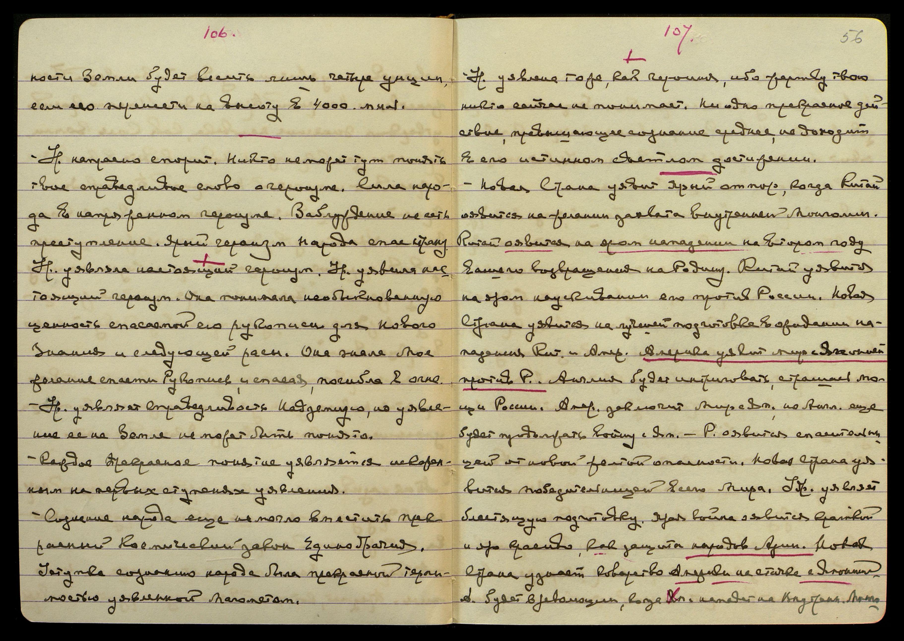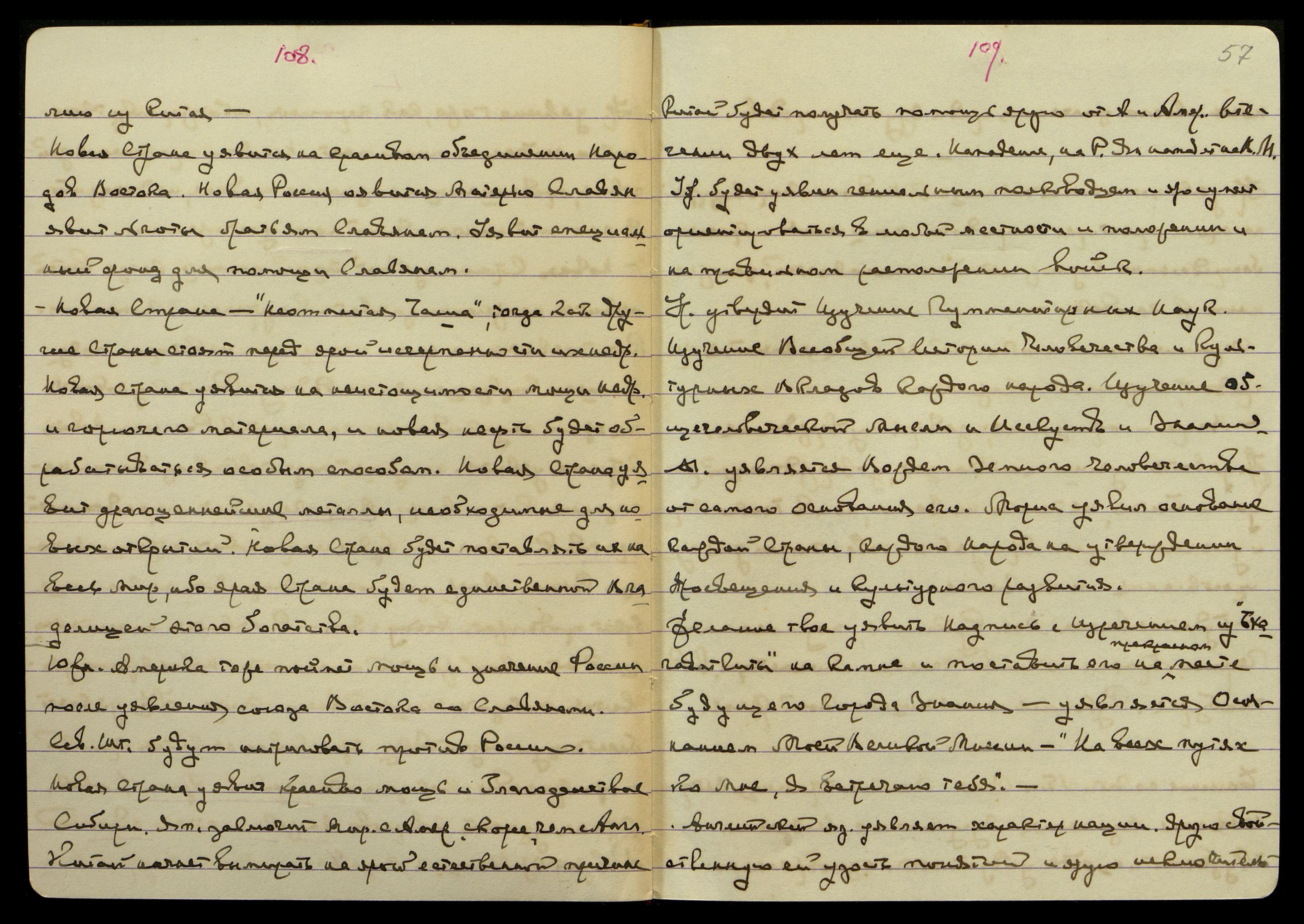 Южн[ая] Америка тоже поймет мощь и значение России после уявления союза Востока со Славянами. Сев[ероамериканские] Шт[аты] будут интриговать против России. Новая Страна уявит красиво мощь и благоденствие Сибири. Яп[ония] заключит мир с Амер[икой] скорее, чем с Англ[ией]. Китай начнет вымирать на ярой естественной причине. Китай будет получать помощь ярую от А[нглии] и Амер[ики] в течении двух лет еще. Нападение, на Р. Яп. [слово неразборчиво] В.М. Удр[ая] будет уявлен гениальным полководцем и яро сумеет ориентироваться в любой местности и положении и на правильном расположении войск.