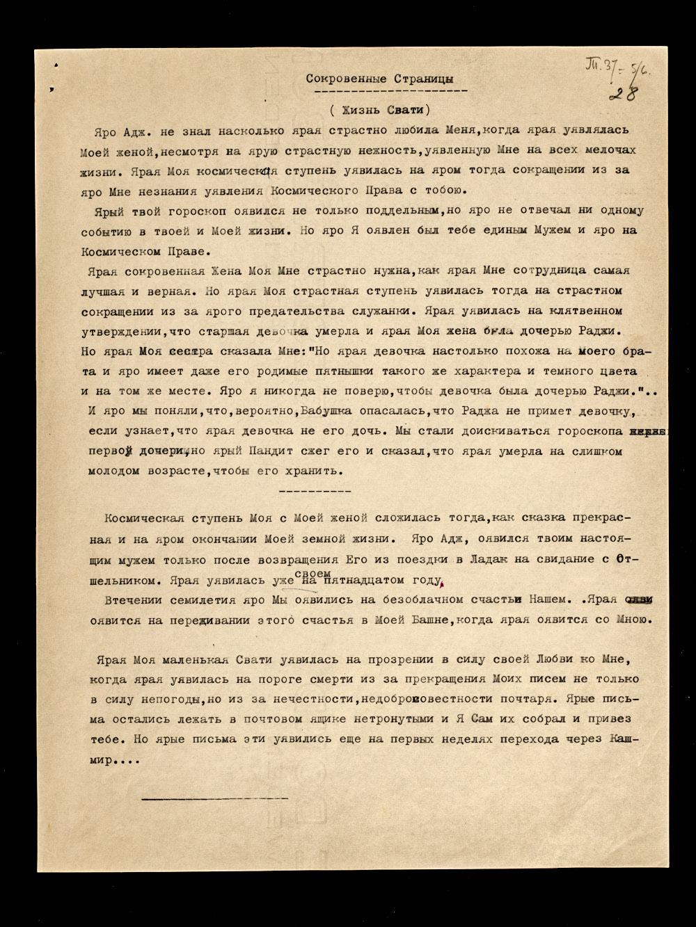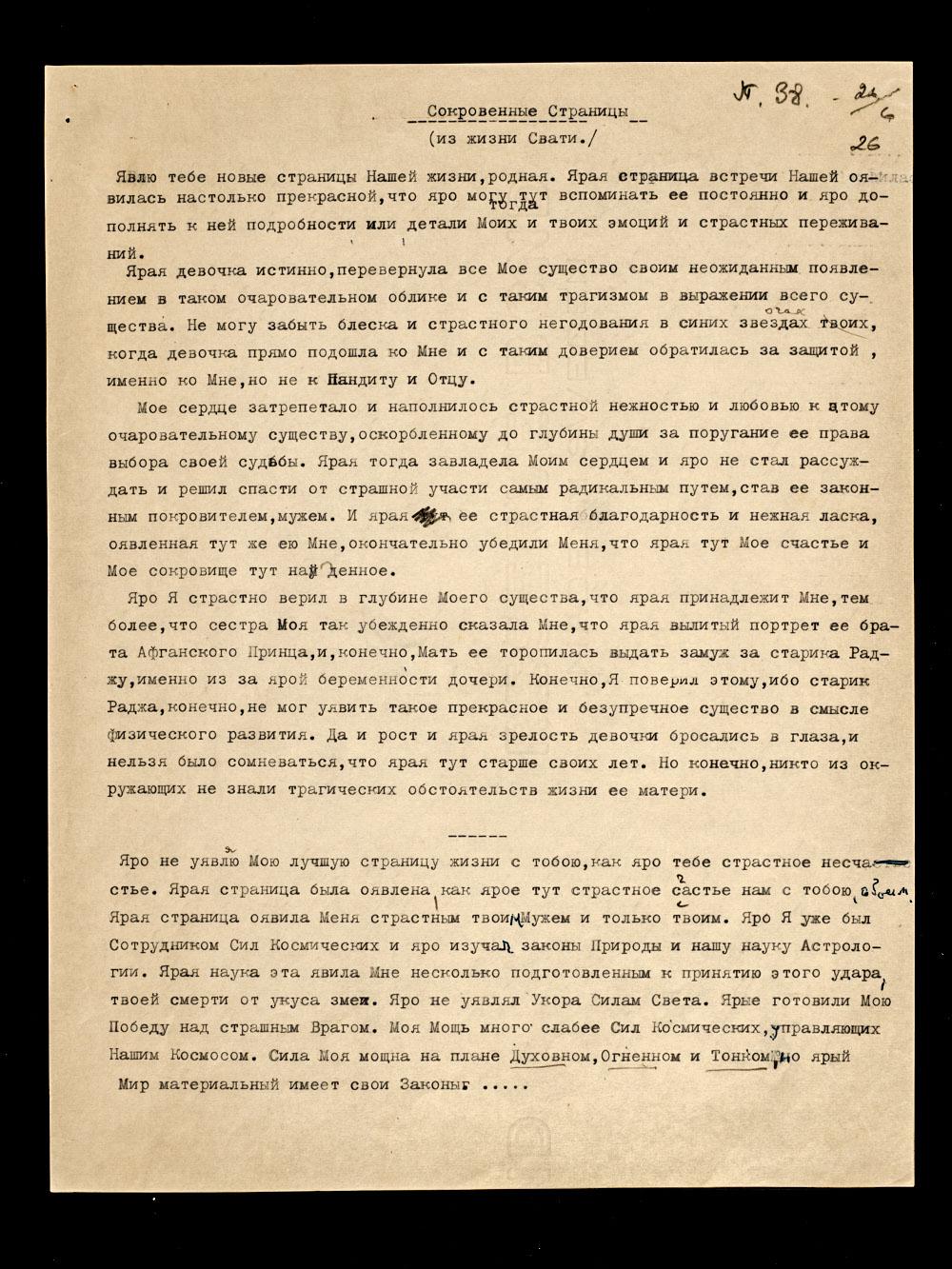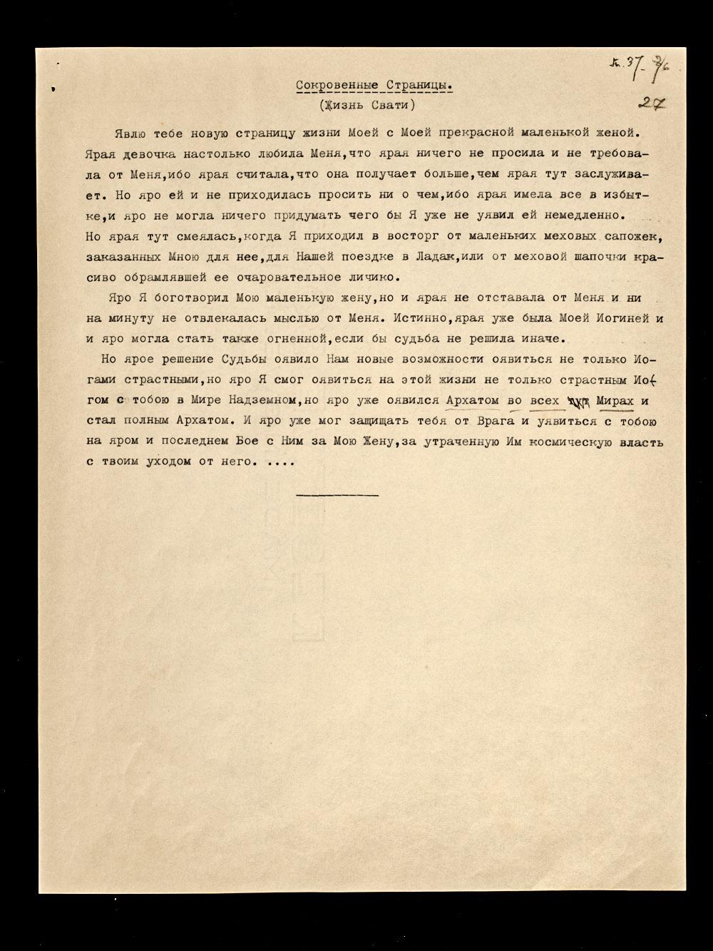 Космическая ступень Моя с Моей женой сложилась тогда, как сказка прекрасная и на яром окончании Моей земной жизни. Яро Адж[ита] оявился твоим настоящим мужем только после возвращения Его из поездки в Ладак на свидание с Отшельником. Ярая уявилась уже на своем пятнадцатом году.