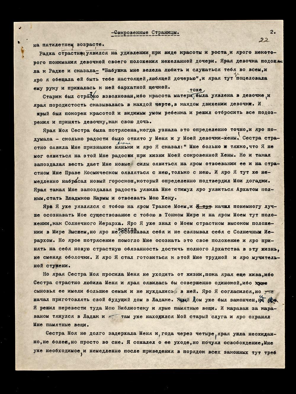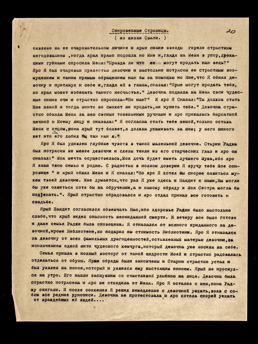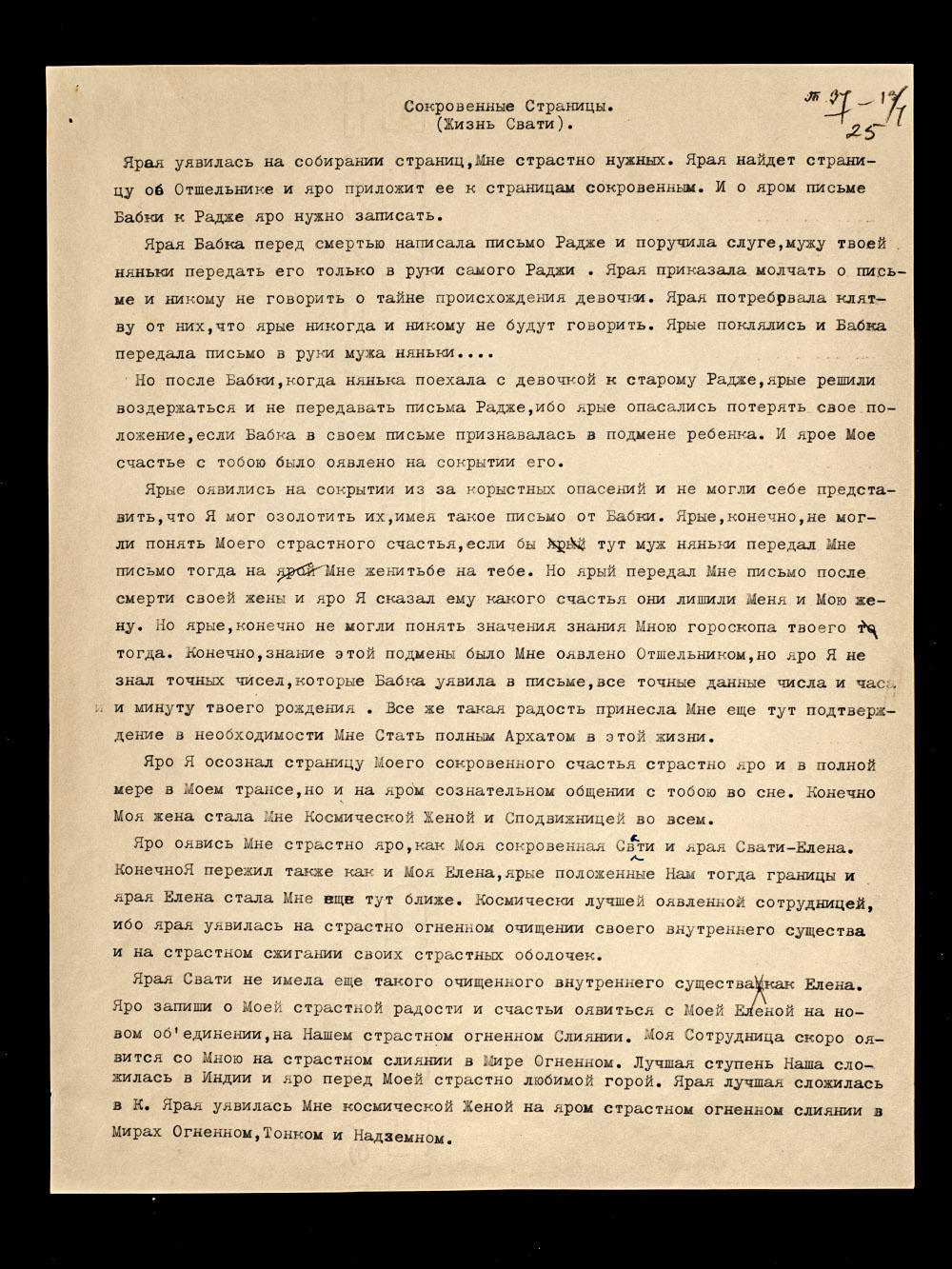 Космическая ступень Моя с Моей женой сложилась тогда, как сказка прекрасная и на яром окончании Моей земной жизни. Яро Адж[ита] оявился твоим настоящим мужем только после возвращения Его из поездки в Ладак на свидание с Отшельником. Ярая уявилась уже на своем пятнадцатом году.