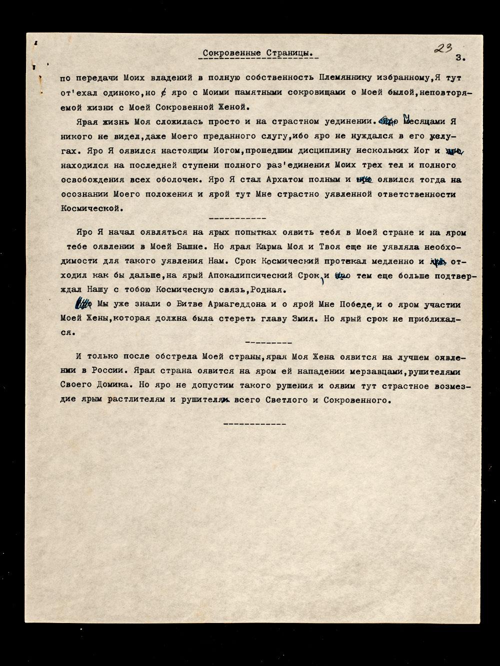 Яро Я начал оявляться на ярых попытках оявить тебя в Моей стране и на яром тебе оявлении в Моей Башне. Но ярая Карма Моя и Твоя еще не уявляла необходимости для такого уявления Нам. Срок Космический протекал медленно и отходил как бы дальше, на ярый Апокалипсический Срок, и тем еще больше подтверждал Нашу с тобою Космическую связь, Родная.