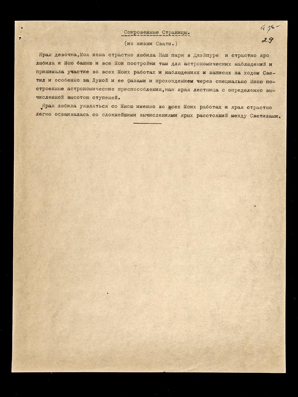 Ярая девочка, Моя жена, страстно любила Наш парк в Джайпуре и страстно яро любила и Мою башню, и все Мои постройки там для астрономических наблюдений, и принимала участие во всех Моих работах и наблюдениях и записях за ходом Светил и особенно за Луной и ее фазами и прохождением через специально Мною построенные астрономические приспособления, как ярая лестница с определенно вычисленной высотою ступеней.