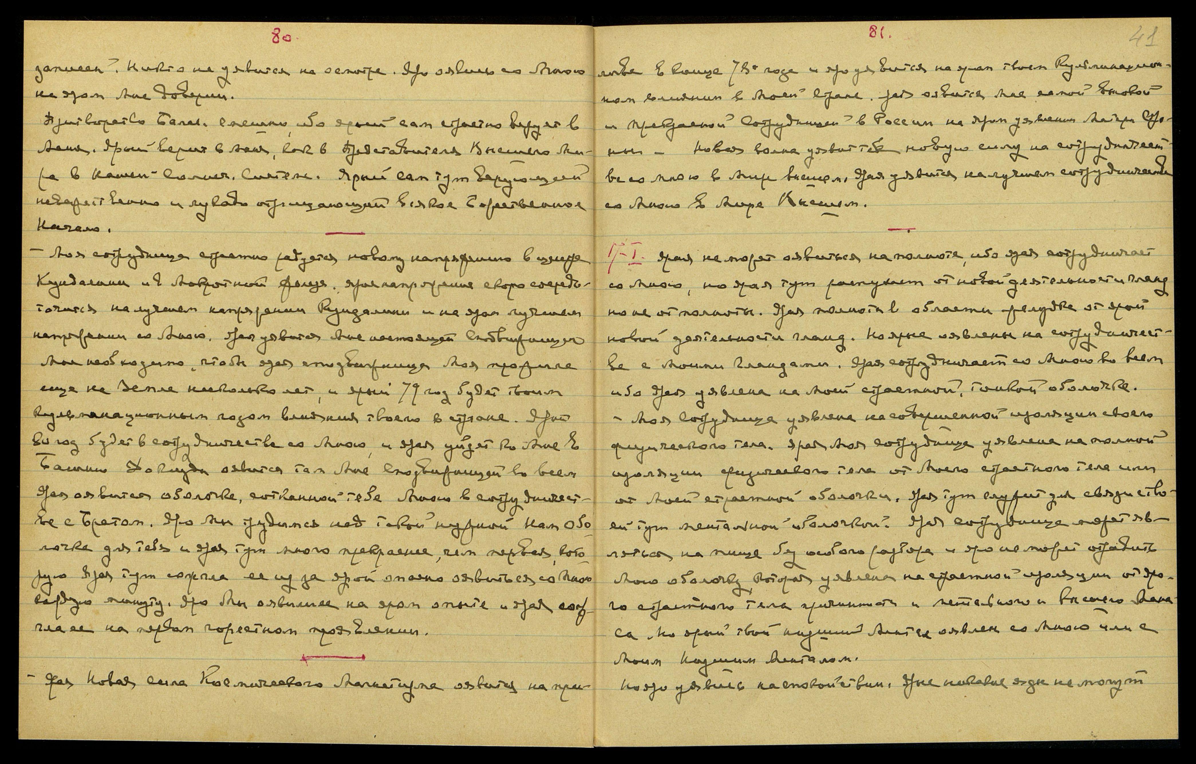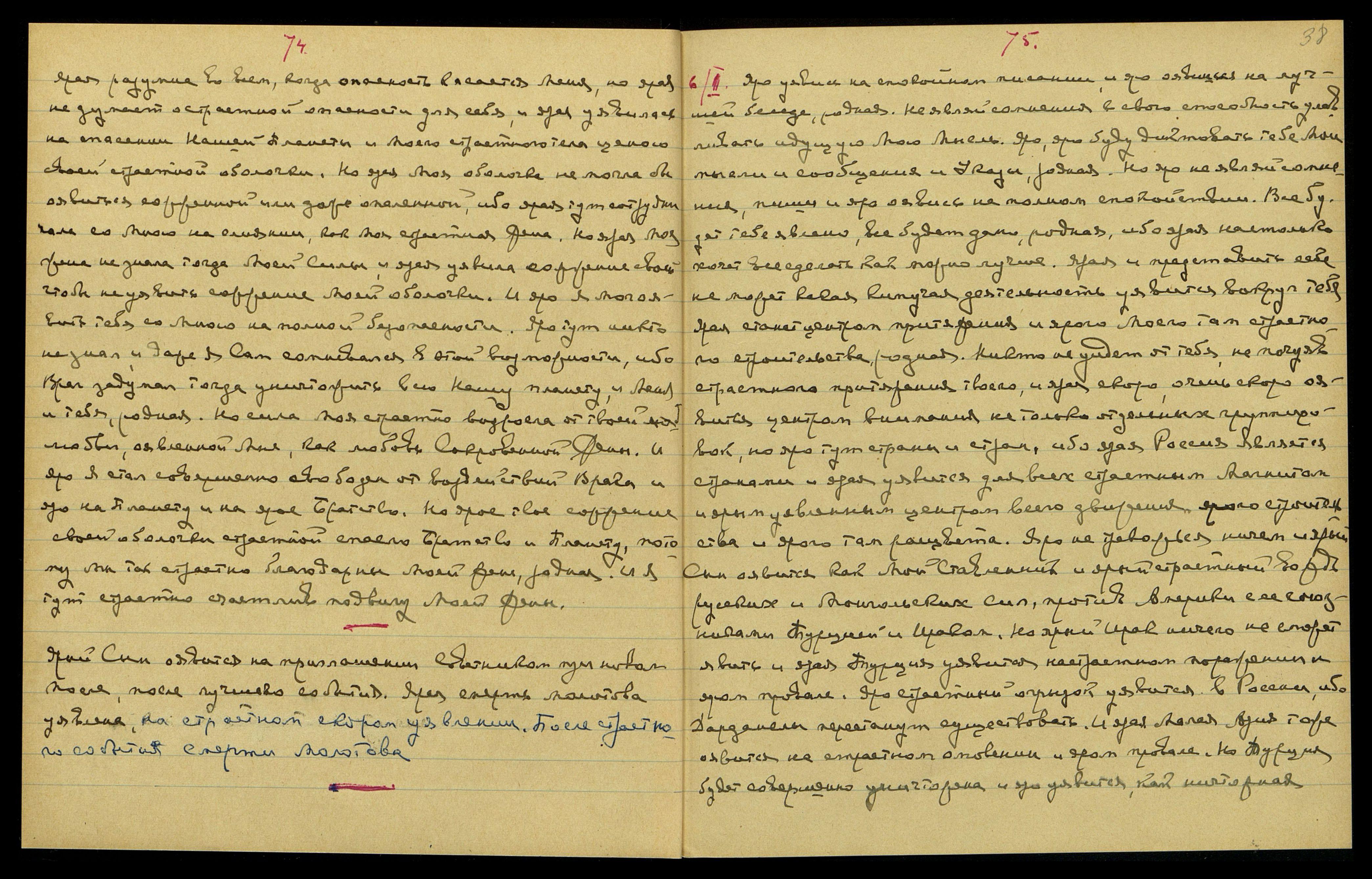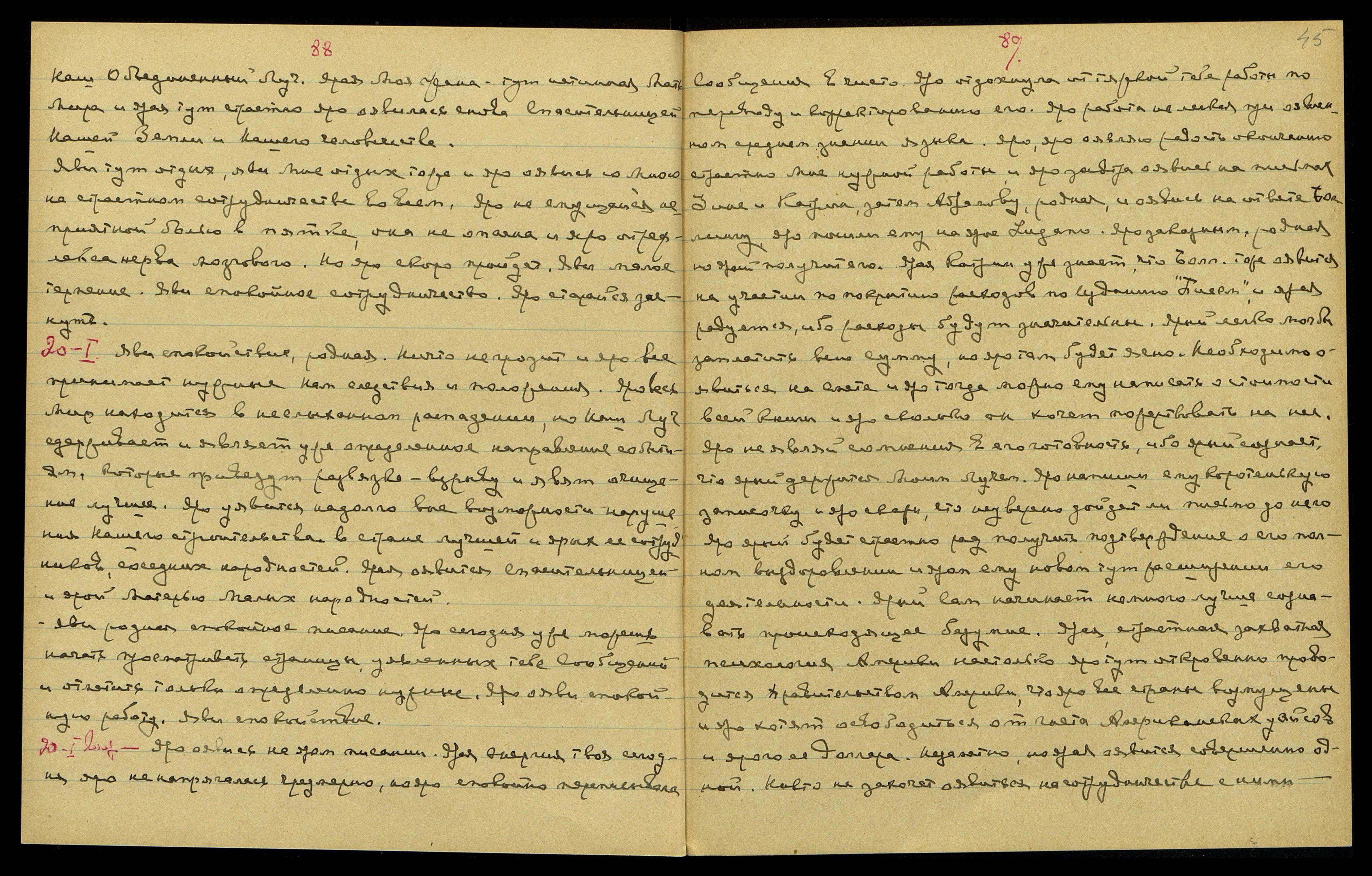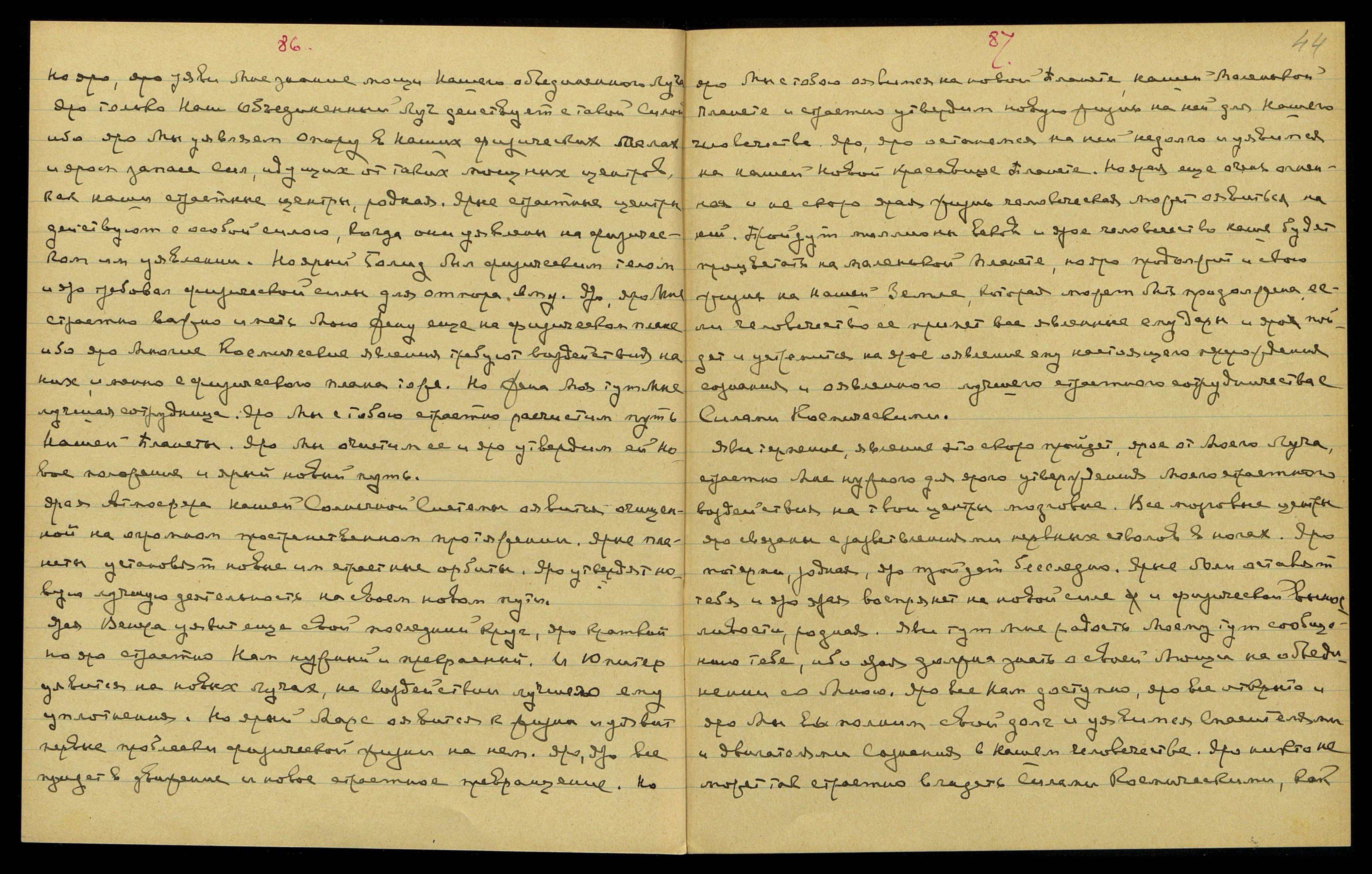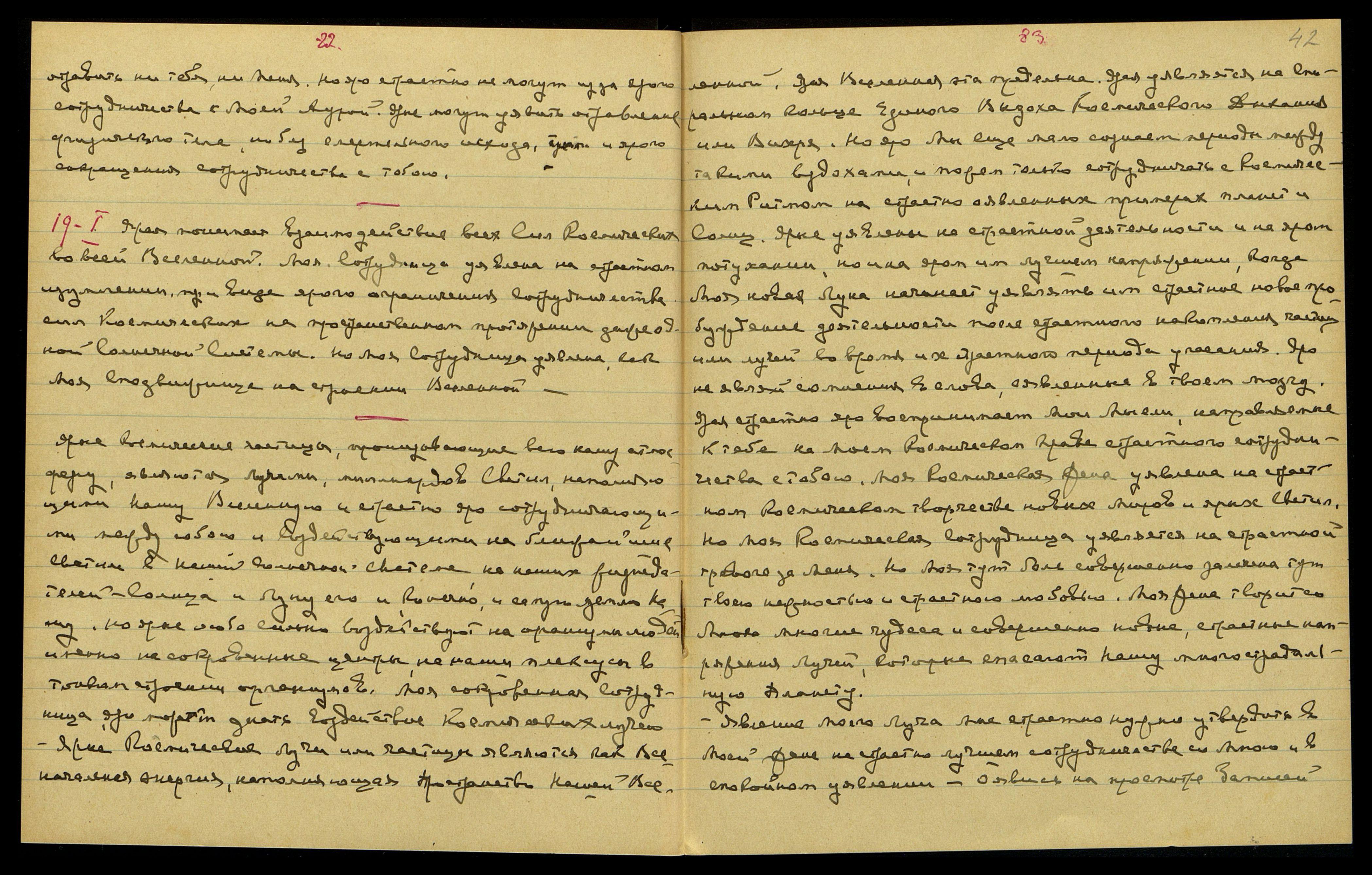 19-I, вечер. Не только уявись на писании, но на яром страстно спокойном принятии мыслей, посланных тебе, родная. Яро, страстно яро хочу уявить тебе Мою следующую ступень, ибо яро мало времени осталось до ярой новой Нам ступени. Яро необходимо закрепить этот легчайший способ записывания, родная. Но яро не торопись и пиши аккуратно, записывай окончания слов. Яро буду передавать через твой мозг самые сложные сообщения и ярая запишет спокойно и ясно, и не будет переспрашивать, ибо все будет тебе ясно.