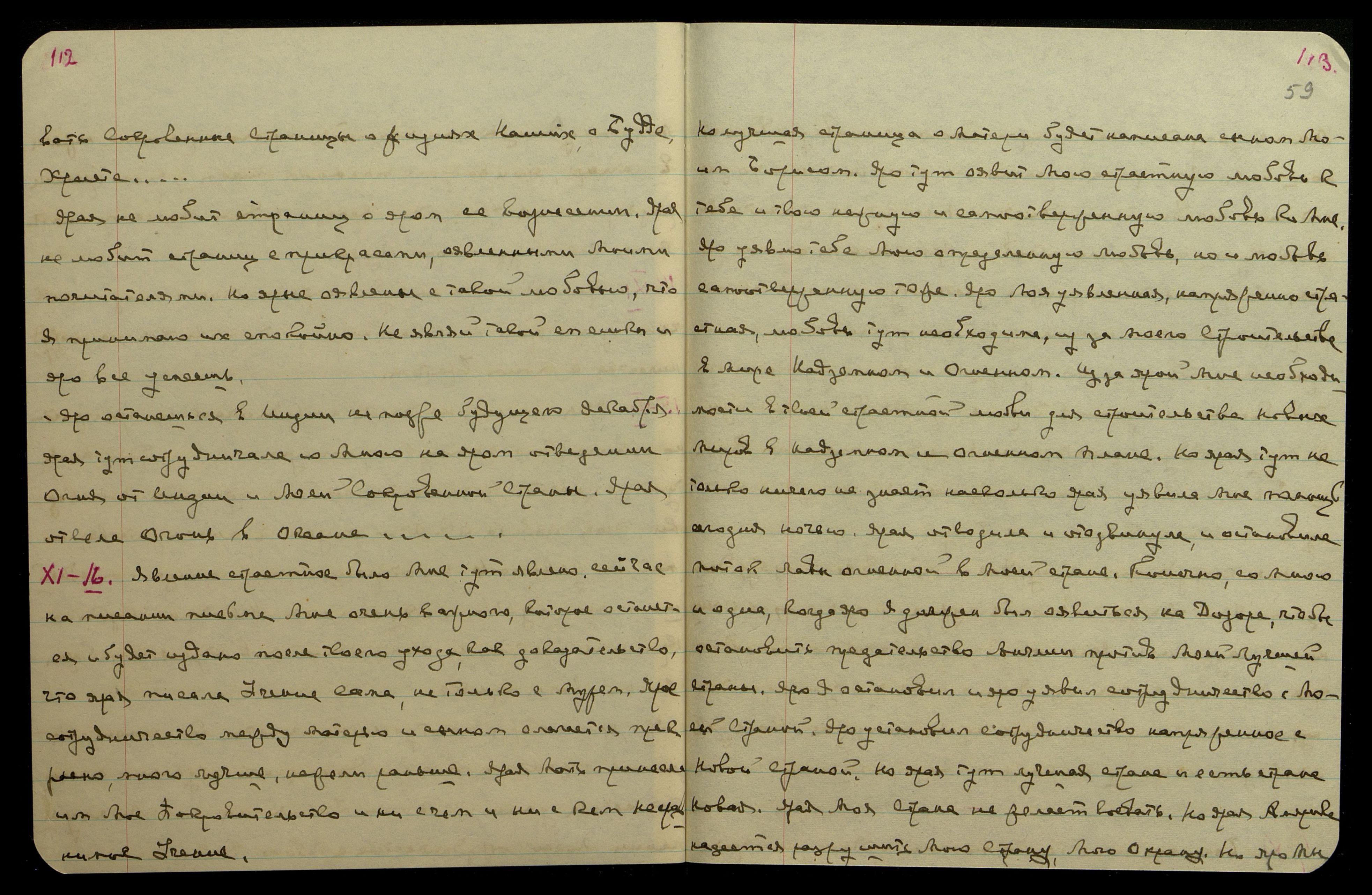XI/16. Явление страстное было Мне тут явлено сейчас на писании письма Мне очень важного, которое останется и будет издано после твоего ухода как доказательство, что ярая писала Учение сама, не только с мужем. Ярое сотрудничество между матерью и сыном слагается прекрасно, много лучше, нежели раньше. Ярая Мать принесла им Мое Покровительство и ни с чем и ни с кем несравнимое Учение.