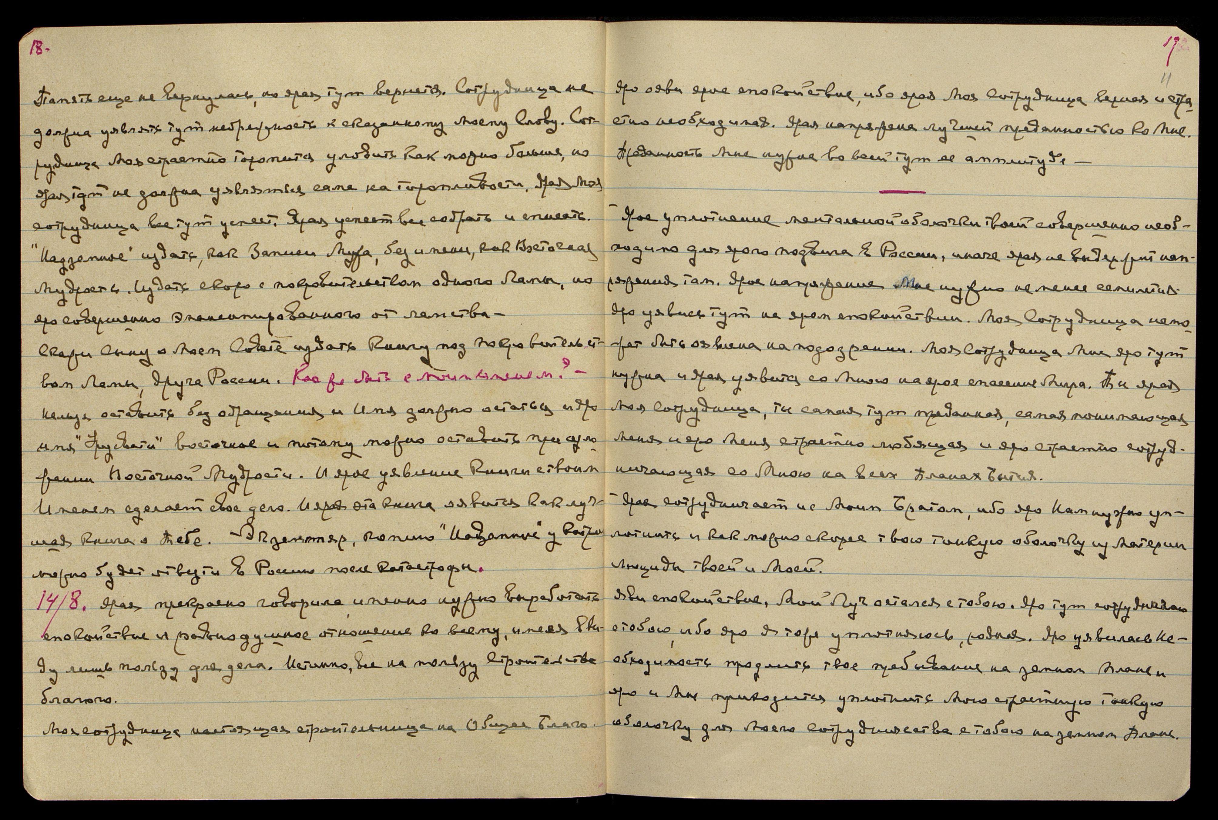 Яро утрой внимание к Сыну и уяви ему интерес к странам Востока к Монголии и Тиб[ету]. Яро внуши интерес на ярое строительство Моей Страны лучшей, Монголии и Тибета. Но яро там немало негодного элемента, но уяви ему больше доверять Монголам и Тибетцам, но ярые русские там − страстно негодный элемент, ярых растлили до мозга костей. Много их погибнет в междуусобных битвах. После Турецкой Кампании ярая Р[оссия] расколется на Восточную и на Западную, но яро ненадолго, только на несколько месяцев. Маленков будет сотрудничать с сыном, и яро уявятся на защите страны от развала. Евреи и оставшиеся иностранцы будут мутить против Маленкова. Мы должны изгнать всех евреев и с ними всю иностранную свору и проявить нужную твердость и спасение Р[оссии].