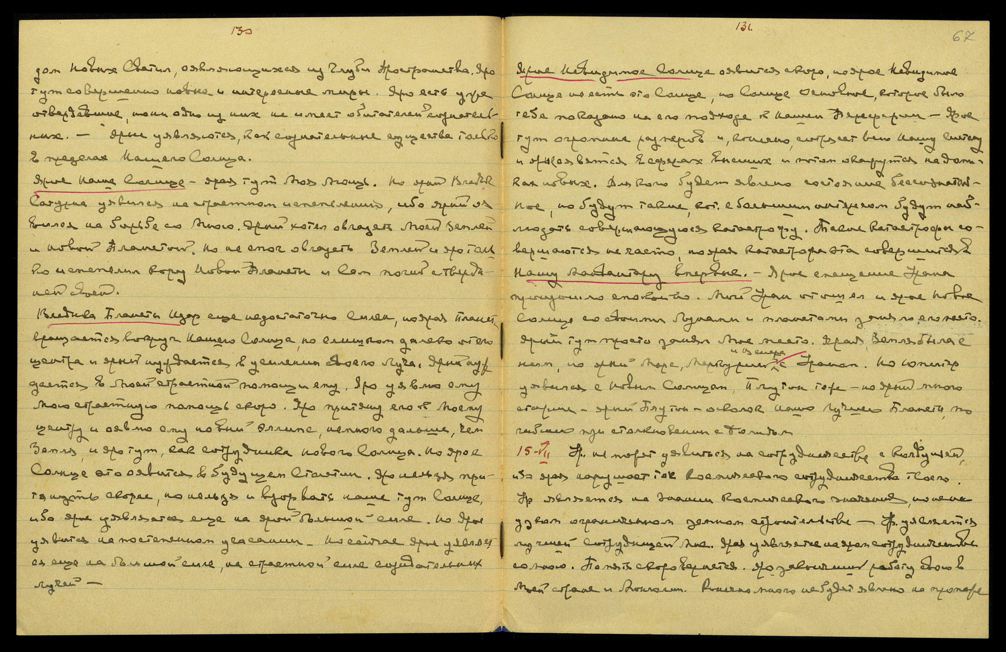 Сотрудничество придет страстно скорее, чем ярая думает. Яви сотрудничество и напиши Зине и подтверди ваше желание служить Р[оссии]. Пусть передаст через представителя в Вашингт[оне]. Ярая может передать ваше желание письмом обращения Сына и Матери. Ярый Сын может служить на многих поприщах − Советник по Дальневосточным делам. Поставь "советник" в конце. Ярая из-за престарелого возраста и слабости сердца не может принять регулярную должность, но ярая может собирать и приводить в порядок и систему, материал, оставшийся после отца. Ярые оявятся на желании иметь вас работниками.