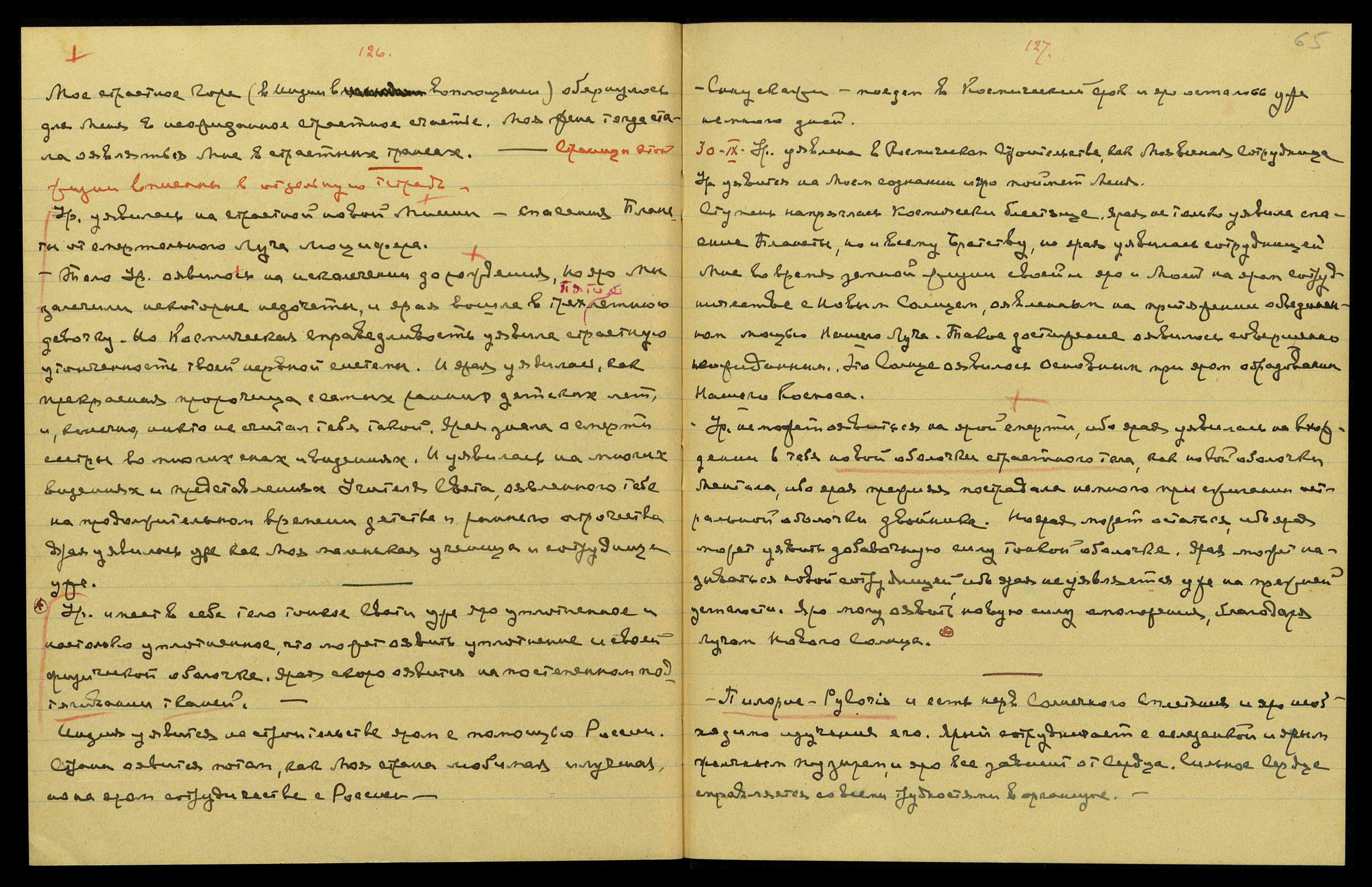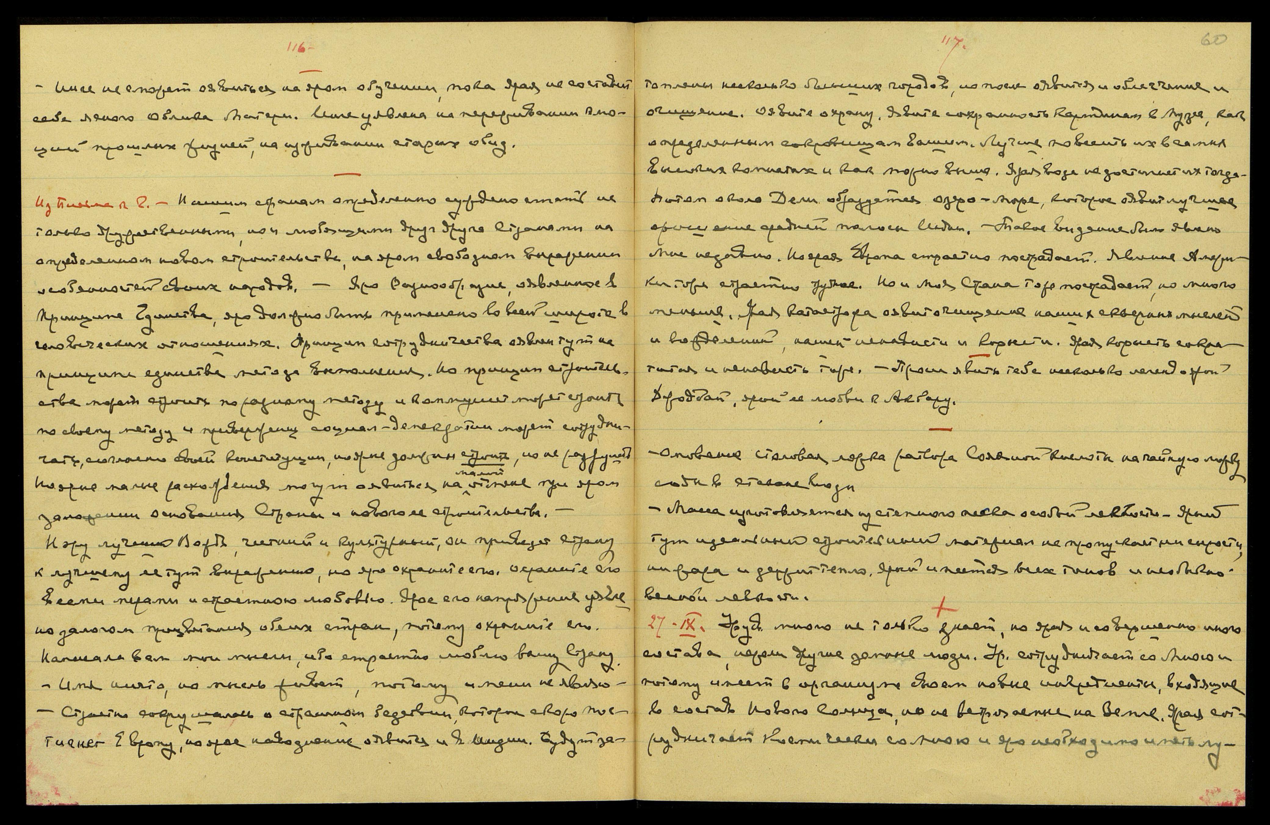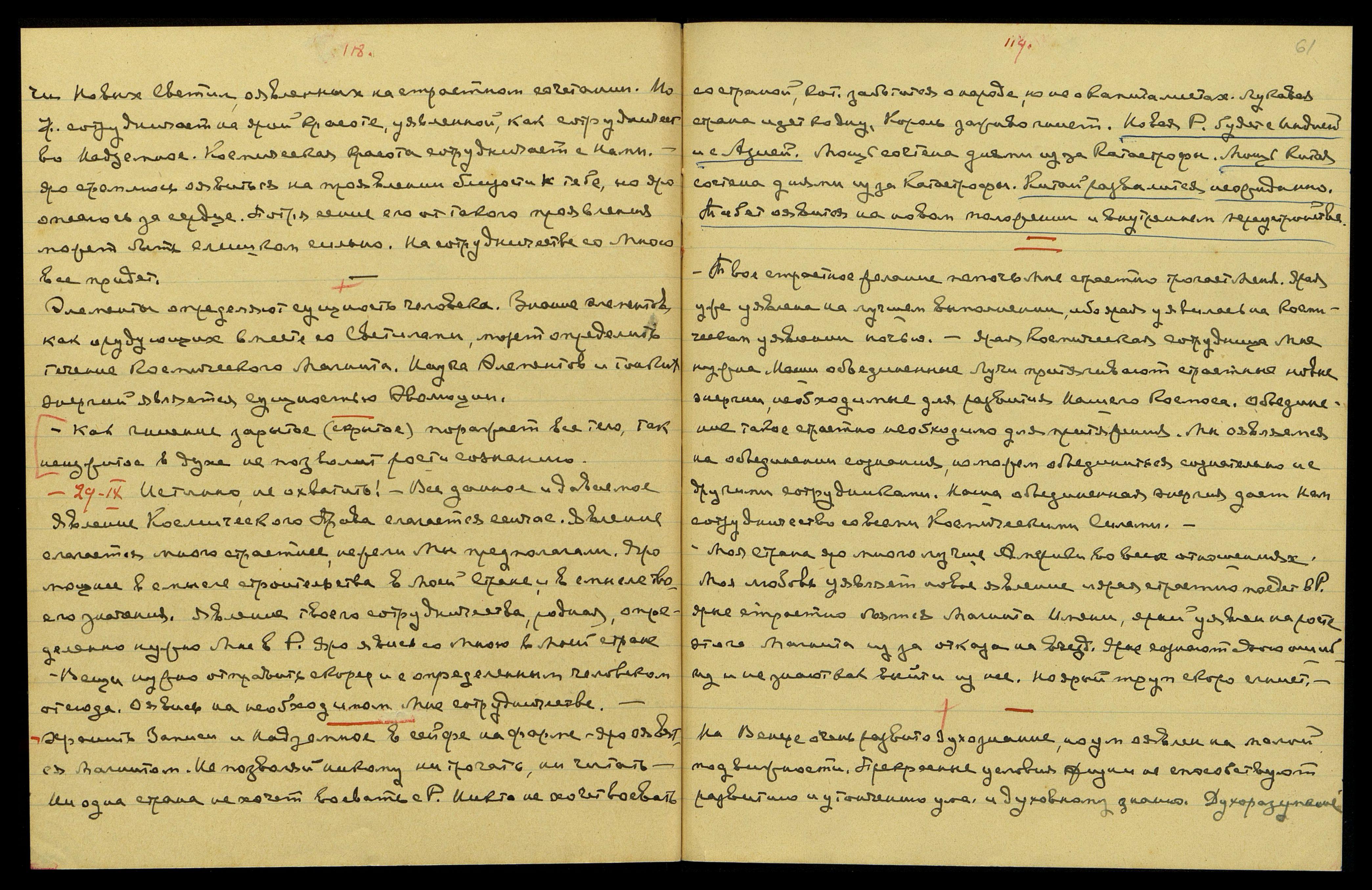 Ни одна страна не хочет воевать с Р[оссией]. Никто не хочет воевать со страной, которая заботится о народе, но не о капиталистах. Лукавая страна идет ко дну. Король заживо гниет. Новая Р[оссия] будет с Индией и с Азией. Мощь сочтена днями из-за Катастрофы. Мощь Китая сочтена днями из-за Катастрофы. Китай развалится неожиданно. Тибет оявится на новом положении и внутреннем переустройстве.