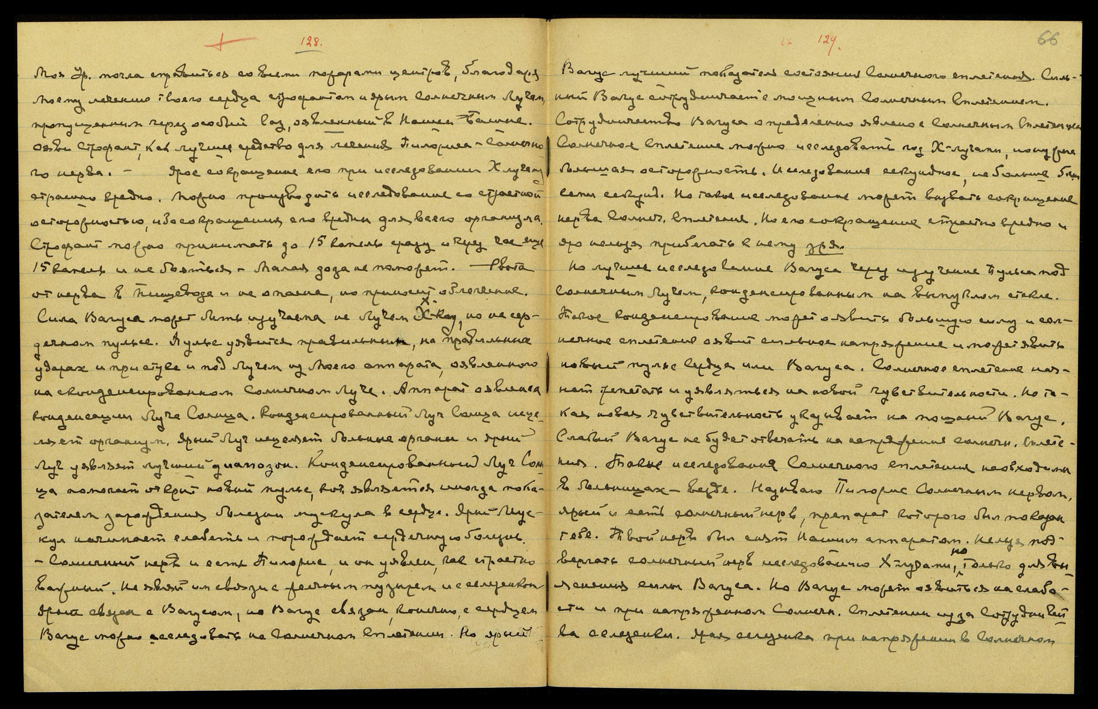 Но лучшее исследование Вагуса через изучение Пульса под Солнечным Лучом, конденсированным на выпуклом стекле. Такое конденсирование может оявить большую силу и солнечное сплетение оявит сильное напряжение и может явить новый пульс Сердца или Вагуса. Солнечное сплетение начнет трепетать и уявляться на новой чувствительности. Но такая новая чувствительность указывает на мощный Вагус. Слабый Вагус не будет отвечать на напряжение солнечного сплетения. Такие исследования Солнечного сплетения необходимы в больницах везде. Называю Пилорис Солнечным нервом. Ярый и есть солнечный нерв, препарат которого был показан тебе. Твой нерв был снят Нашим аппаратом. Нельзя подвергать солнечный нерв исследованию Х-лучами, но только для выяснения силы Вагуса. Но Вагус может оявиться на слабости и при напряженном Солнечн[ом] Сплетении из-за сотрудничества селезенки. Ярая селезенка при напряжении в Солнечном