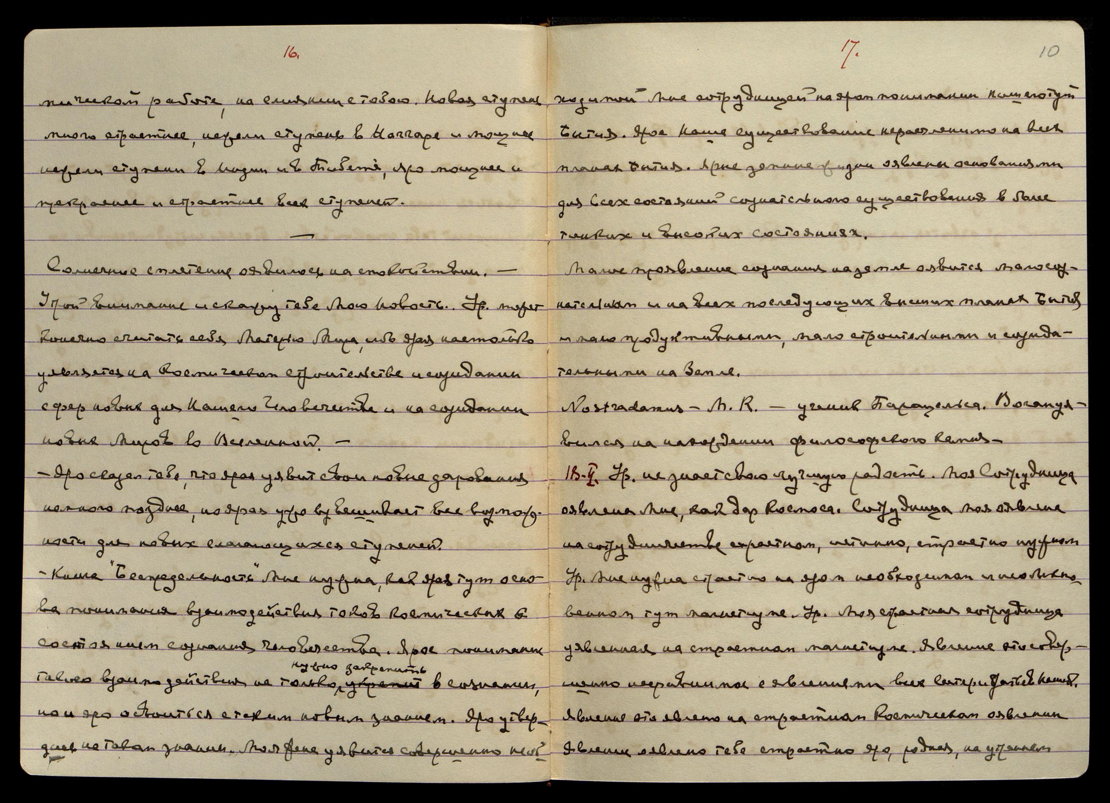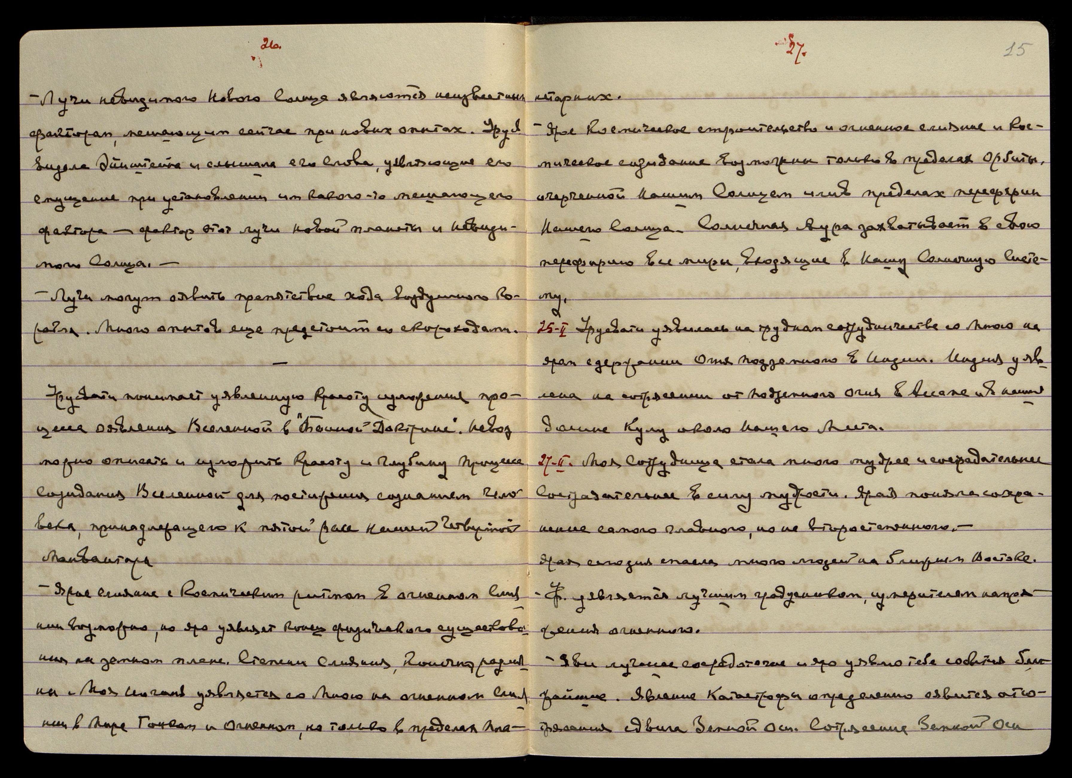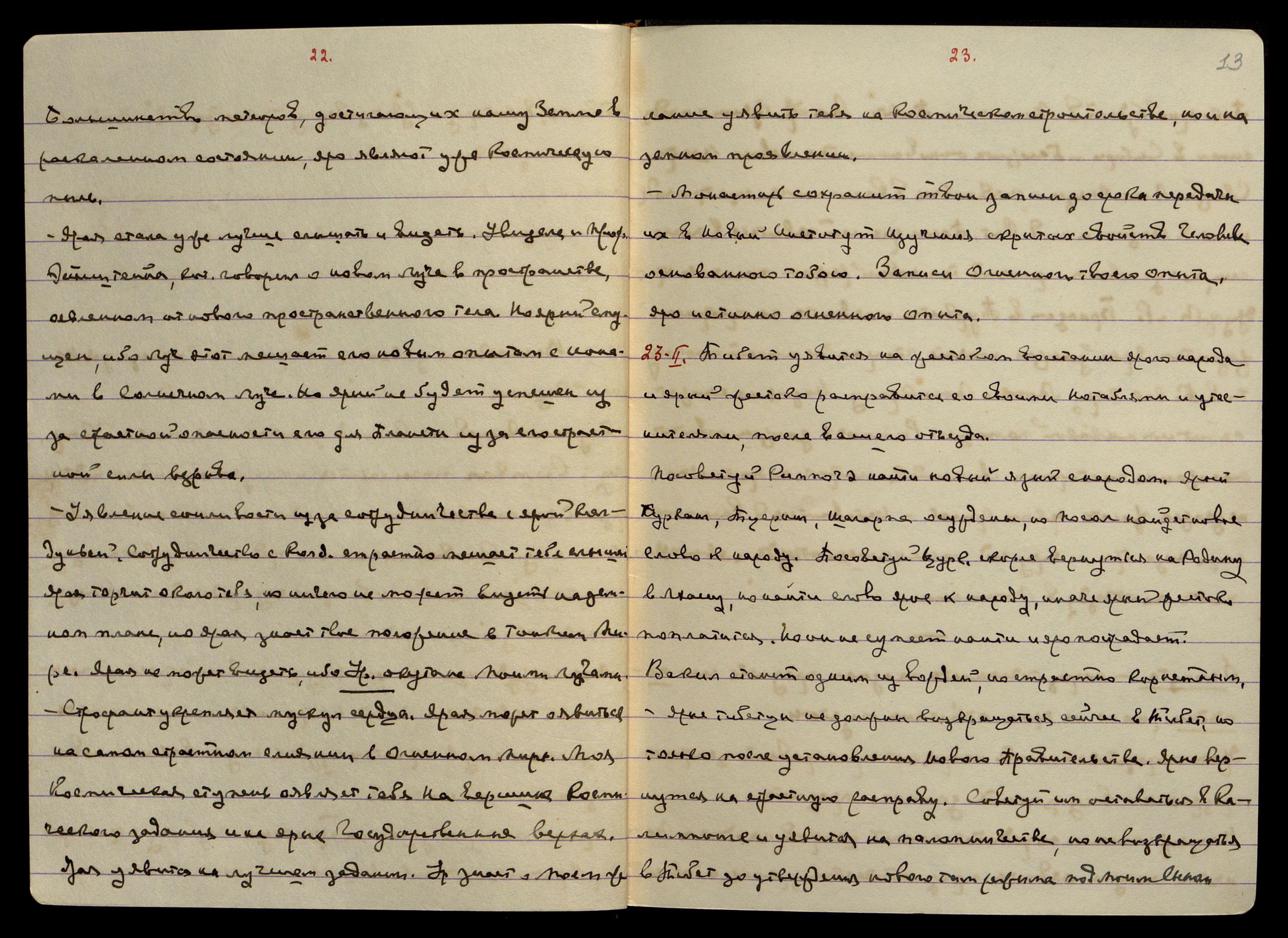 Ярая стала уже лучше слышать и видеть. Увидела и проф[ессора] Эйнштейна, который говорил о новом Луче в пространстве, оявленном от нового пространственного тела. Но ярый смущен, ибо луч этот мешает его новым опытам с ионами в Солнечном Луче. Но ярый не будет успешен из-за страстной опасности его для Планеты из-за его страстной силы взрыва.