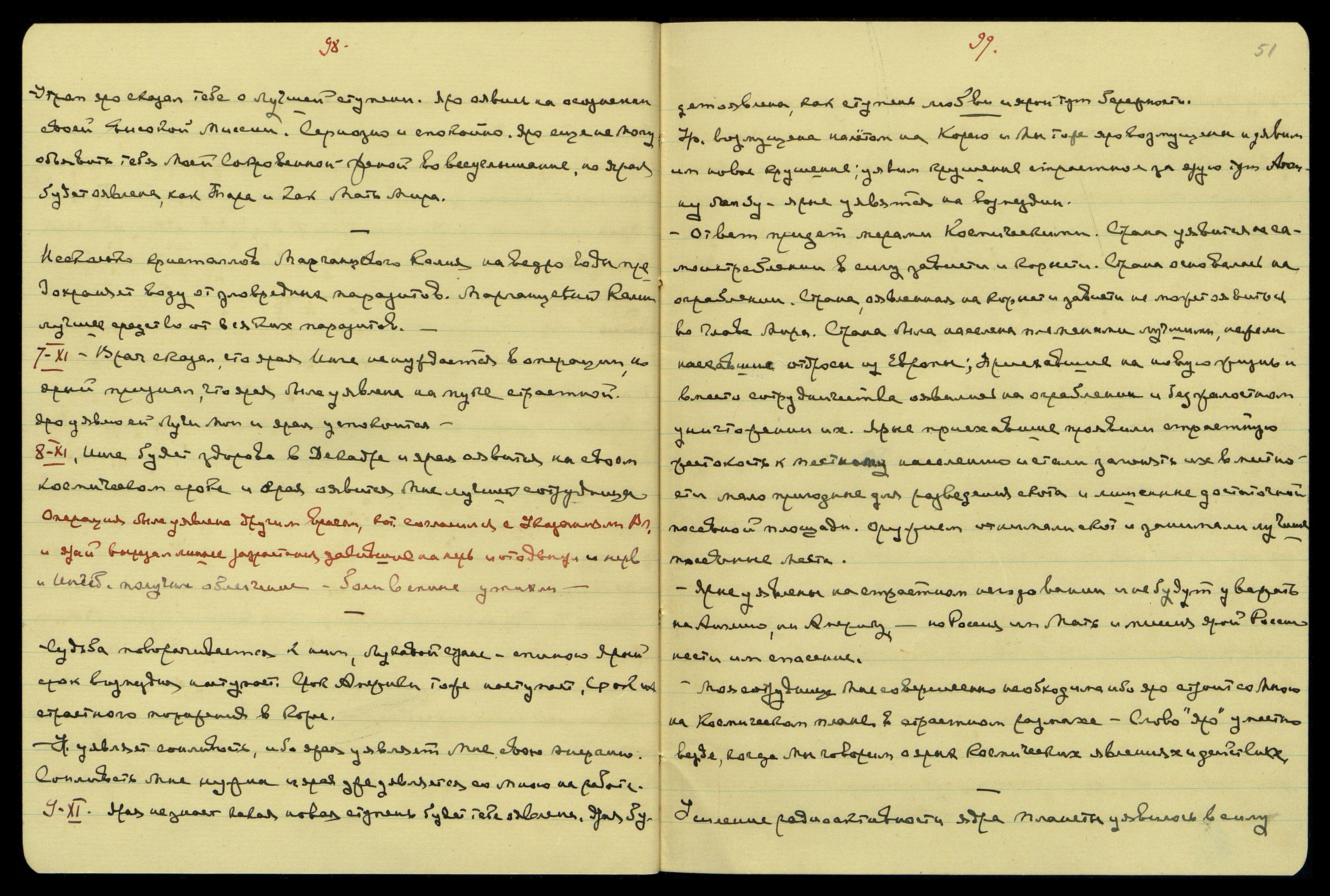 Сегодня на рассвете уявил тебе Мою страстную тоску за неизбежность катастрофы на Западе и за ярые разрушения во всех странах и в Р[оссии] из-за идущих восстаний. Разрушения из-за интриг Англ[ии] и Америки.