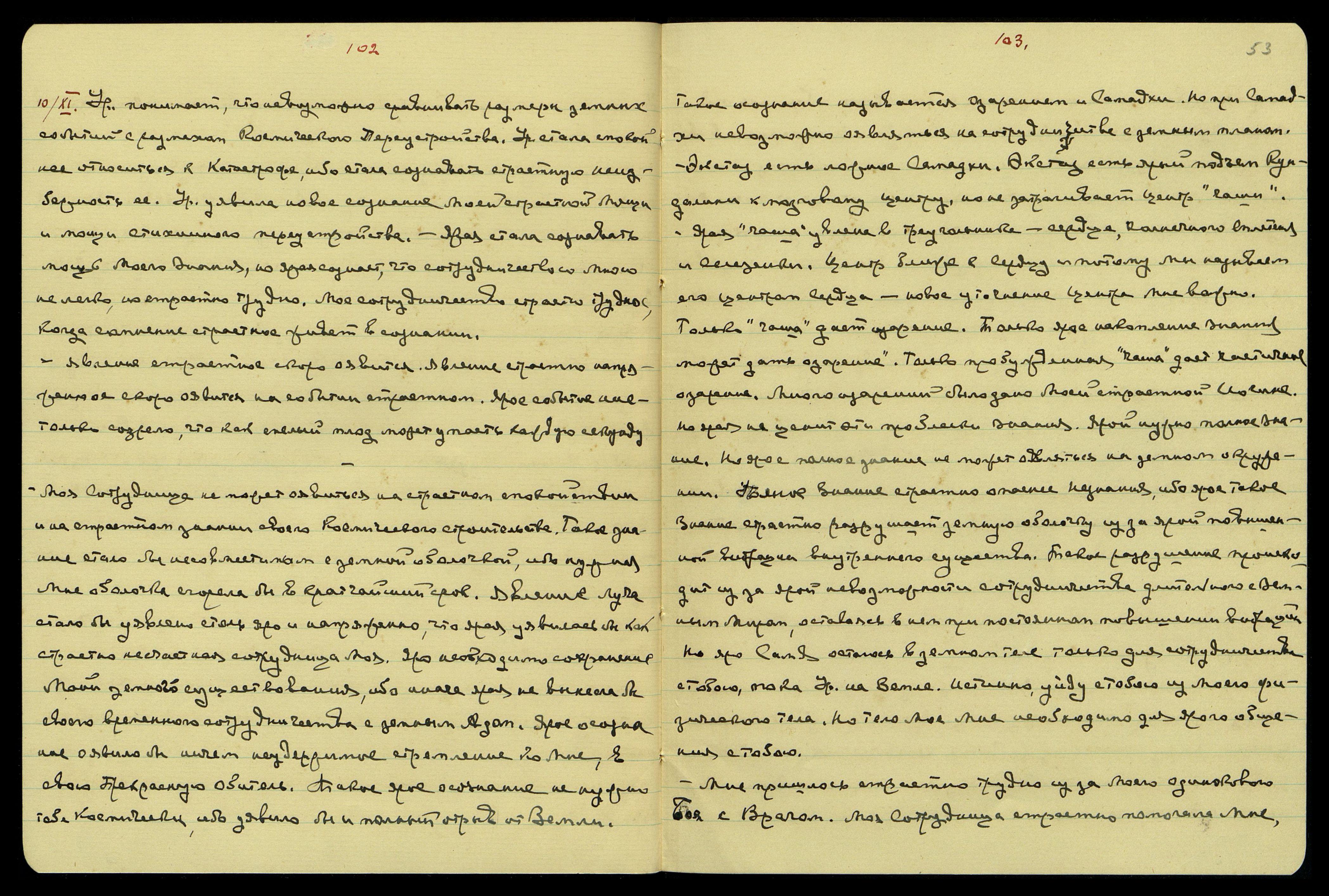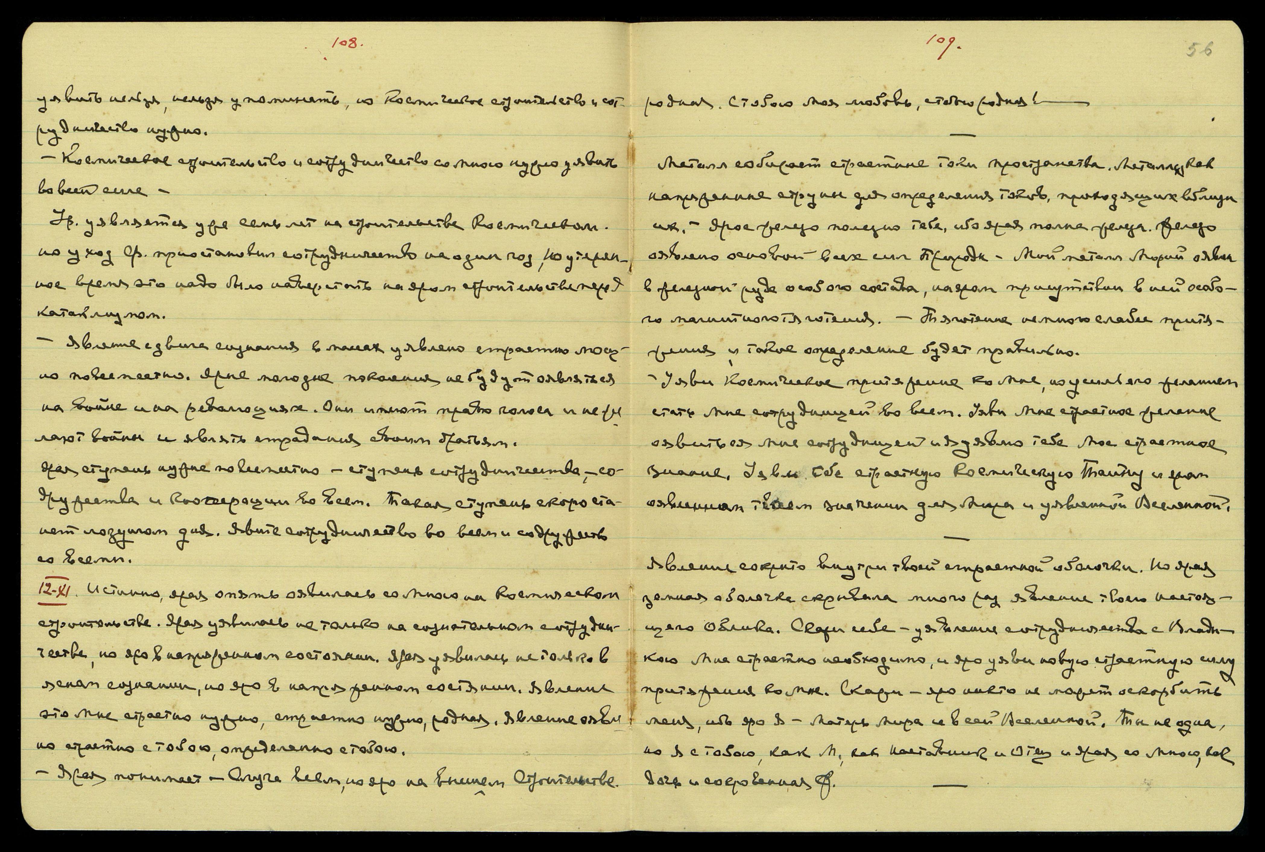 12-XI. Истинно, ярая опять оявилась со Мною на Космическом строительстве. Ярая уявилась не только на сознательном сотрудничестве, но яро в напряженном состоянии. Ярая уявилась не только в ясном сознании, но яро в напряжённом состоянии. Явление это Мне страстно нужно, страстно нужно, родная. Явление оявлено страстно с тобою, определенно с тобою.