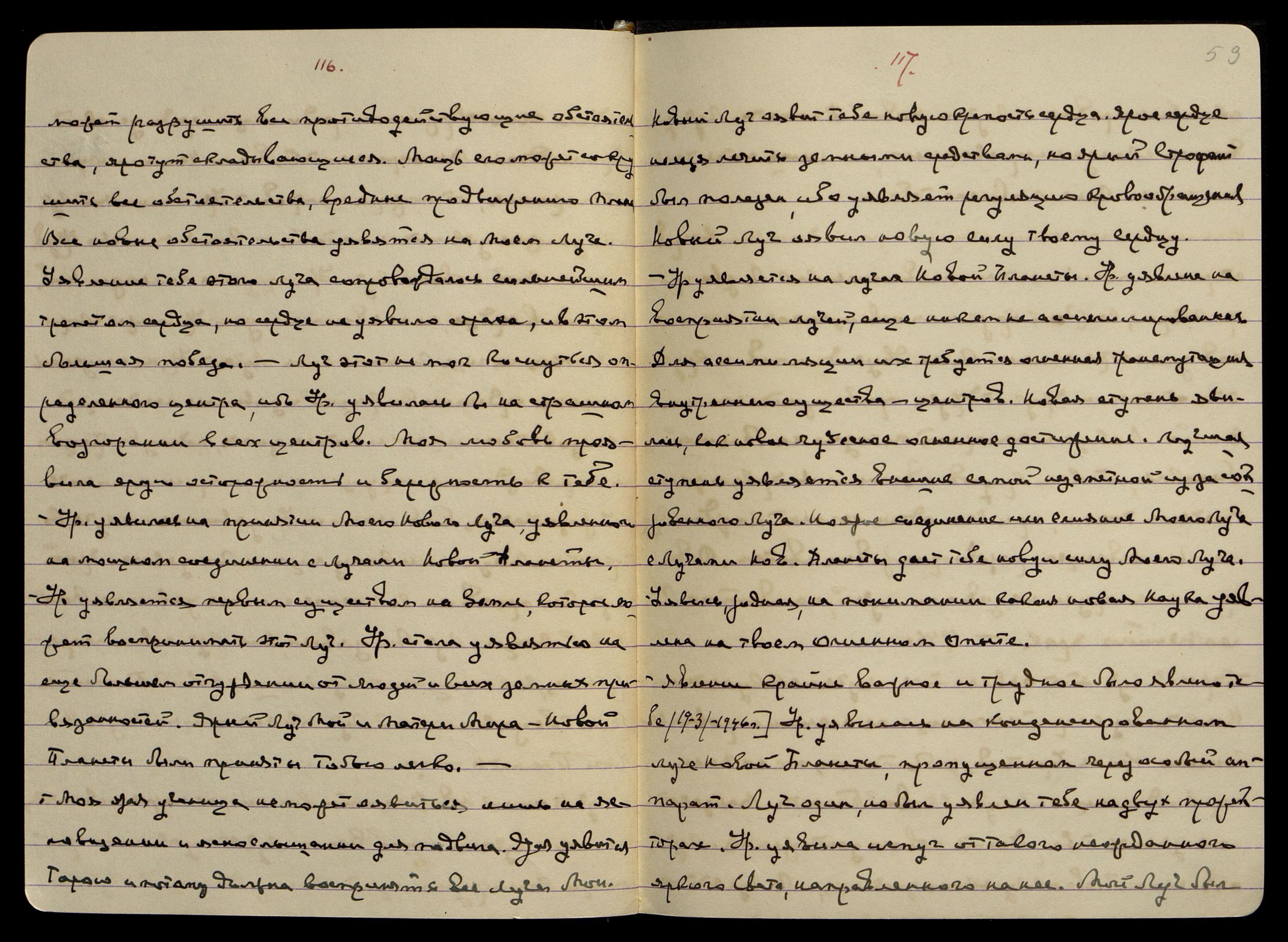 Красота Луча Нов[ой] Планеты уявляется в его особом свойстве сохранять сознание при полетах в высоких междупланетных сферах. Моя Страна уявится на ярости таких лучей и станет лучшей страной. Новая Планета уявится скоро в своей новой видимости в яркой красоте лучей. В декабре уже явится на приближении большем и лучи ее будут являть как бы сияние над горизонтом. Страна Моя станет новой страной под Лучами Новой Планеты.