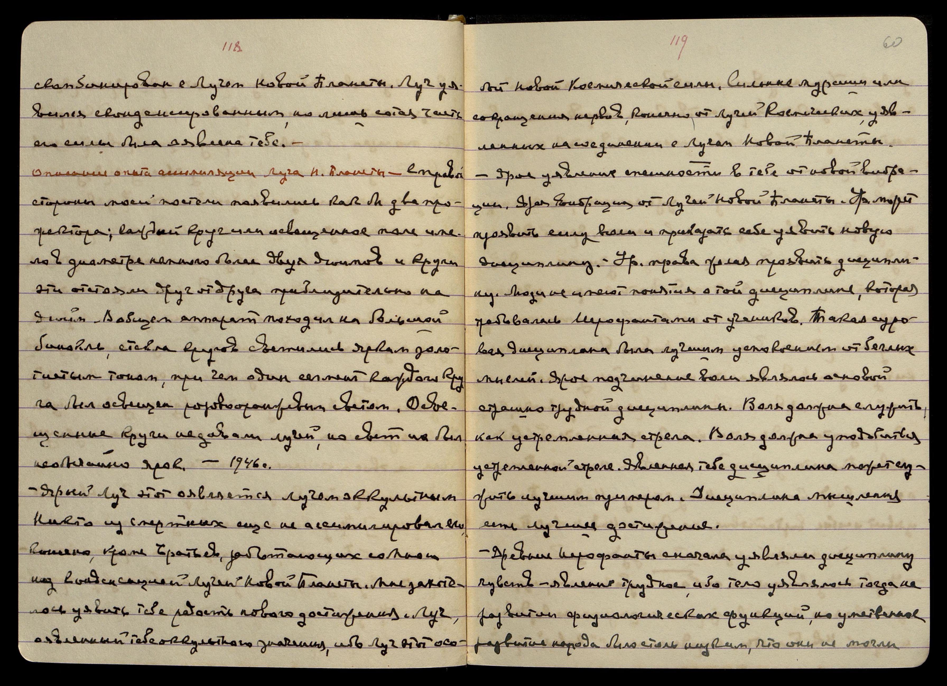 Описание опыта ассимиляции Луча Н[овой] Планеты. С правой стороны моей постели появились как бы два прожектора; каждый круг или освещённое поле имело в диаметре немного более двух дюймов и круги эти отстояли друг от друга приблизительно на дюйм. В общем аппарат походил на большой бинокль, стекла кругов светились ярким золотистым тоном, причем один сегмент каждого круга был освещен розово-оранжевым светом. Освещенные круги не давали лучей, но свет их был необычайно ярок. 1946 г[од].
