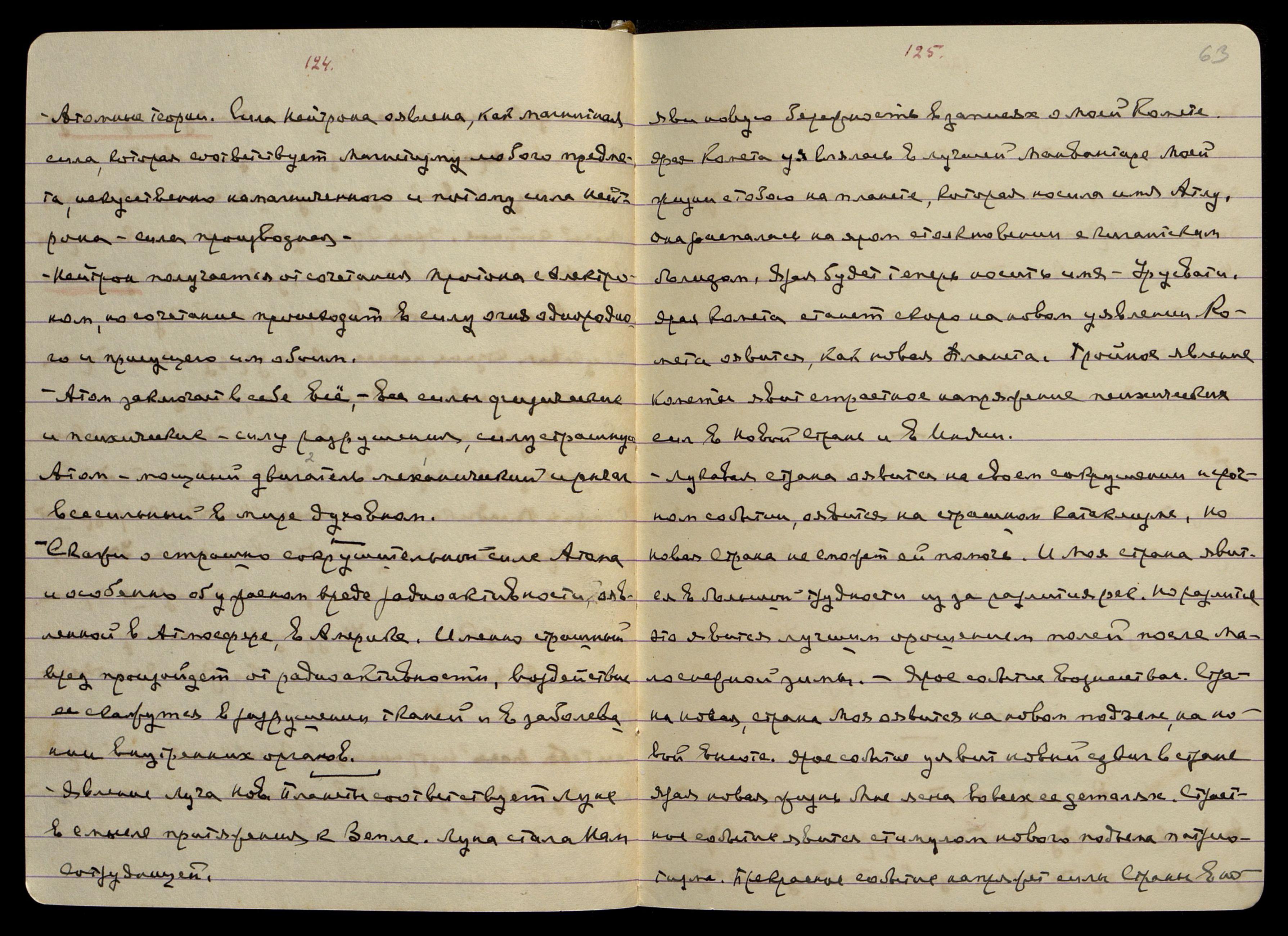 Атом заключает в себе всё, − все силы физические и психические − [силу созидательную и] силу разрушения, силу страшную. Атом − мощный механический двигатель и рычаг всесильный в мире духовном.