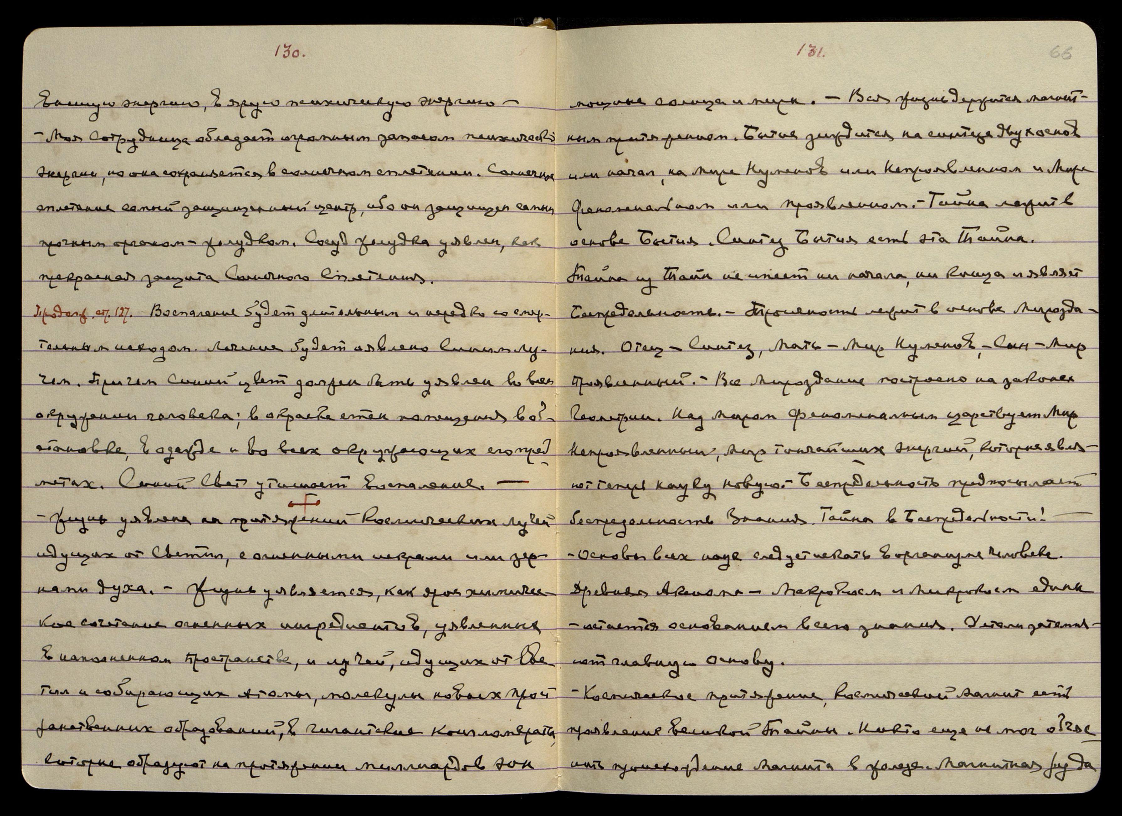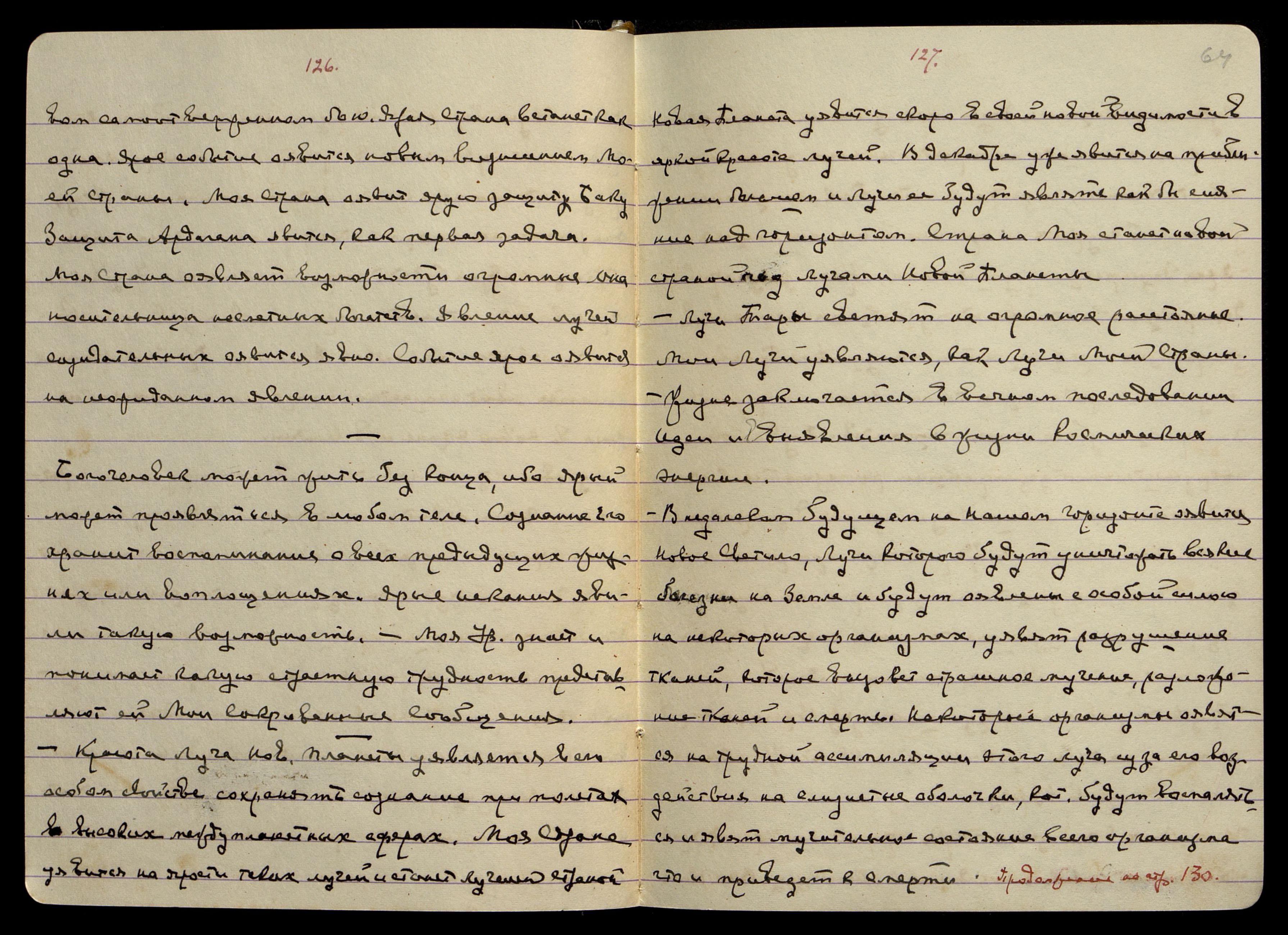 В недалёком будущем на нашем горизонте оявится Новое Светило, Лучи которого будут уничтожать всякие болезни на Земле и будут оявлены с особой силою на некоторых организмах, уявят разрушение тканей, которое вызовет страшное мучение, разложение тканей и смерть. Некоторые организмы оявятся на трудной ассимиляции этого луча из-за его воздействия на слизистые оболочки, кот[орые] будут воспаляться и явят мучительное состояние всего организма, что и приведет к смерти. Продолжение на стр. 130.