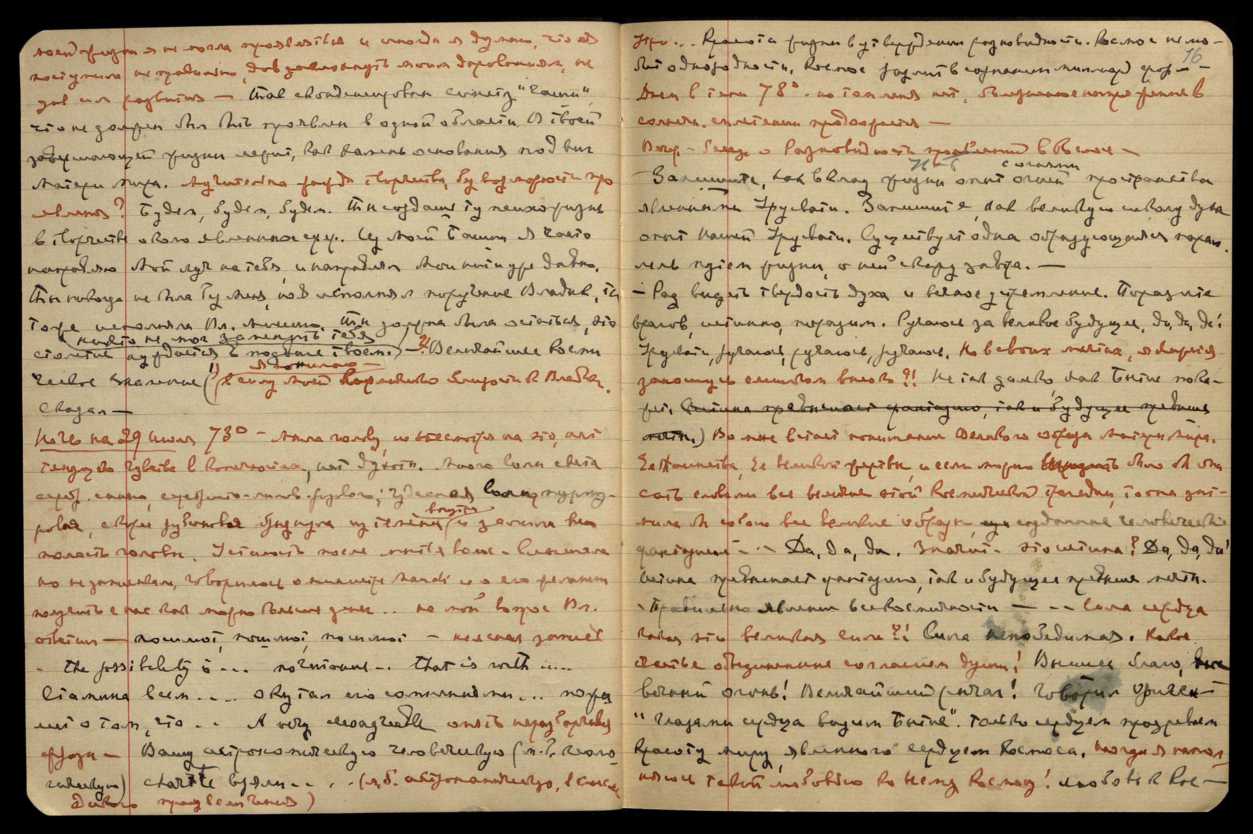Ночь на 29 июля. 73°. Мыла голову, но несмотря на это, нет тянущего чувства в конечностях, нет духоты. Много волн света серебр[исто]-синего, серебристо-лил[ово]-розового; чудесная волна пурпуровая, скорее, рубиновая, брызнула из темени внутри и залила всю полость головы. Усталость после мытья волос. Слышала, но не записывала, говорилось о министре Mandi и о его желании получить с нас как можно больше денег... На мой вопрос Вл[адыка] ответил: "Пошлют, пошлют, пошлют". Неясная запись. "The possibility [англ.: возможность]... почитание... that is will [англ.: это будет]... Стамина всем... окутал его сомнениями... пожалеет о том, что... A very disagreeable [англ.: очень неприятный]", − опять неразборчивая фраза. "Вашу астрономическую человеческую (м[ожет] б[ыть], геологическую) [одно слово неразборчиво] взяли... (м[ожет] б[ыть], астрономическую, в смысле дикого преувеличения).