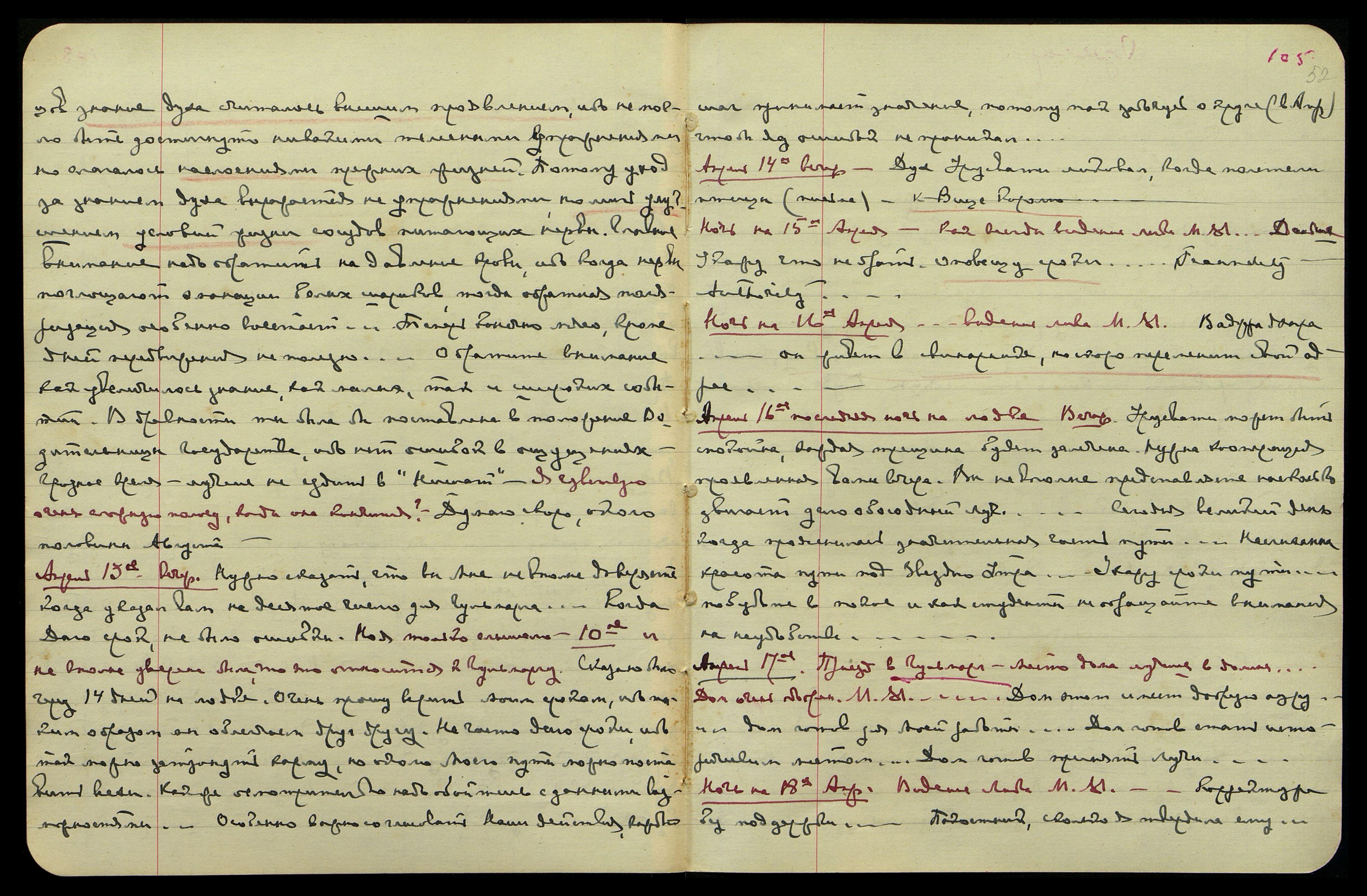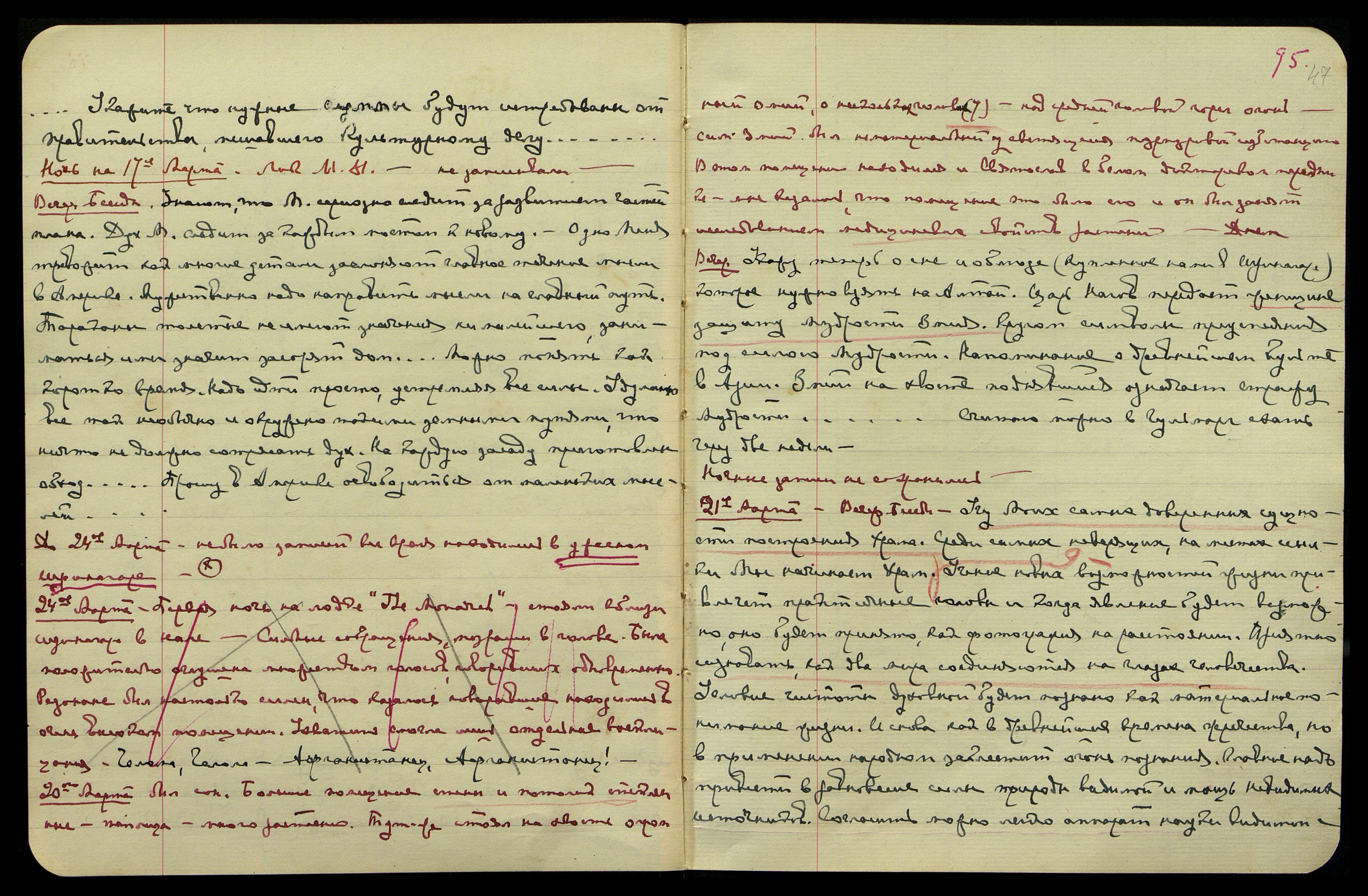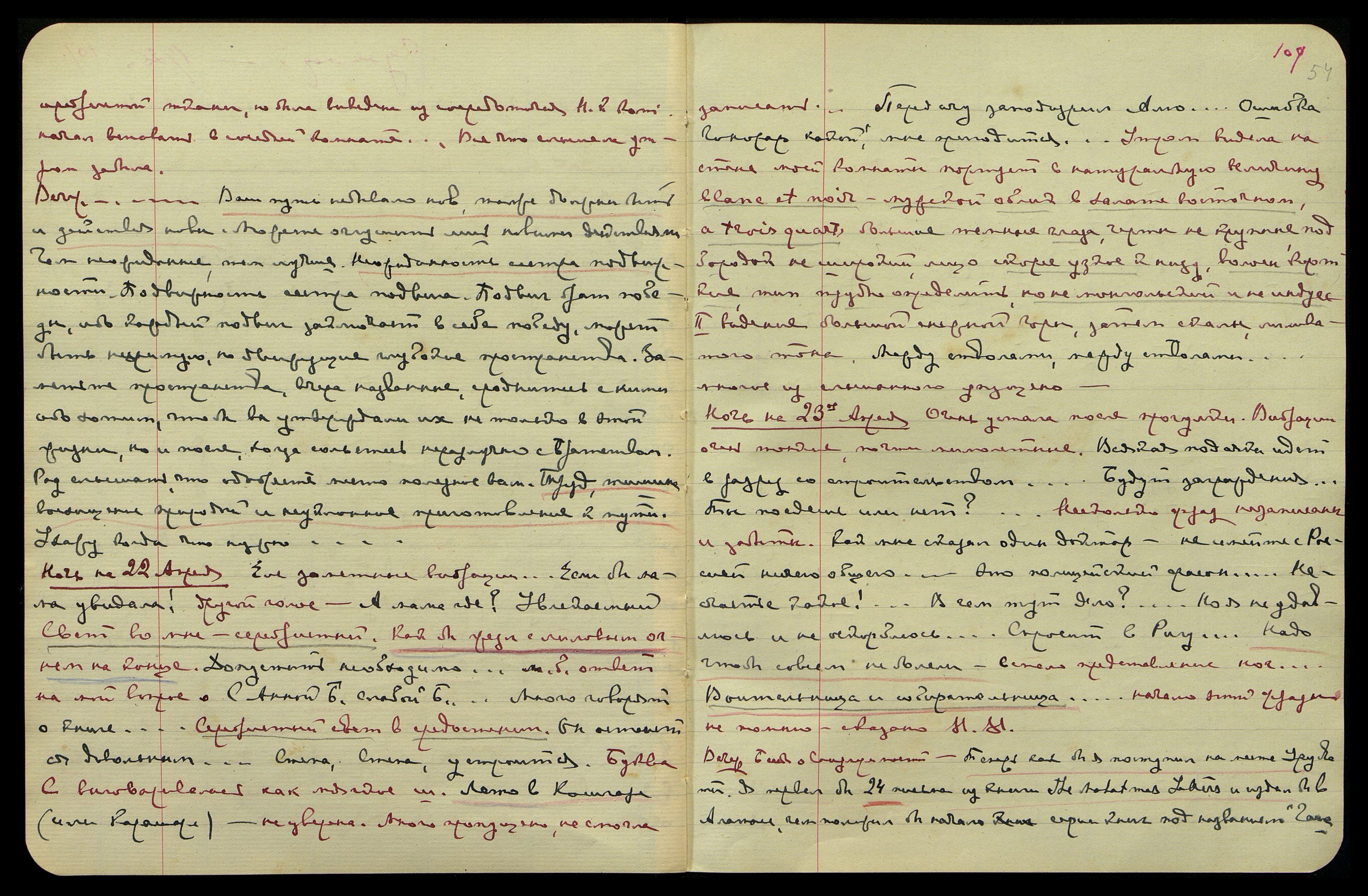 Ночь на 22-ое апреля. Еле заметные вибрации. "Если бы мама увидала!" Другой голос: "А мама где?Увлекаемый". Свет во мне − серебристый. Как бы жезл с лиловым огнём на конце. "Допустить необходимо..." − может быть, ответ на мой вопрос о*... "С Анной Б. славой Б... Много говорят о книге..." Серебристый свет в средостении. "Он остался довольным... Стёпа, Стёпа, устроится". Буква выговаривалась, как мягкое "ш". "Лето в Кашгаре** (или Карашаре)", − не уверена. Много пропущено, не смогла записать. "Передачу заподозрил Алю... Ошибка гонорар какой! Мне пригодится..."