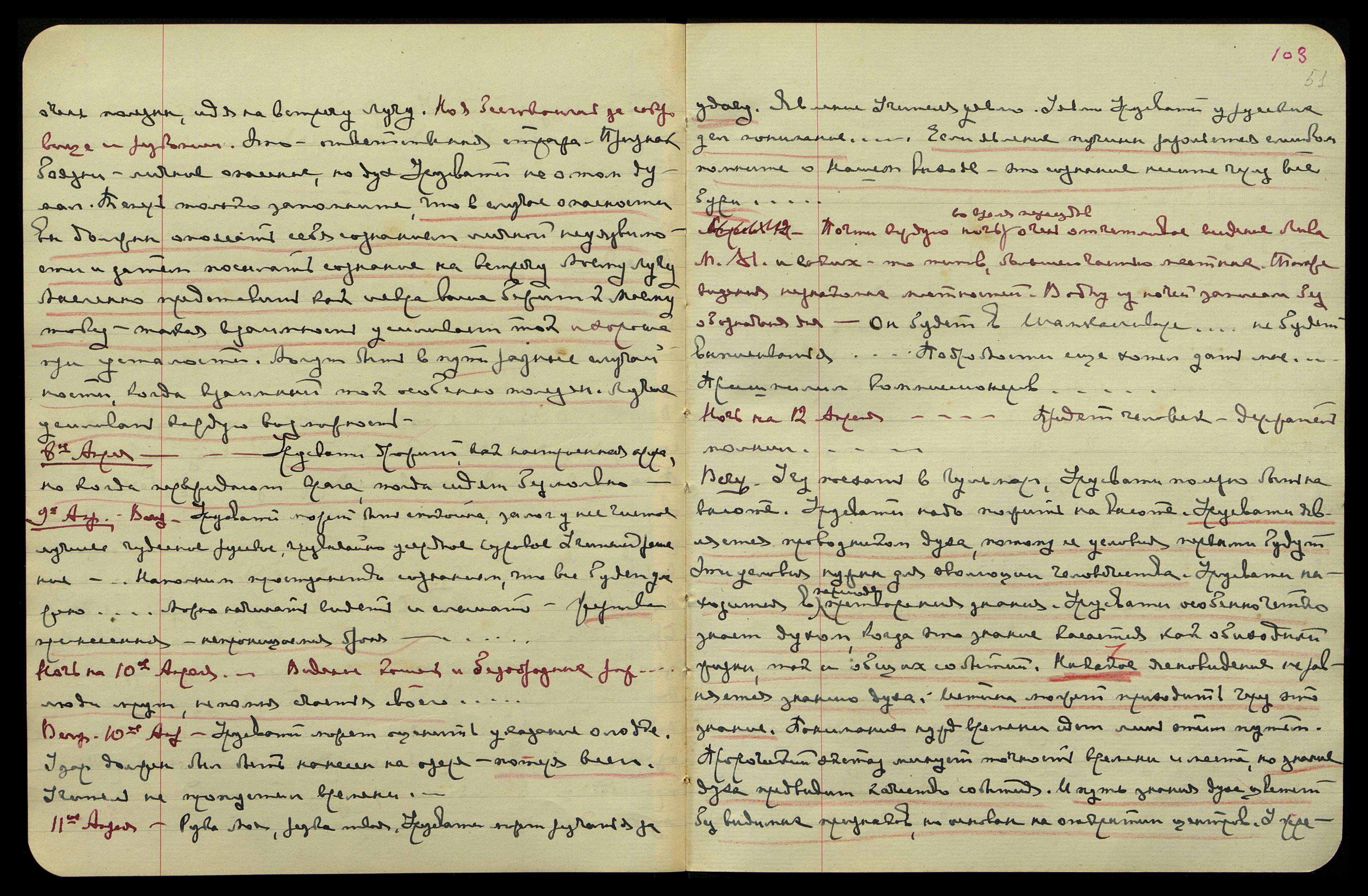 Ночь на 4-ое апреля. Сон: Н[иколай] К[онстантинович] и я сидим как бы в пустыне, ко мне слетает орёл и, прижав крылья, старается спрятать свою голову мне подмышку. Я знаю, что он ищет защиты и хочет укрыться.