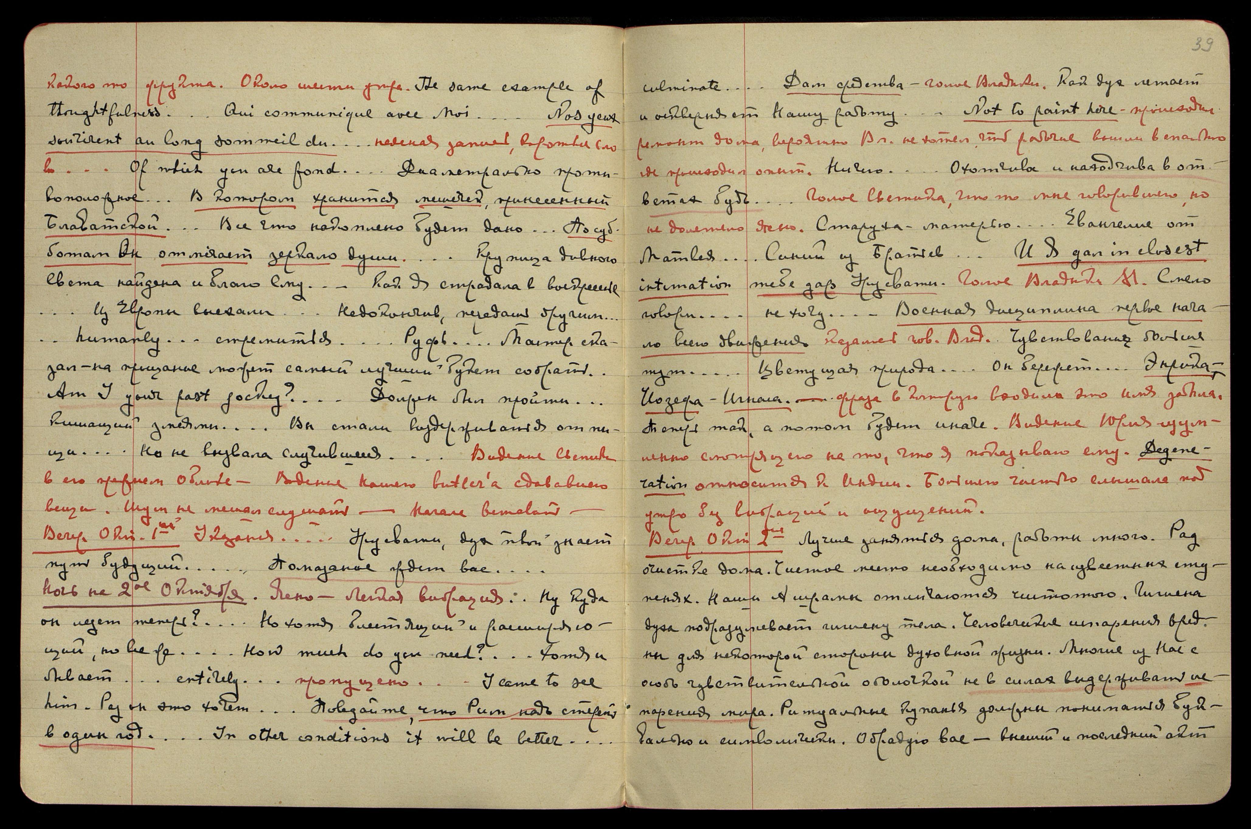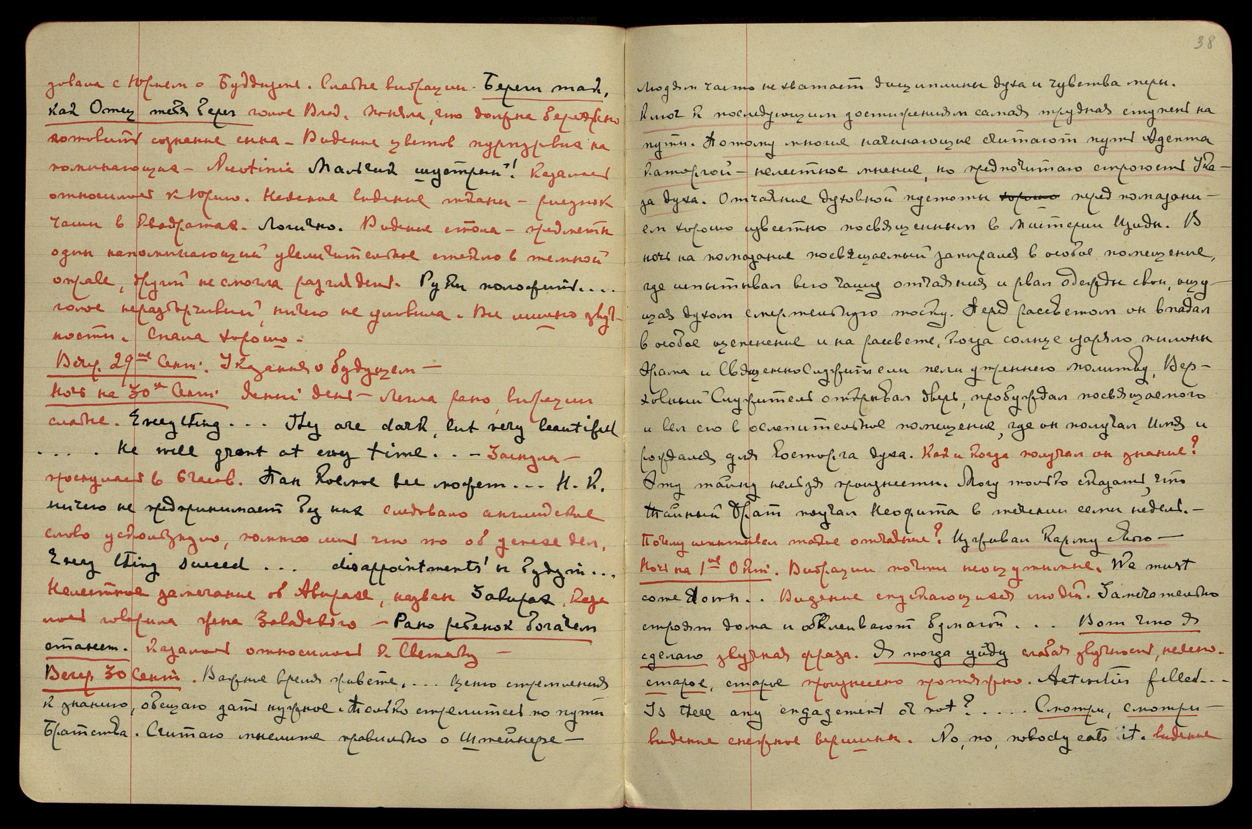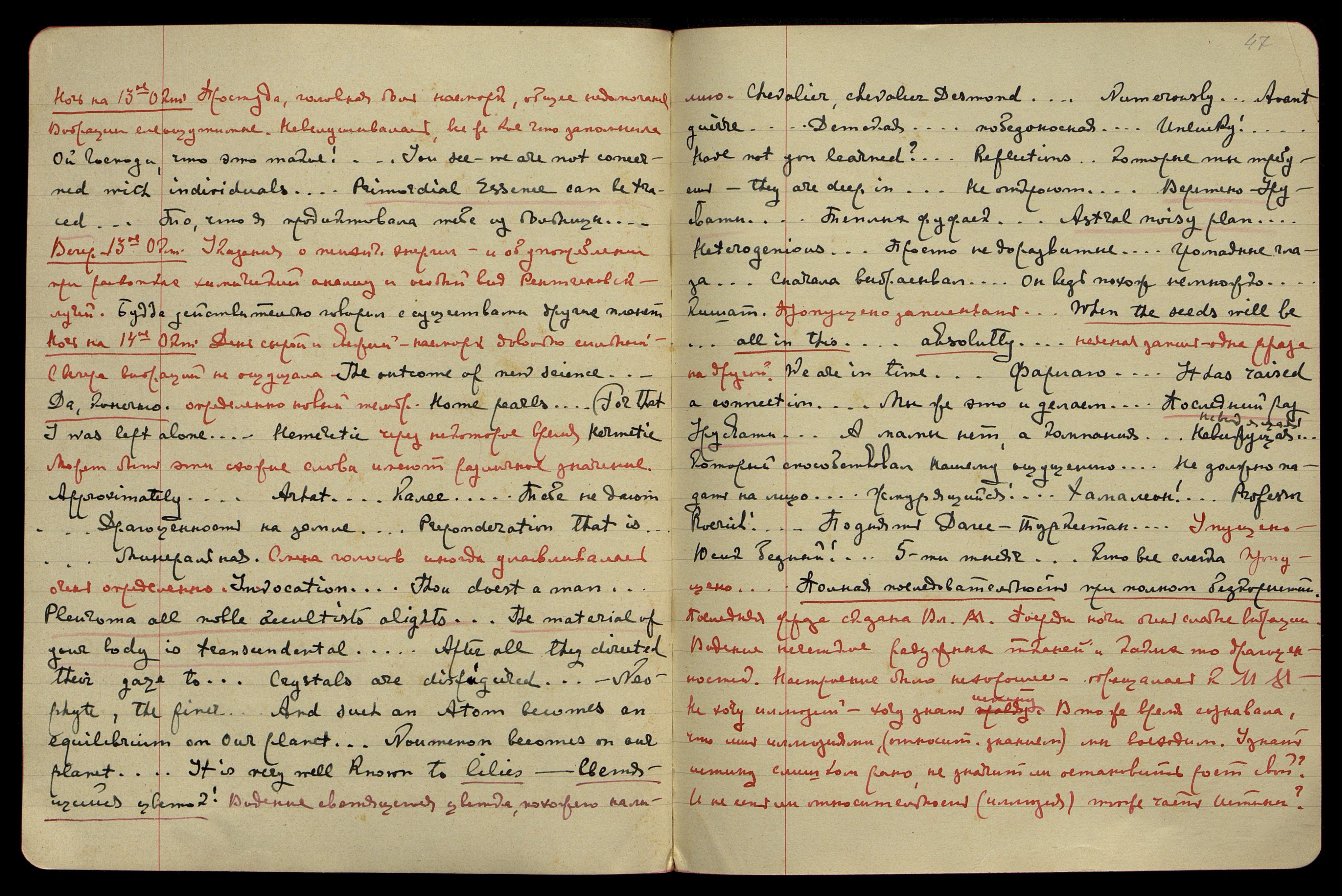 Ночь на 30-ое сент[ября]. Ясный день. Легла рано, вибрации слабые. "Everything... They are dark, but very beautiful... He will grant at any time [англ.: Всё...Они тёмные, но очень красивые... Он даст согласие в любое время]..." Заснула, проснулась в 6 часов. "Пан космос всё может... Н[иколай] К[онстантинович] ничего не предпринимает без них", − следовало английское слово, ускользнуло, помню лишь что-то об успехе дел. "Everything succeed... disappointmentsꞋы [англ.: Всё удаётся... разочарования] будут..." Нелестное замечание об Авирахе, назван: "Завирах". Казалось, говорила жена Завадского. "Рано ребёнок богачом станет", − казалось, относилось к Светику.