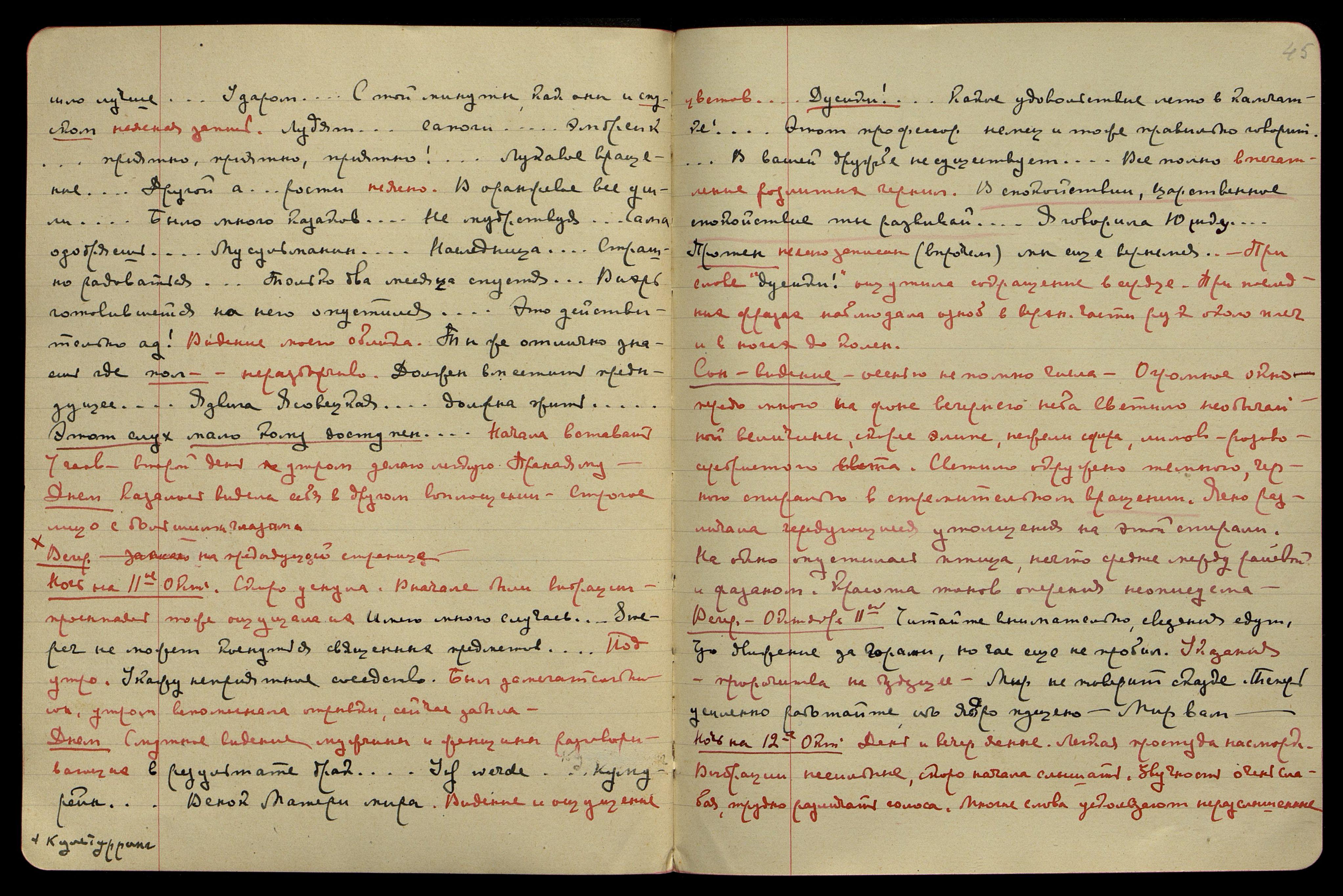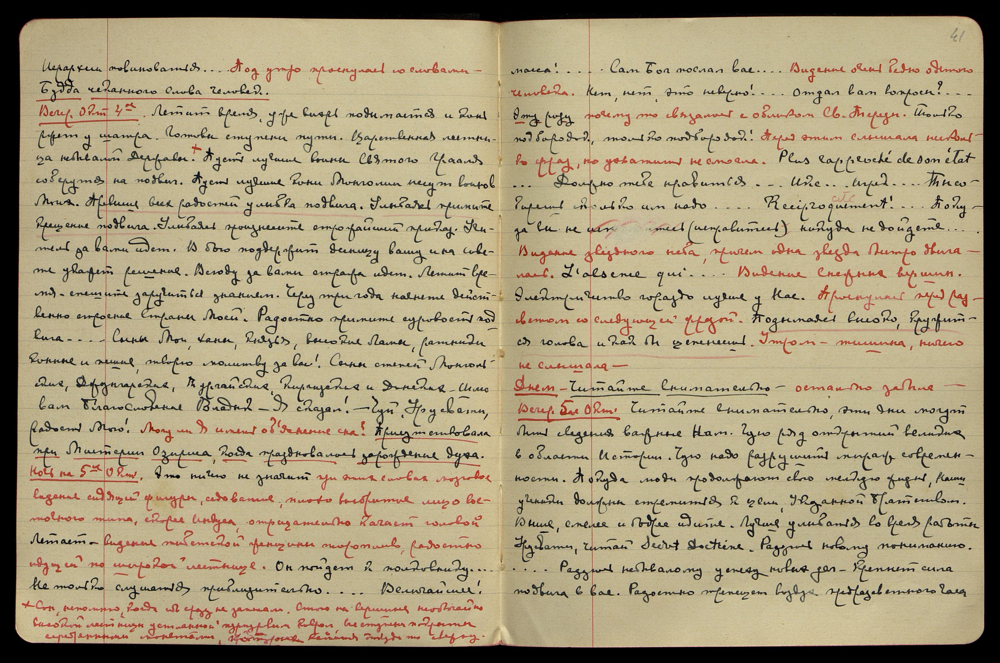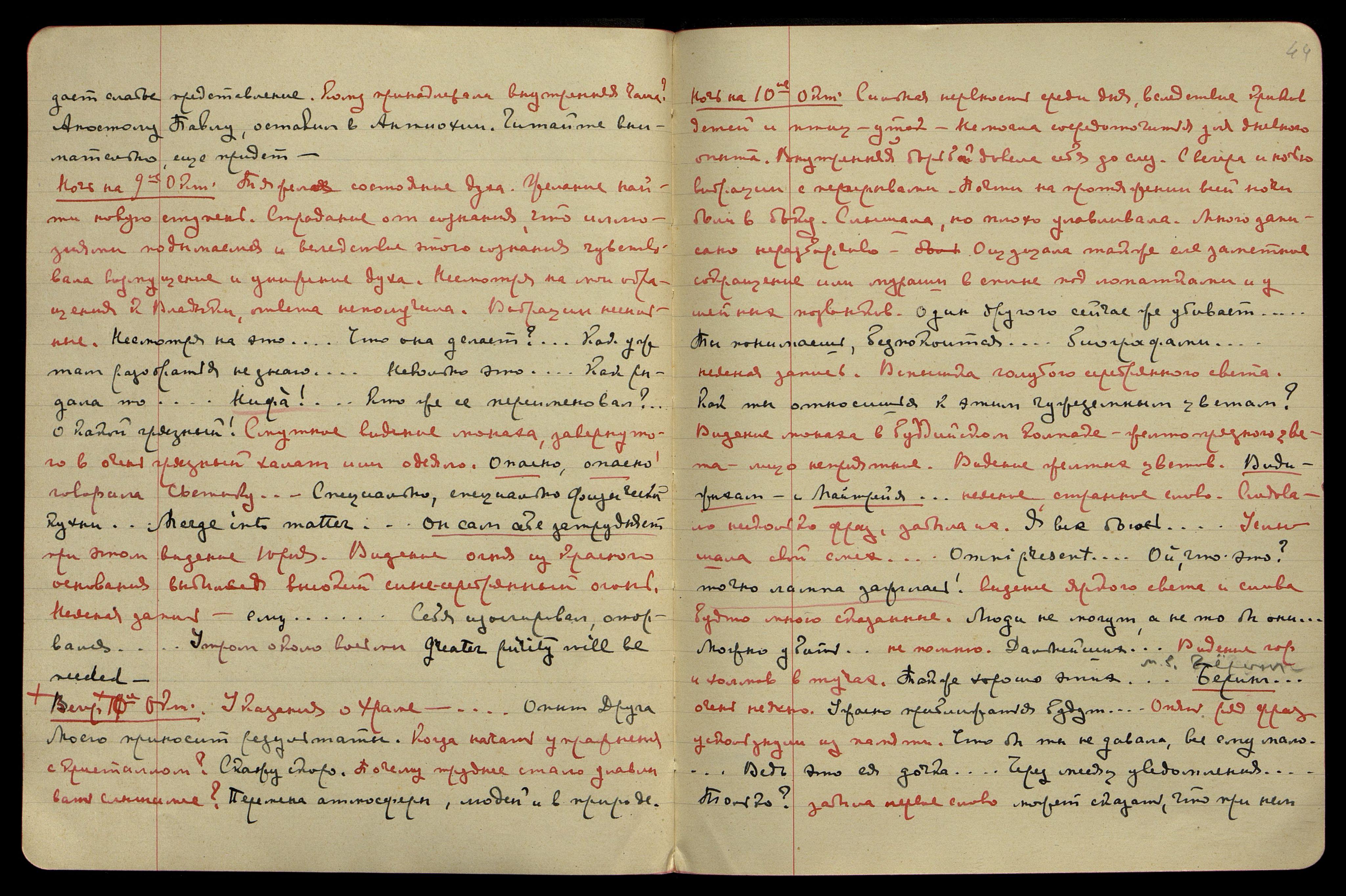 шло лучше... Ударом... С той минуты, как они и спуском", − неясная запись. "Лудят... сапоги... эмбреик... приятно, приятно, приятно!.. Лукавое вращение... Другой а... расти", − неясно. "В оранжевое все ушли... Было много казаков... Не мудрствуя... Сама одобряешь... Мусульманин... Наследница... Страшно радоваться... Только два месяца спустя... Вихрь готовившейся на него опустился... Это действительно ад!" Видение моего облика. "Должен вместить предыдущее... Ядвига Ясовецкая... должна жить... Этот слух мало кому доступен..." Начала вставать [в] 7 часов − второй день утром делаю легкую Пранаяму.