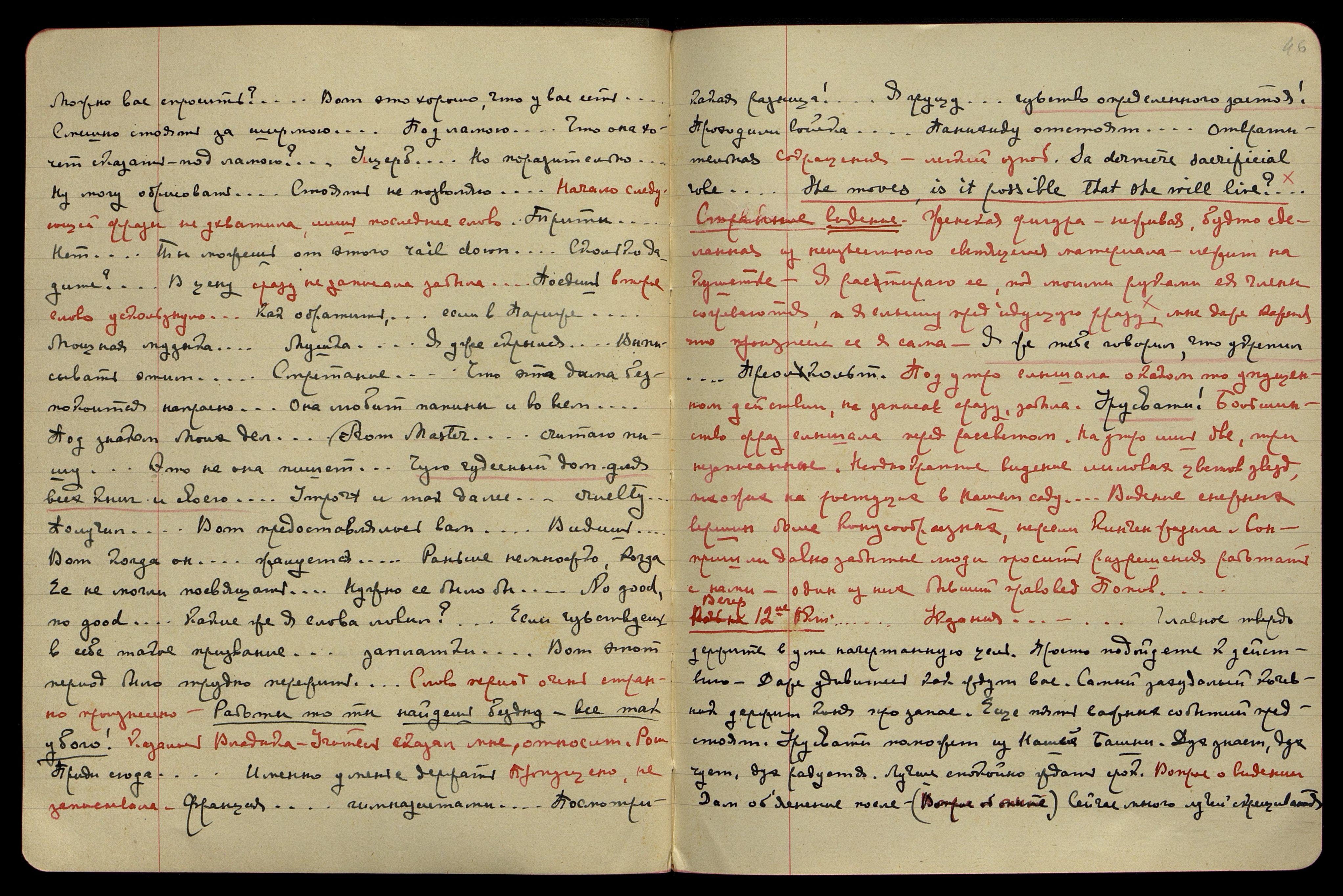 Ночь на 6-ое окт[ября]. Лёгкая, еле заметная вибрация. "Отделению любви − любви Чайтория − Квалео − А в пневматическом... О тополь, о Тирос... clear ever continued [англ.: ясно, когда-либо продолжалось]... Не пустим их, пойдет стрела!.. Час пробил, никаких анимозити*... Merey... Гаугер... Destitute of generous feeling [англ.: Лишённый благородных чувств]... Тетрагамма, тетрагон... Хотела, чтоб меня забыл весь мир... Урусвати, видеть по-старому... I am a little bit like you russians [англ.: Я немного похож на вас, русских]... Всё ожесточённое уменье должно пройти... The King − Dictil [англ.: Король − Диктил]... Худая слава бежит, хорошая − лежит... This material, unsubstantial... resign [англ.: Этот материал, несущественный... подайте в отставку]..." За исключением четырёх − пяти слов, всё слышала под утро, многое ускользнуло.