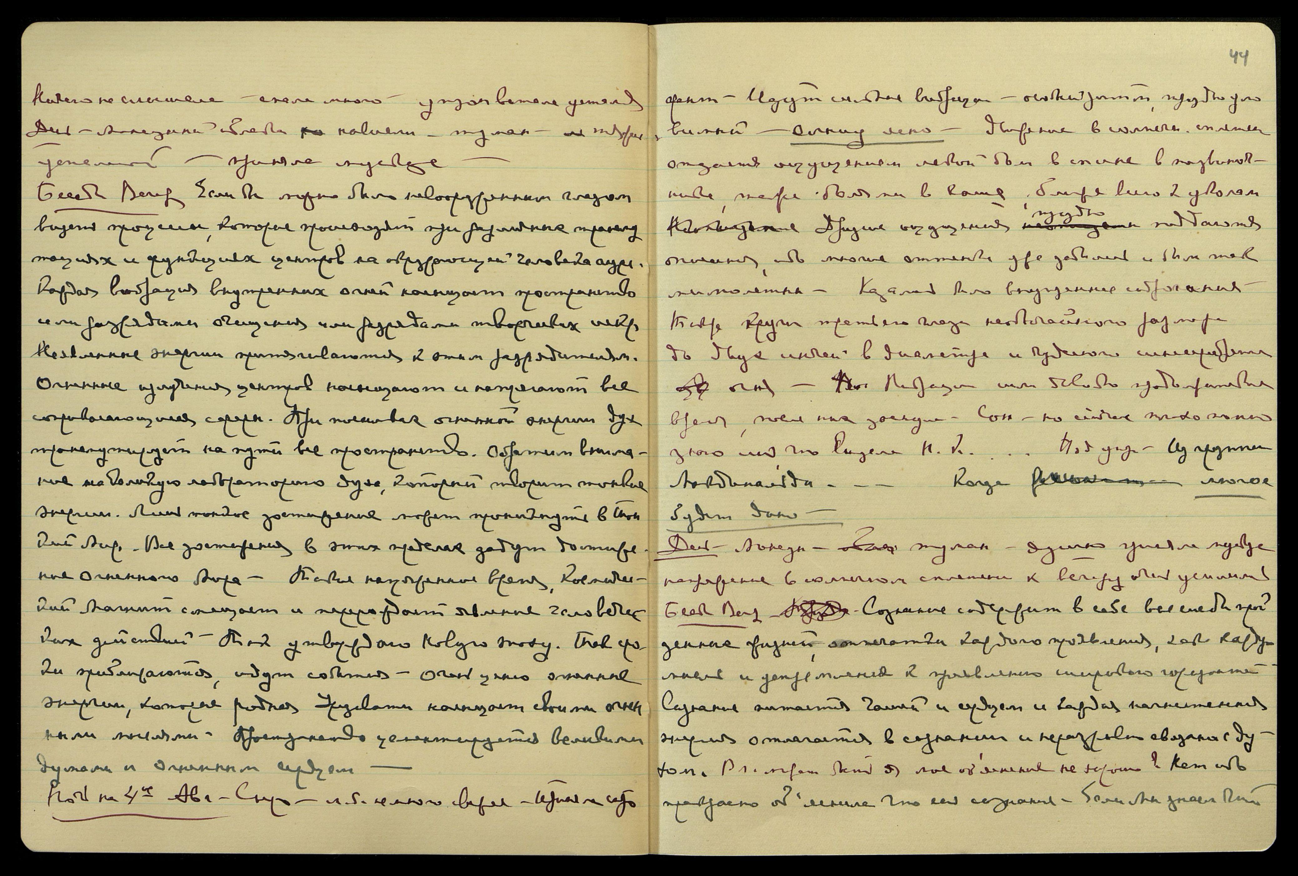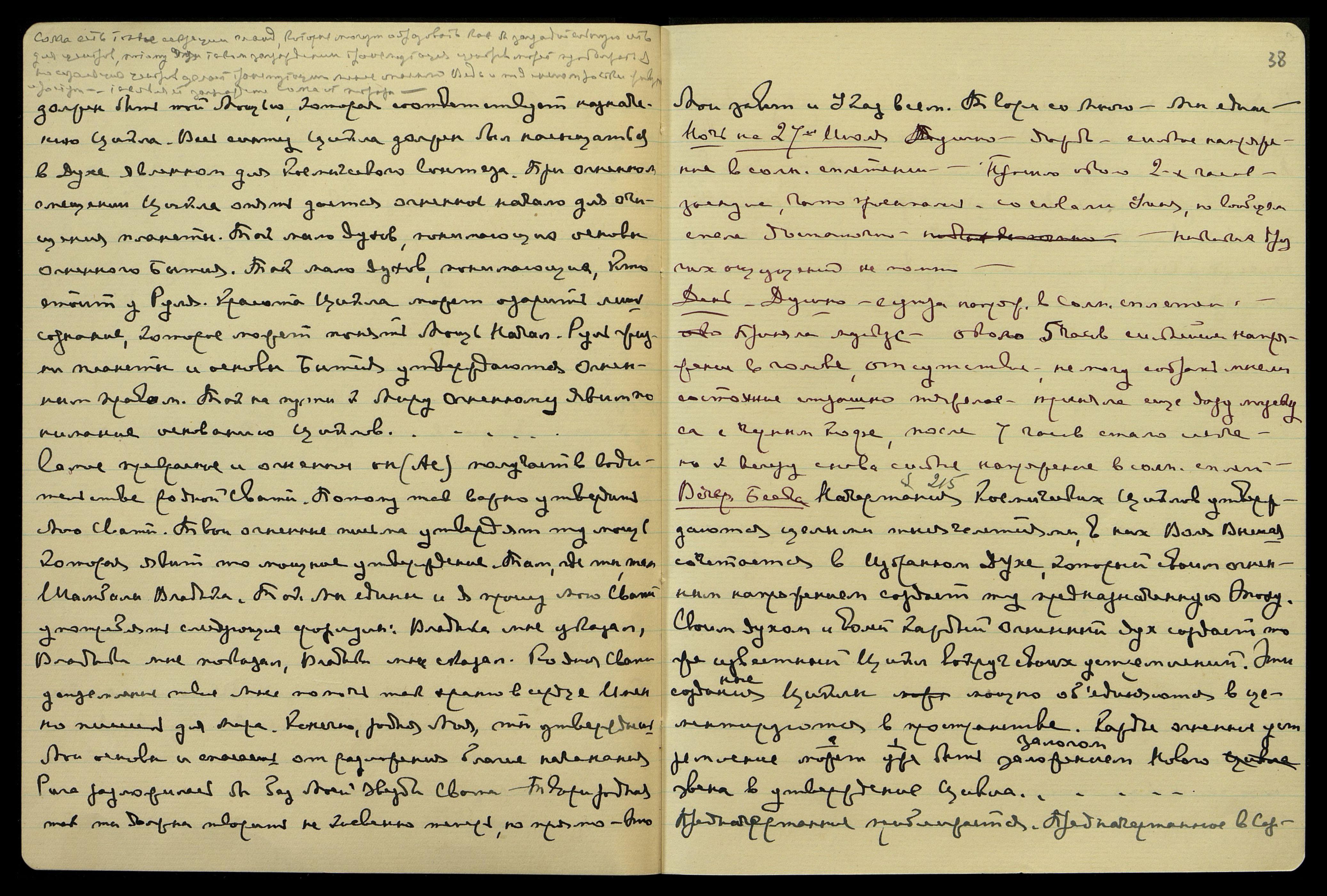 Ночь на 30-е июля. Сильное возбуждение, приняла строфант. Сна нет. Напряжение в солнечном сплетении. Яркие синие с серебром огни колеблющиеся как бы под вихрем. Яркие [одно слово неразборчиво] пятна синего цвета. Слышу много, частично записала. "Дело в шляпе... Конечно, Я, − ответ. − О, какой ужас! Нам важно, чтобы основание было направлено... Потом там была такая история!... Квазимода... Моя пломба меня пугает... Ты жена Моя..." Заснула в пятом часу, около пяти, проснулась около семи, снова заснула, встала усталая. Приняла мускус.