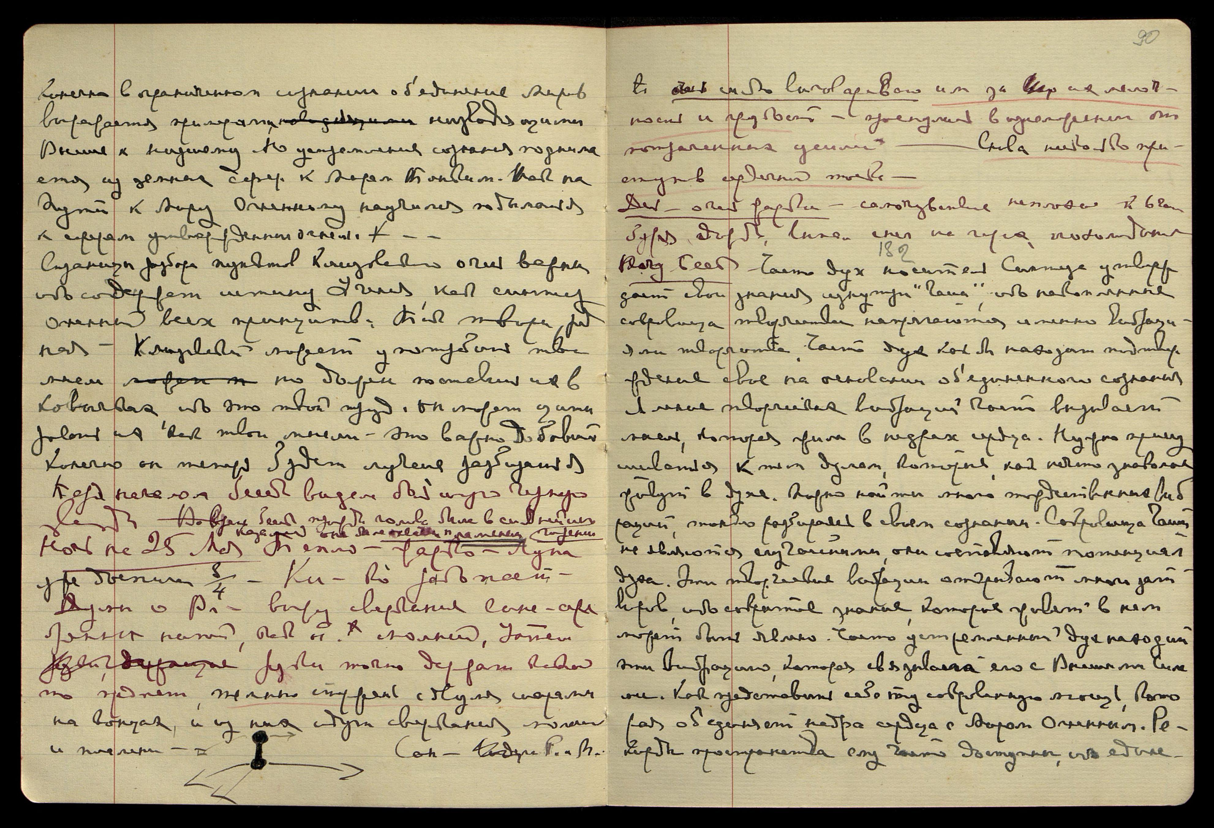 Ночь на 25-е мая. Тепло, жарко, луна уже достигла 3/4. Ки-Ко работает. Думы о Вл[адыке], вижу сверкания сине-серебряных нитей, как бы молний. Затем руки точно держат какой-то предмет, тёмный стержень с двумя шарами на концах, и из них струи сверкания молний и пламени.