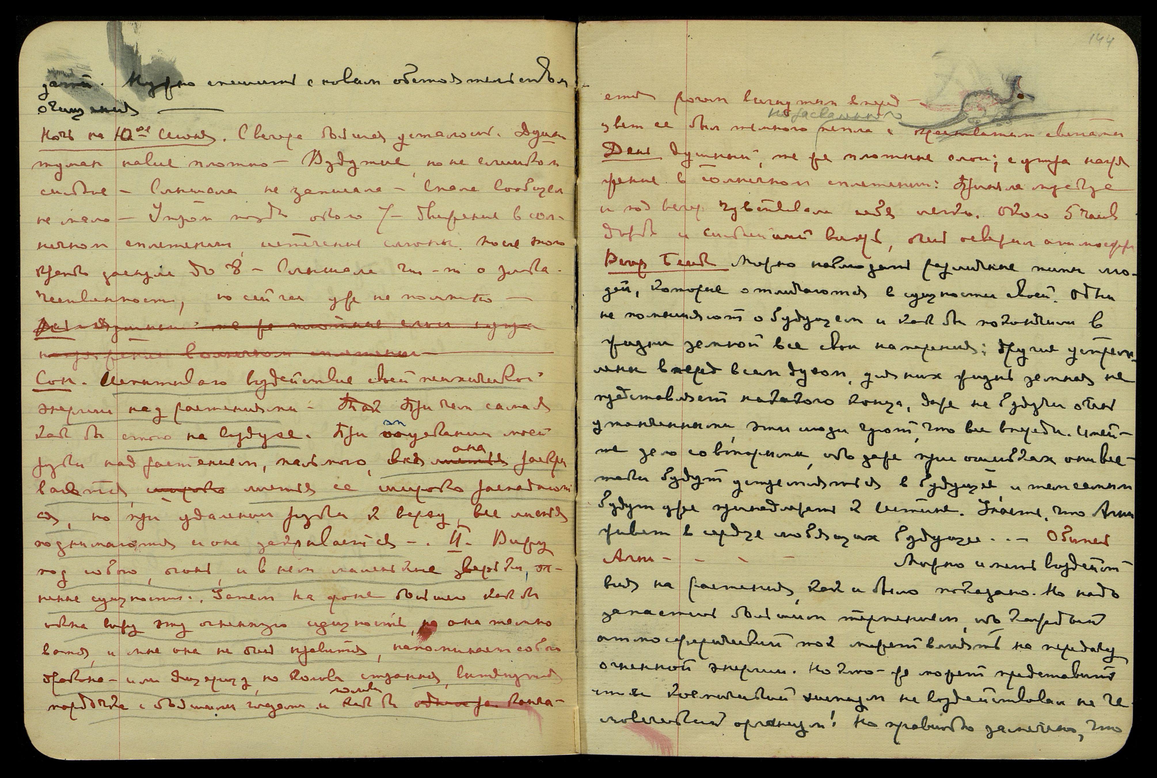 Ночь на 13-е июня. Ясно, тепло, сна нет, слегка горят ноги. Вспышки звездочек светлых, также красные пятна. "Ходатайствовать... Как же это так?!... Все полны насекомыми..." Видение цветов лилий, думы были о цветах и чем помочь их лучшему росту... "Нафталин..." Сокращение в ноге... "Не потонула ли?... злобный, злобный!... Раюшка, поедем в Москву... Дождя больше не будет... они почувствуют себя... Лиссабон!..." Видение Н.К. быстро шагающего в саду по направлению к Северу. "Гиндустриоза... Пусть подгнивает, мне то что!... Степан Степанович... Призовите к пониманию... Масик, это ты?... Ужасно мне, ужасно, ужасно! Доминго. Калагия... Не будут поддерживать Россию!..." Видение гор − синие, снежные вершины, между ними лилово-серая тучка... "То, что легло в основание сионизма, произведет переворот..." Неразборчивые записи... Почти всю ночь не спала, лишь в шестом часу задремала.