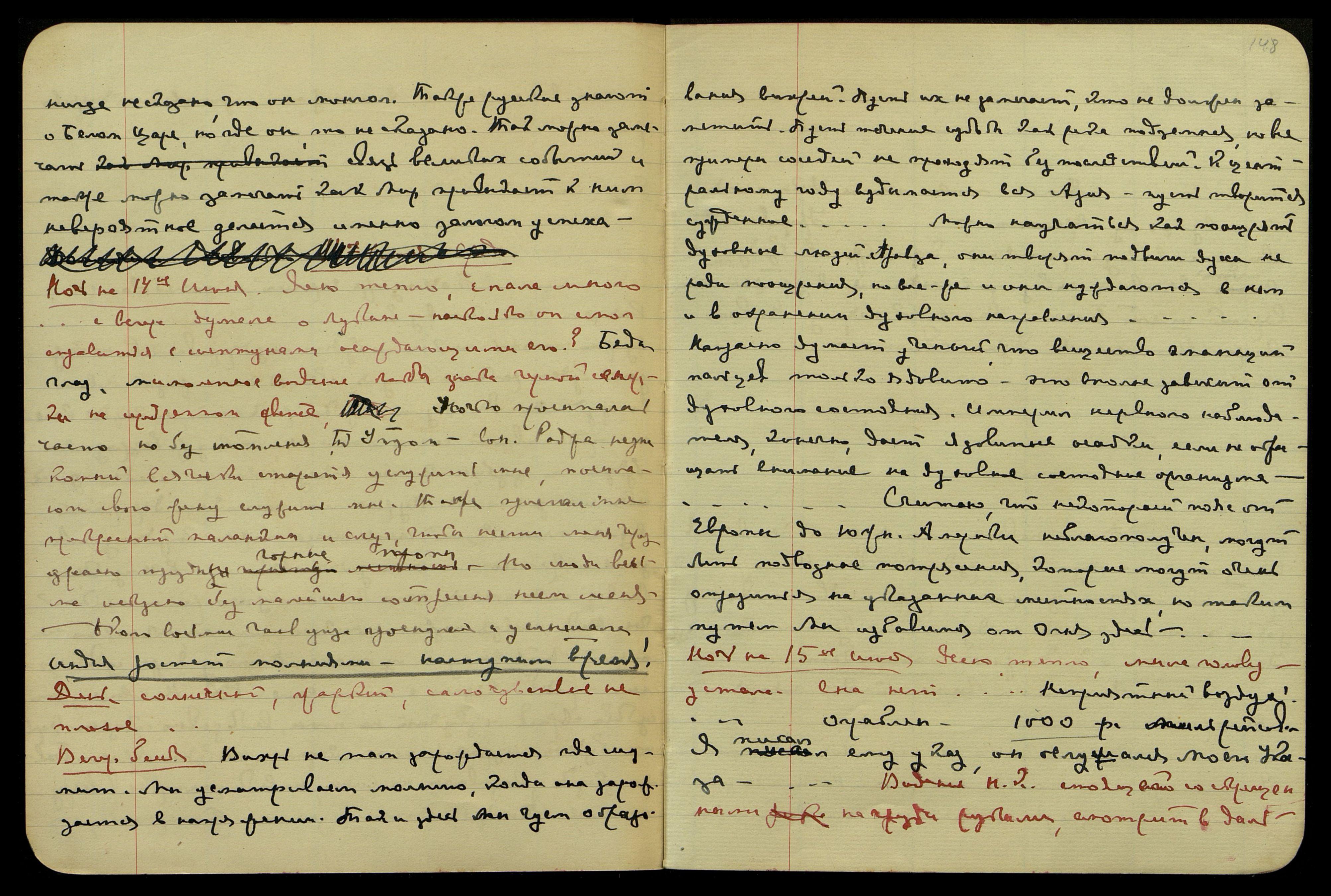 Ночь на 15-е июня. Ясно, тепло, мыла голову, устала, сна нет... "Неприятный воздух!... Ограблен... 1000 ф. миль рейсовый. Я писал ему указ, он ослушался Моего Указа..." Видение Н.К., стоящего со скрещенными на груди руками, смотрит в даль.