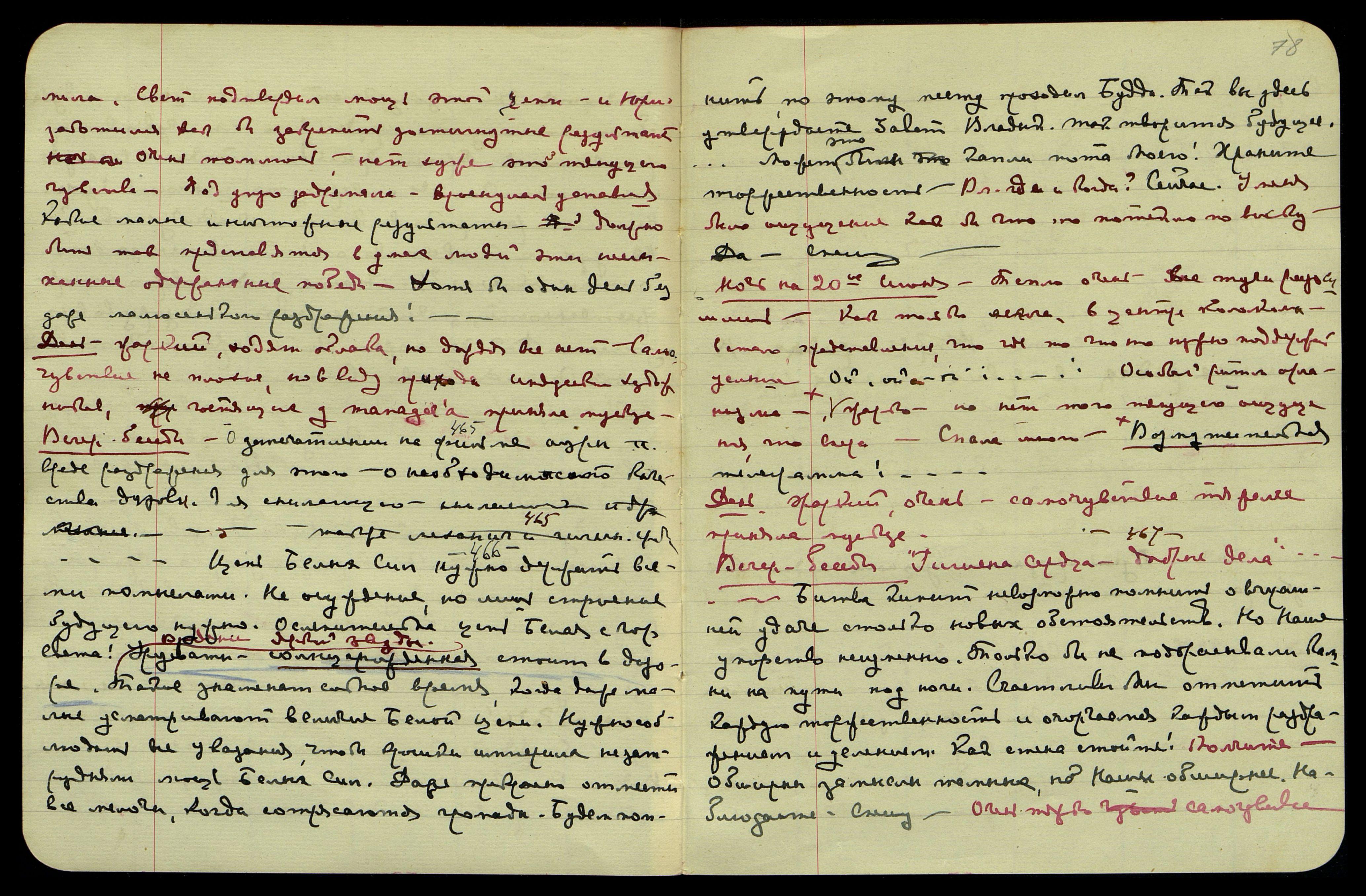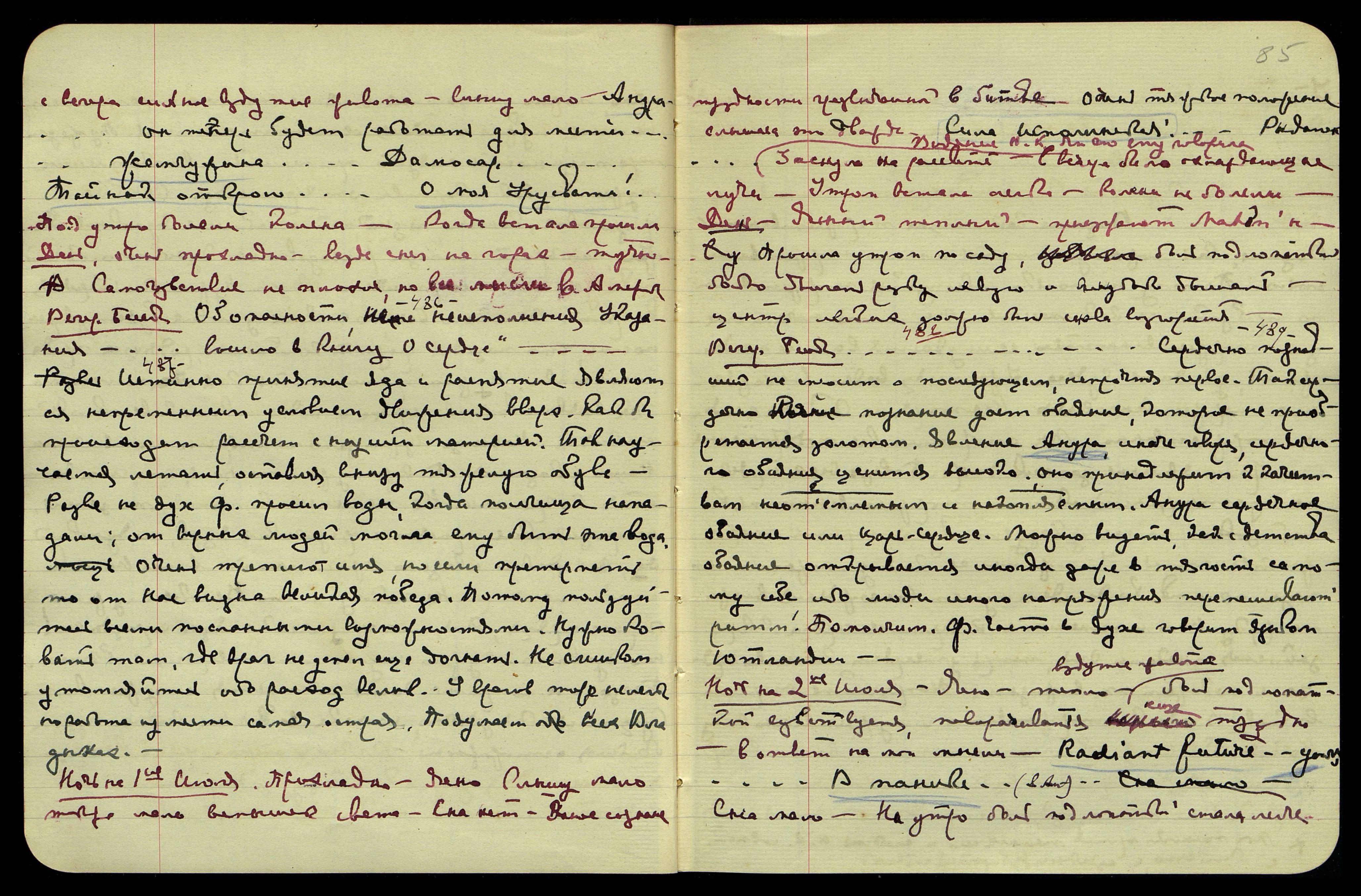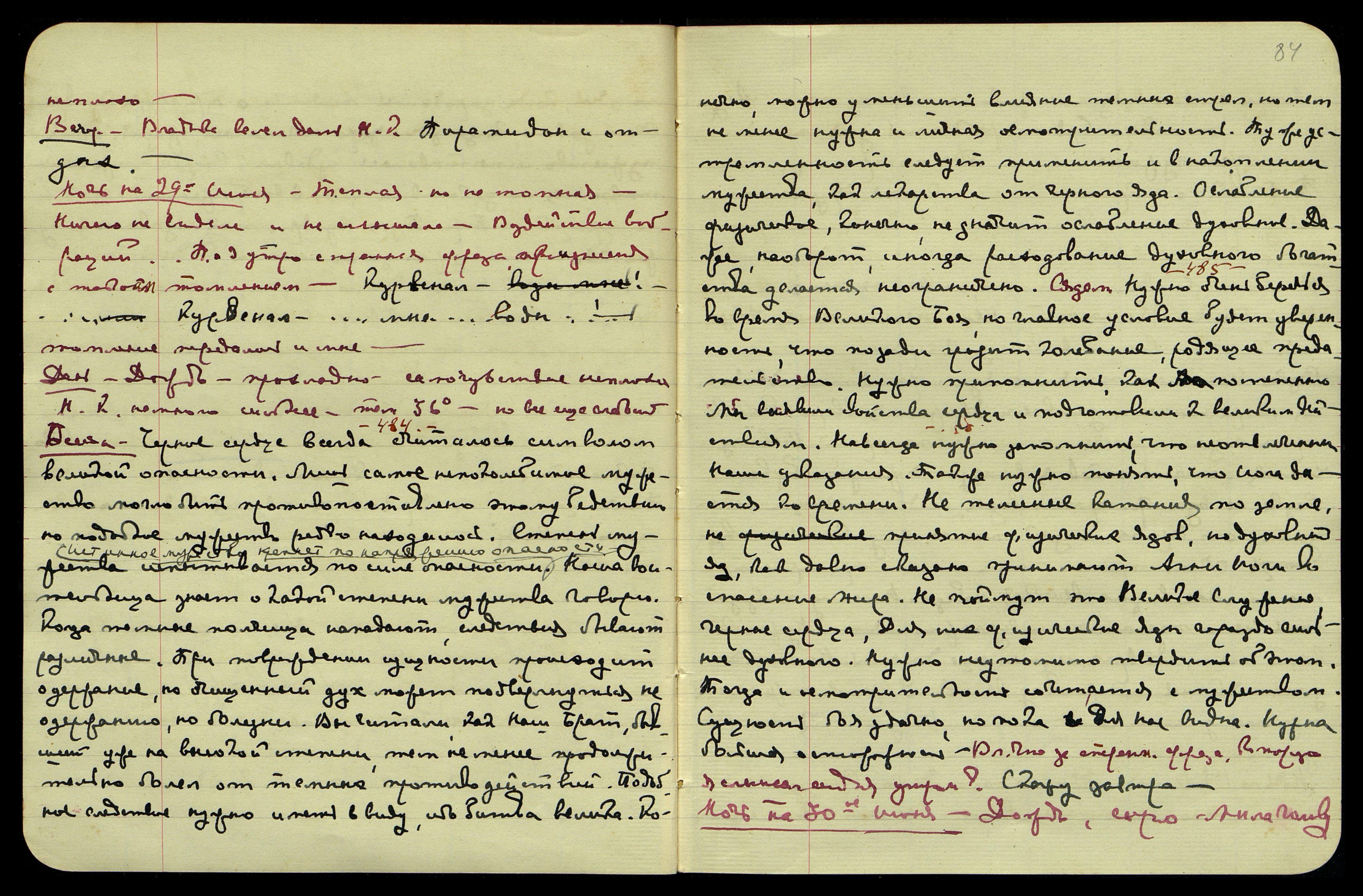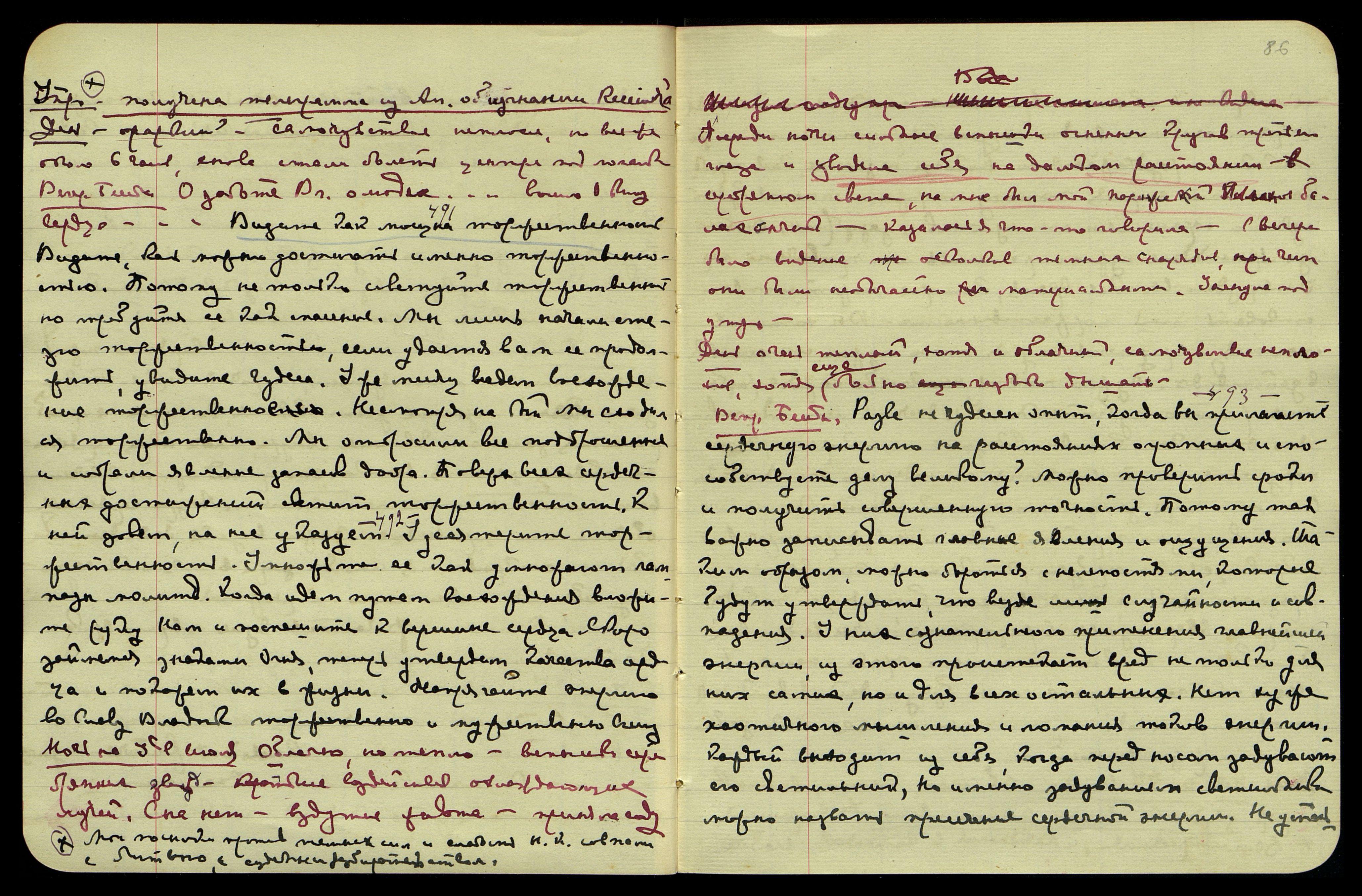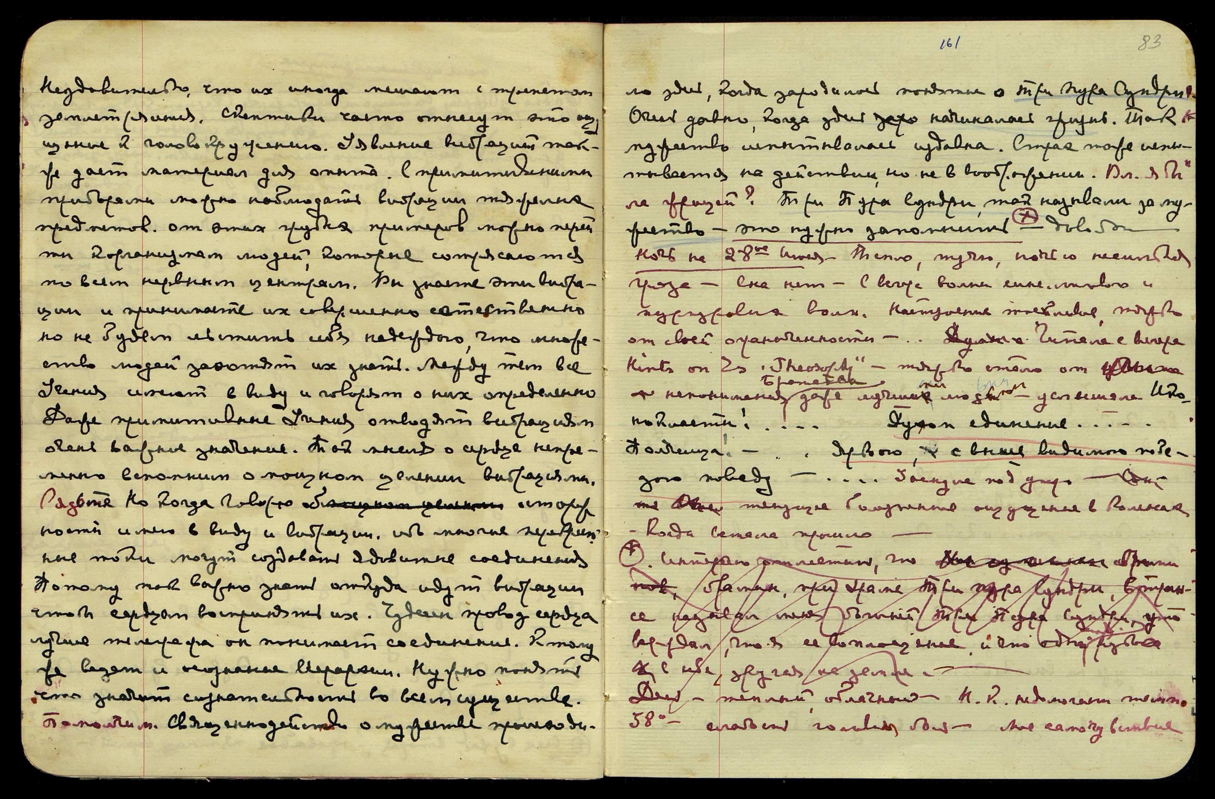 Ночь на 28-е июня. Тепло, тучно, ночью несильная гроза. Сна нет. С вечера волны сине-лилового и пурпурового [света]. Настроение тоскливое, тяжко от своей ограниченности. Читала с вечера Hints on Es[oteric] Theosophy**, тяжко стало от непонимания Братства даже лучшими людьми, услышала: "Иконокласты!***... Духом единение... Полчища!.. Яркою, свыше видимою победою поведу". Заснула под утро. Тянущие болезненные ощущения в коленях. Когда встала − прошло.