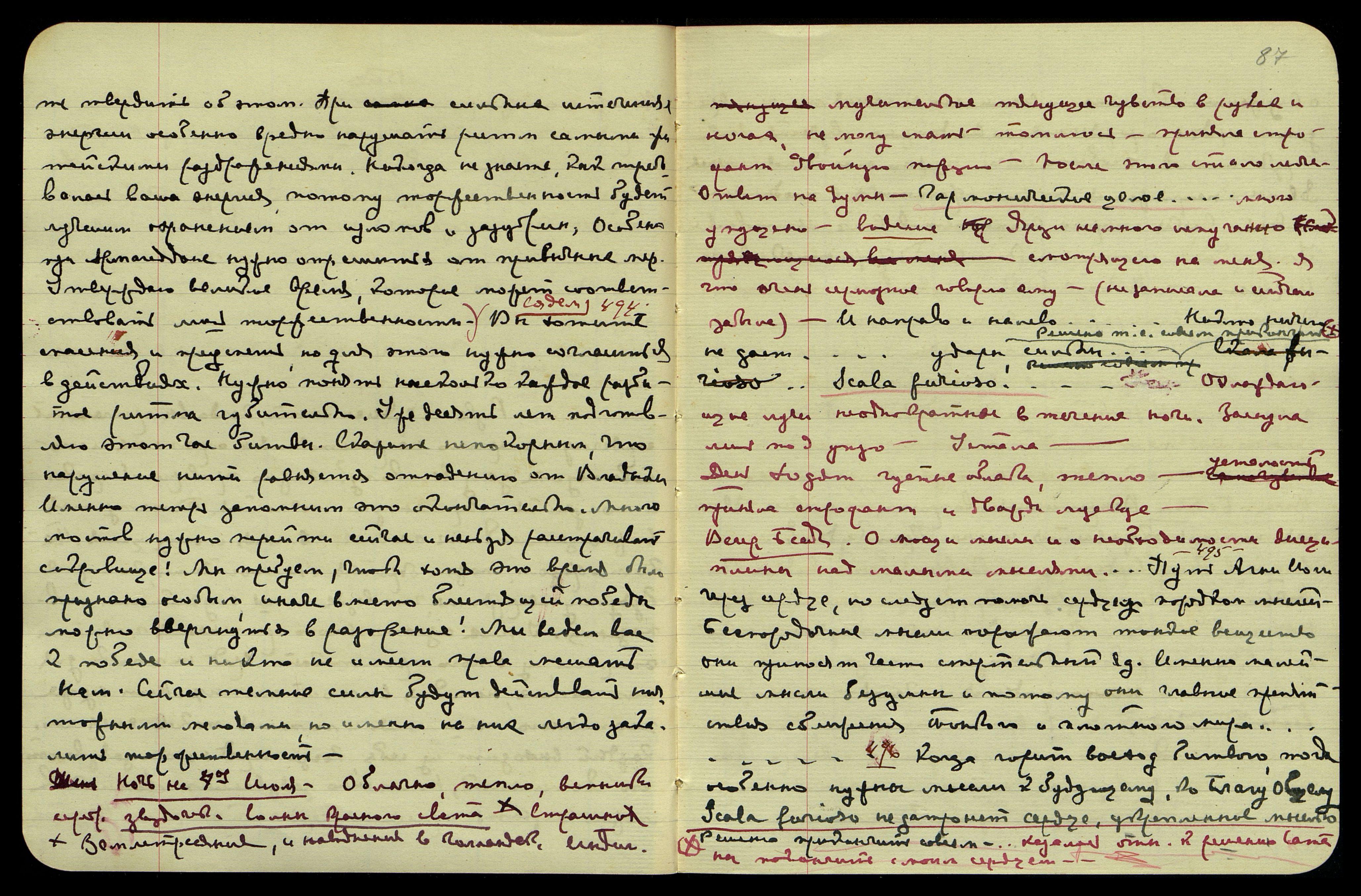 Ночь на 4-е июля. Облачно, тепло, вспышки серебр[яных] звездочек, волны красного света. Страшное землетрясение и наводнение в голландск[ой] Индии. Мучительное тянущее чувство в руках и ногах, не могу спать, томлюсь. Приняла строфант, двойную порцию, после этого стало легче. Ответ на думы: "Гармоническое целое..." Много упущено. Видение Яруи, немного испуганно смотрящего на меня. Я что-то серьезно говорю ему (не записала, сейчас забыла). "И направо, и налево... Никто ничего не дает... удары сильны... Решено совсем прикончить..." Казалось, отн[осилось] к решению Сатаны покончить с моим сердцем... "Scala furioso!*..." Охлаждающие лучи неоднократны в течение ночи. Заснула лишь под утро. Устала.