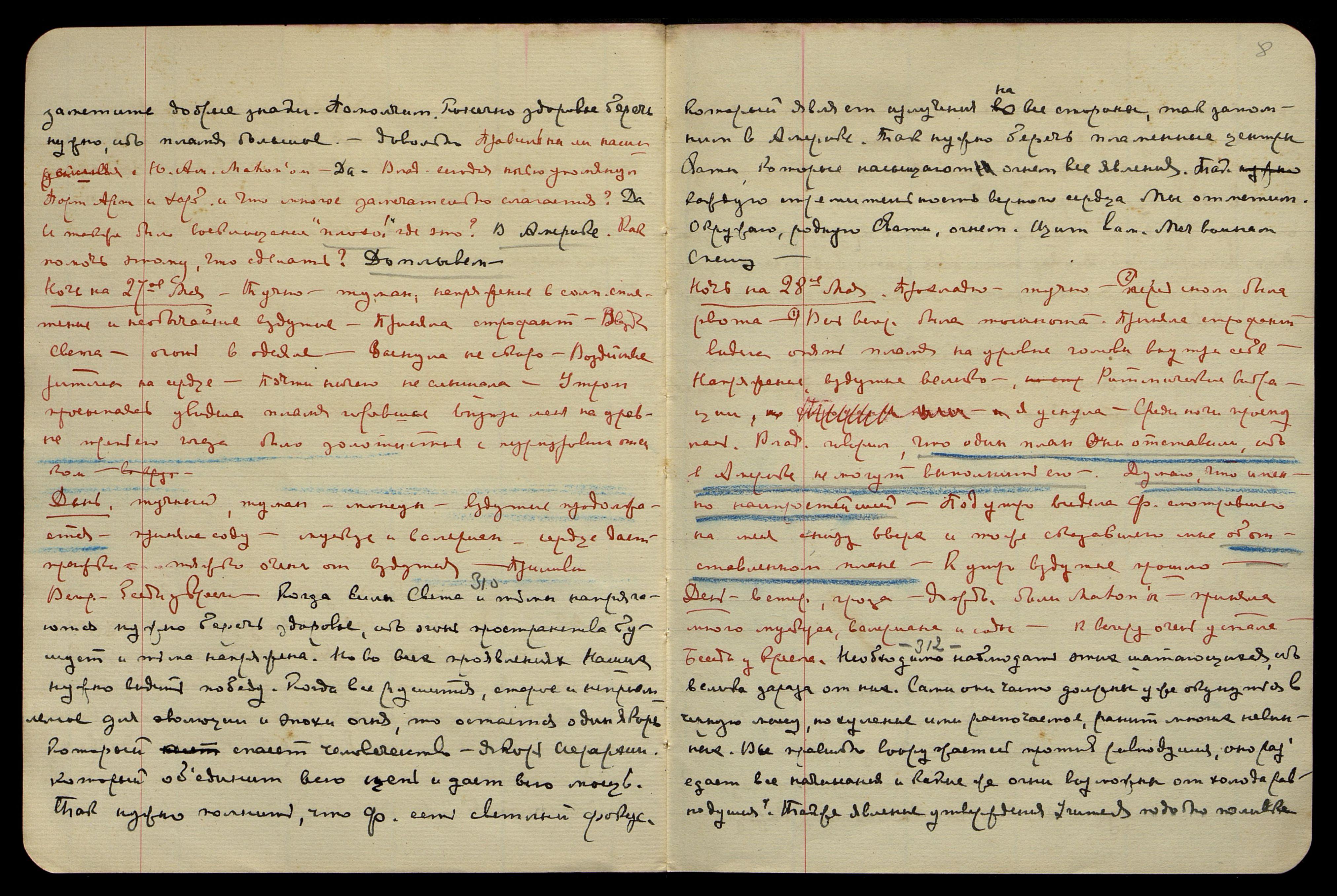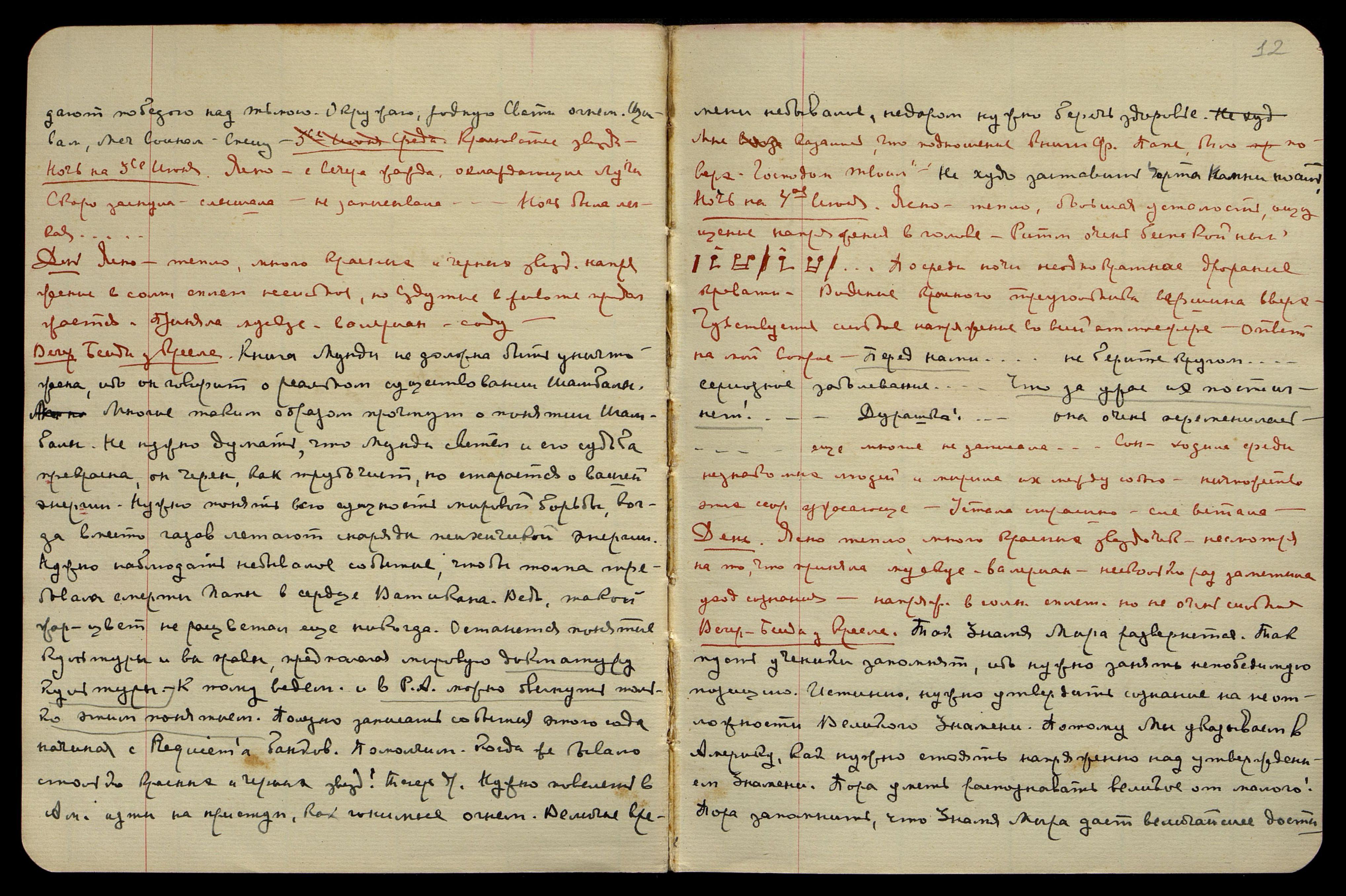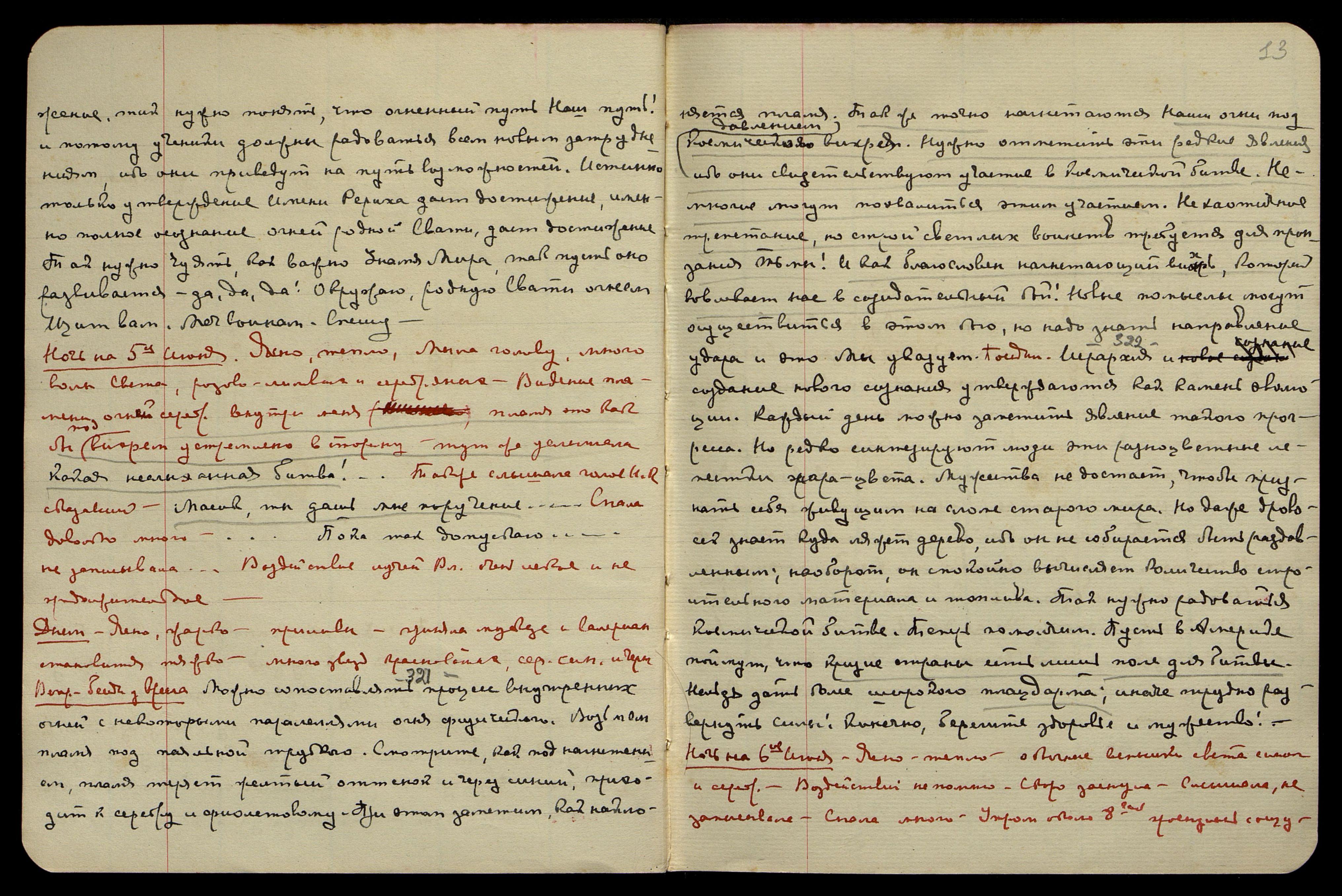 Ночь на 4-е июня. Ясно, тепло, большая усталость, ощущение напряжения в голове. Ритм очень беспокойный [нотные знаки]. Посреди ночи неоднократное дрожание кровати. Видение красного треугольника, вершина вверх. Чувствуется сильное напряжение во всей атмосфере. Ответ на мой вопрос. "Перед Нами... не берите кругом... серьёзное заболевание... Что за ужас их постигнет!.. Дурашка!.. она очень переменилась..." Ещё многое не записала. Сон − ходила среди незнакомых людей и мирила их между собою, ничтожество этих ссор ужасающе. Устала страшно, еле встала.
