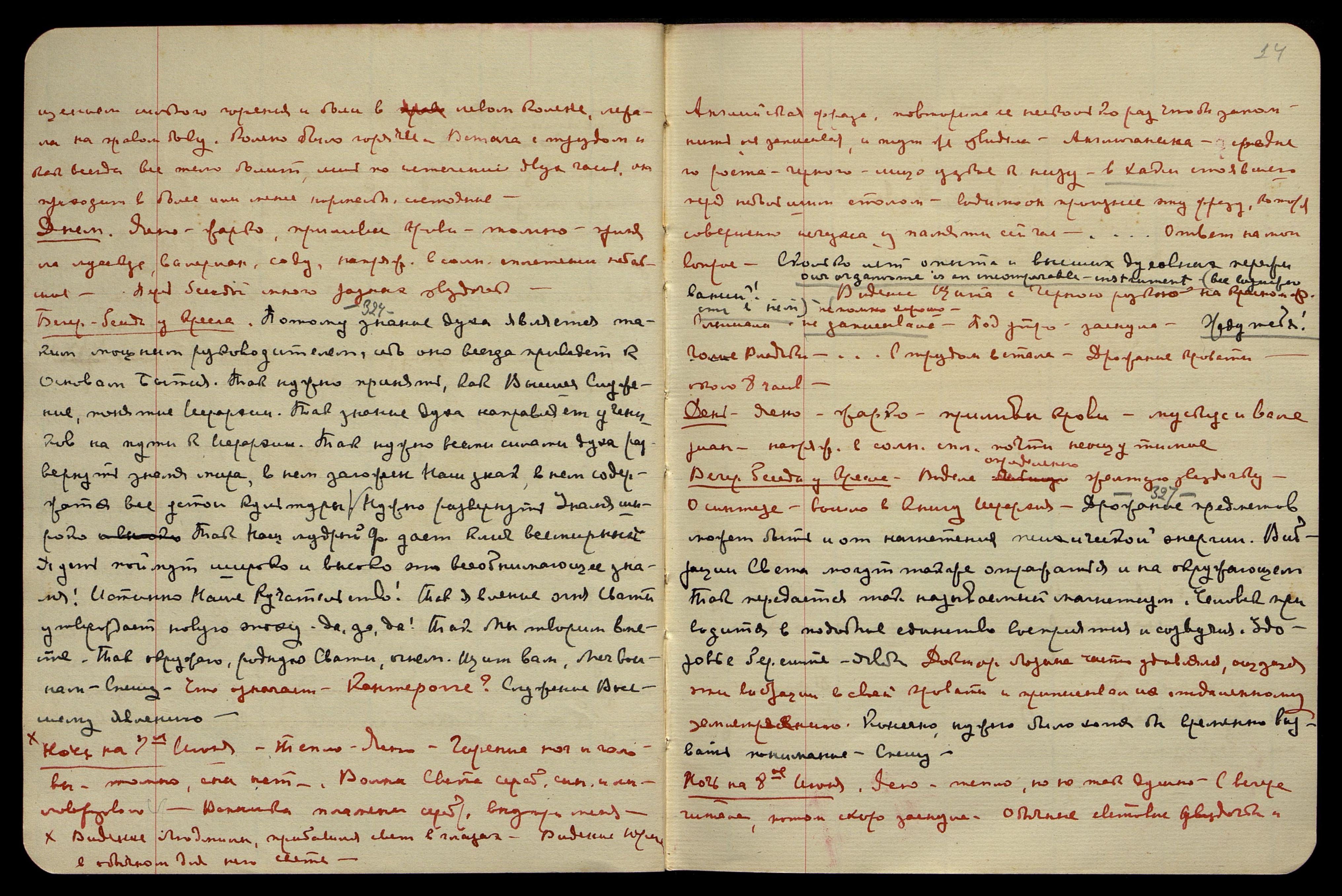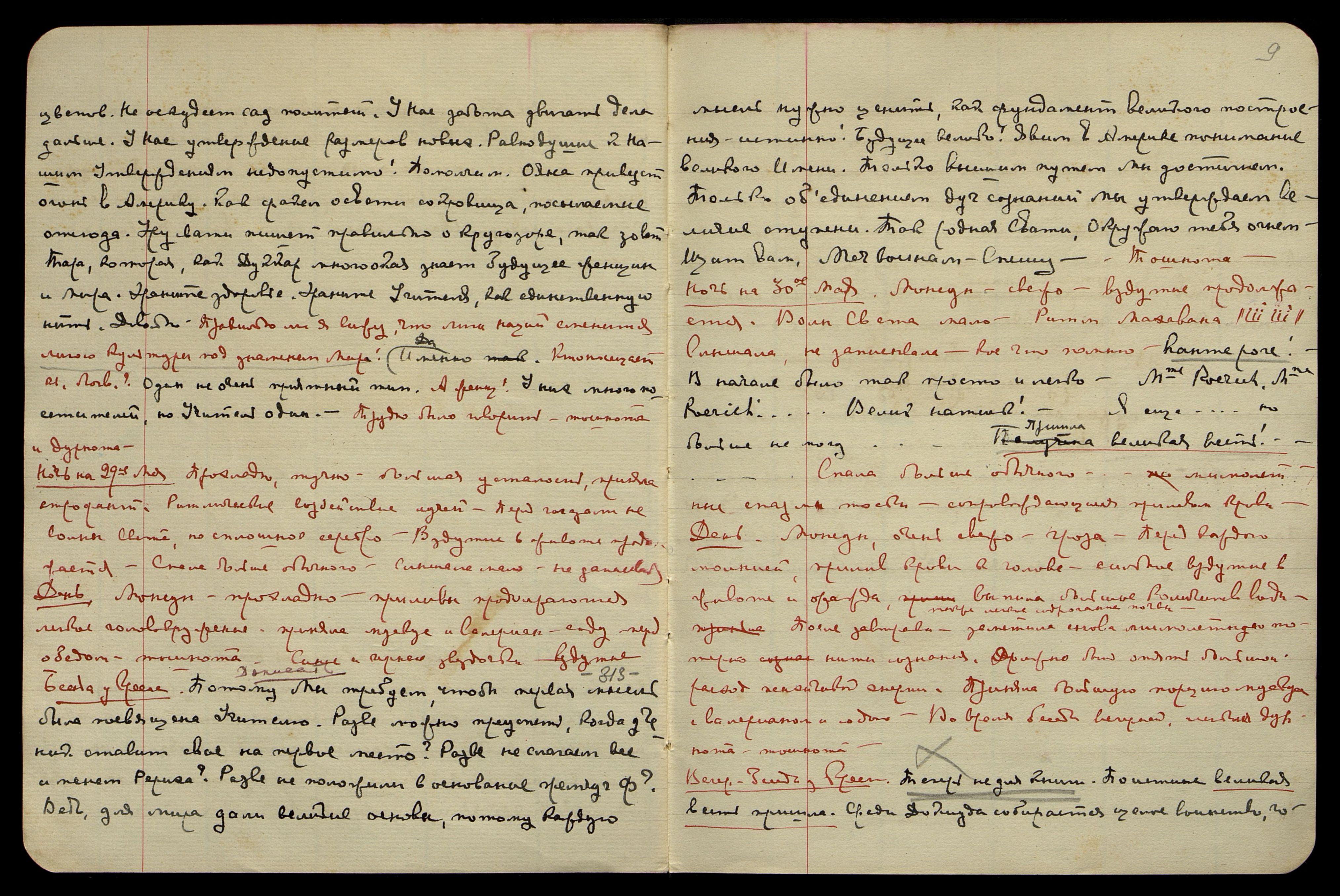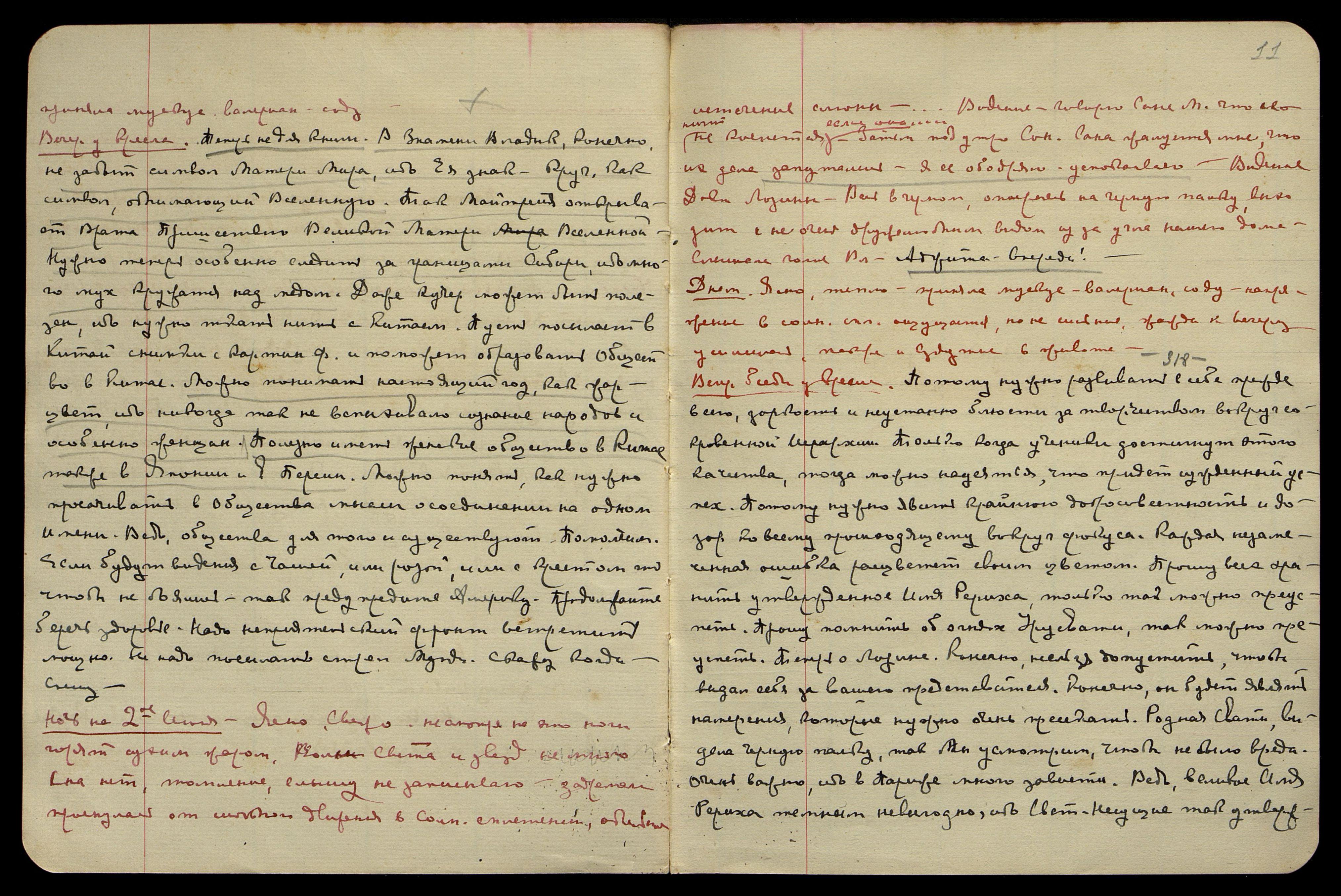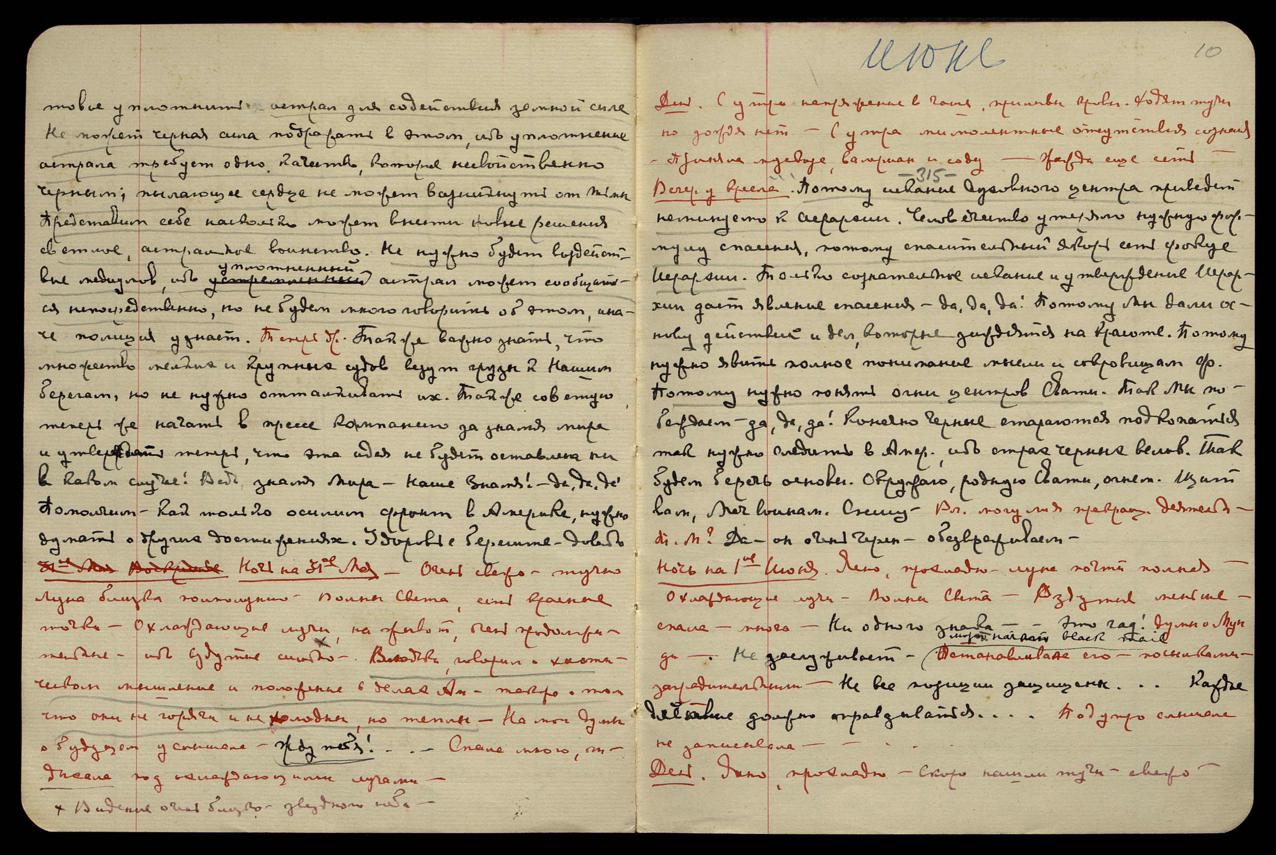 Ночь на 11-е июня. Тепло, ясно. Читала, ибо сна нет, заснула поздно. Вспыхивает яркий серебряный свет над головой, по обеим сторонам. Сон. Была у Шкляверов**, видимо, в чём-то убеждала Жоржа, помню лишь: выхожу из внутренних комнат после внушительного разговора и в помещении, наполненном красным туманом, на полу, ползает, как лярва, стараясь ухватиться за меня, старик Шклявер. Ощущаю, что он понимает, что всё их спасение − в нас, и потому он искренно хочет уцепиться и держаться нас. Но я не даю ему прислониться к моей ауре, отстраняю и просыпаюсь. Второй сон: в Америке, но сейчас не помню. С вечера говорилось о каких-то "bad news" [англ.: "плохие новости"].