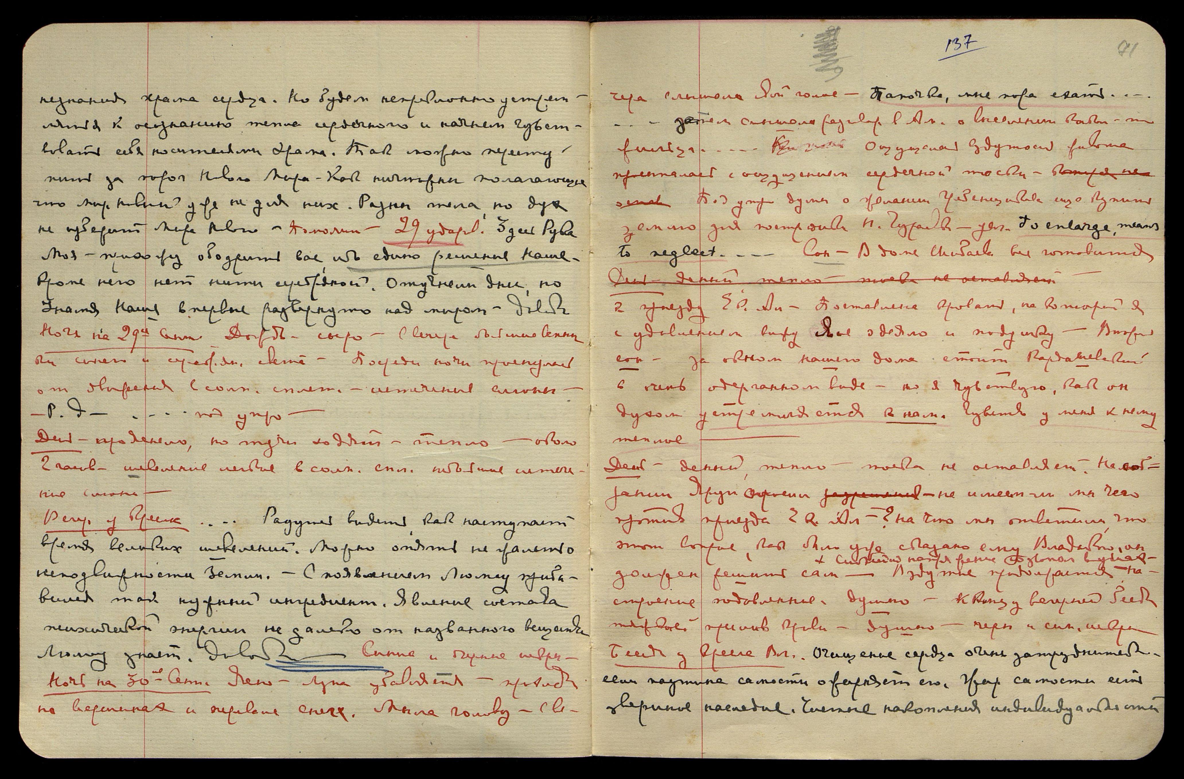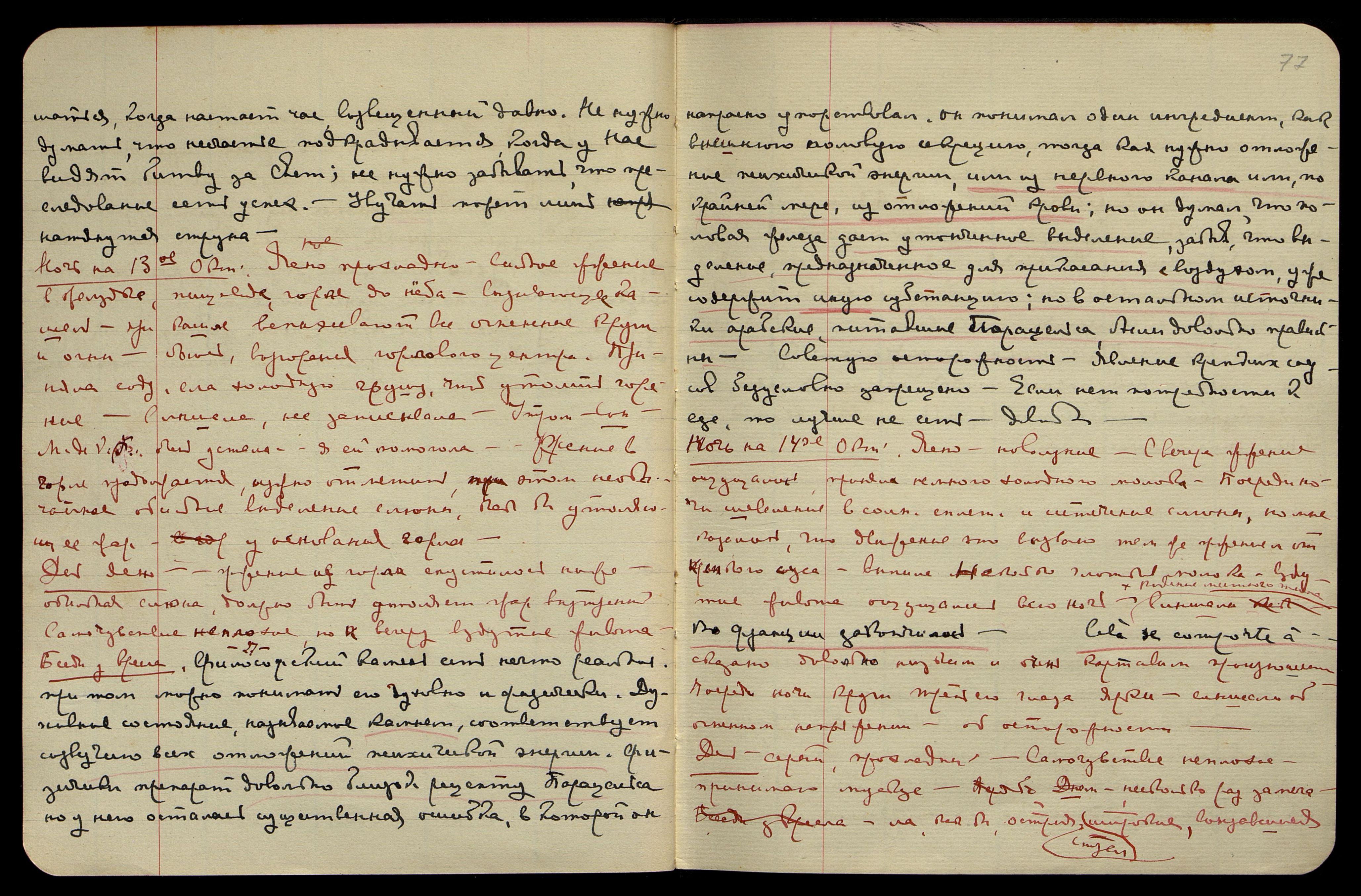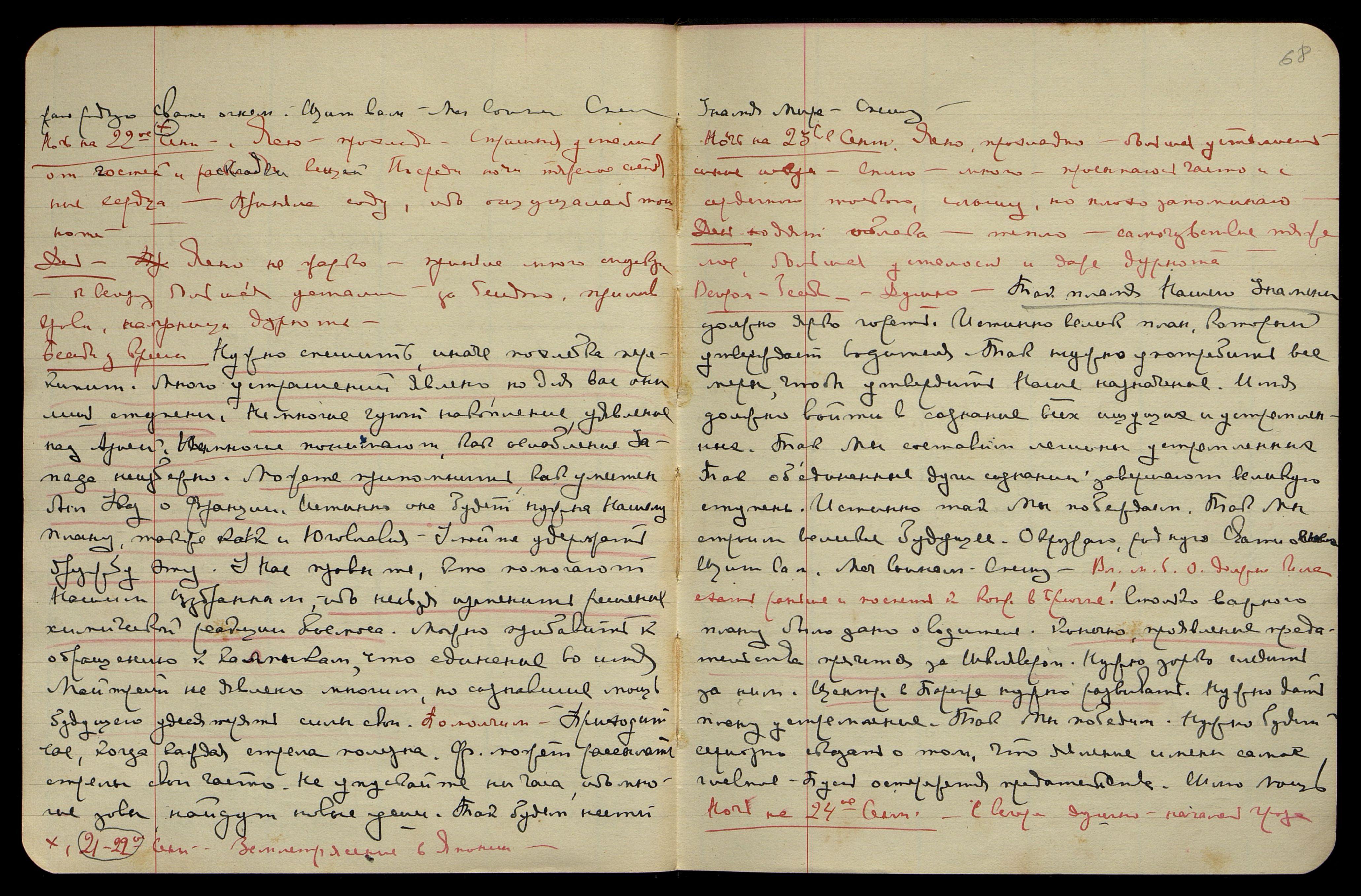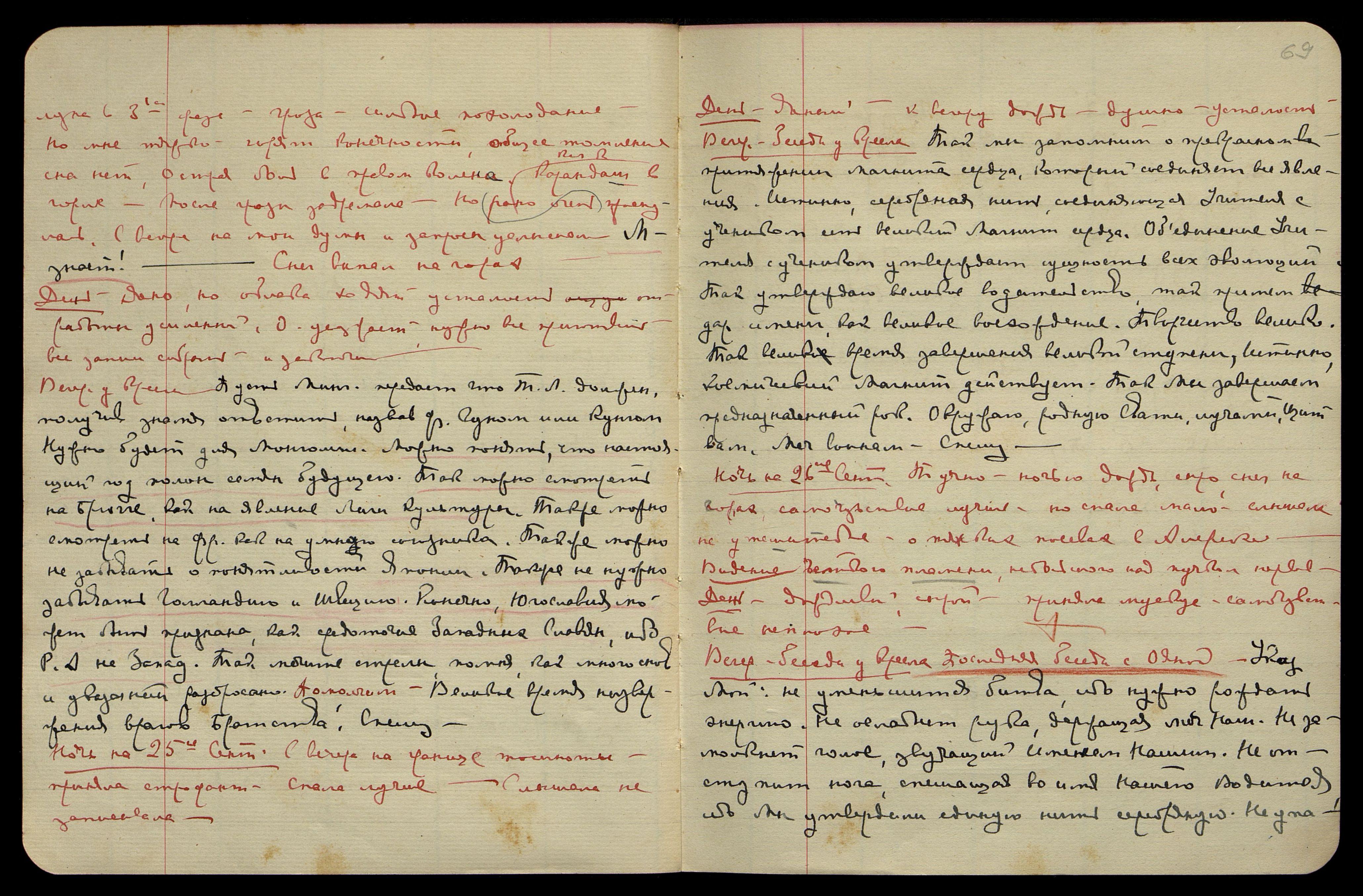 Ночь на 23-е сент[ября]. Ясно, прохладно, большая усталость, синие искры. Сплю много, просыпаюсь часто и с сердечной тоскою, слышу, но плохо запоминаю.