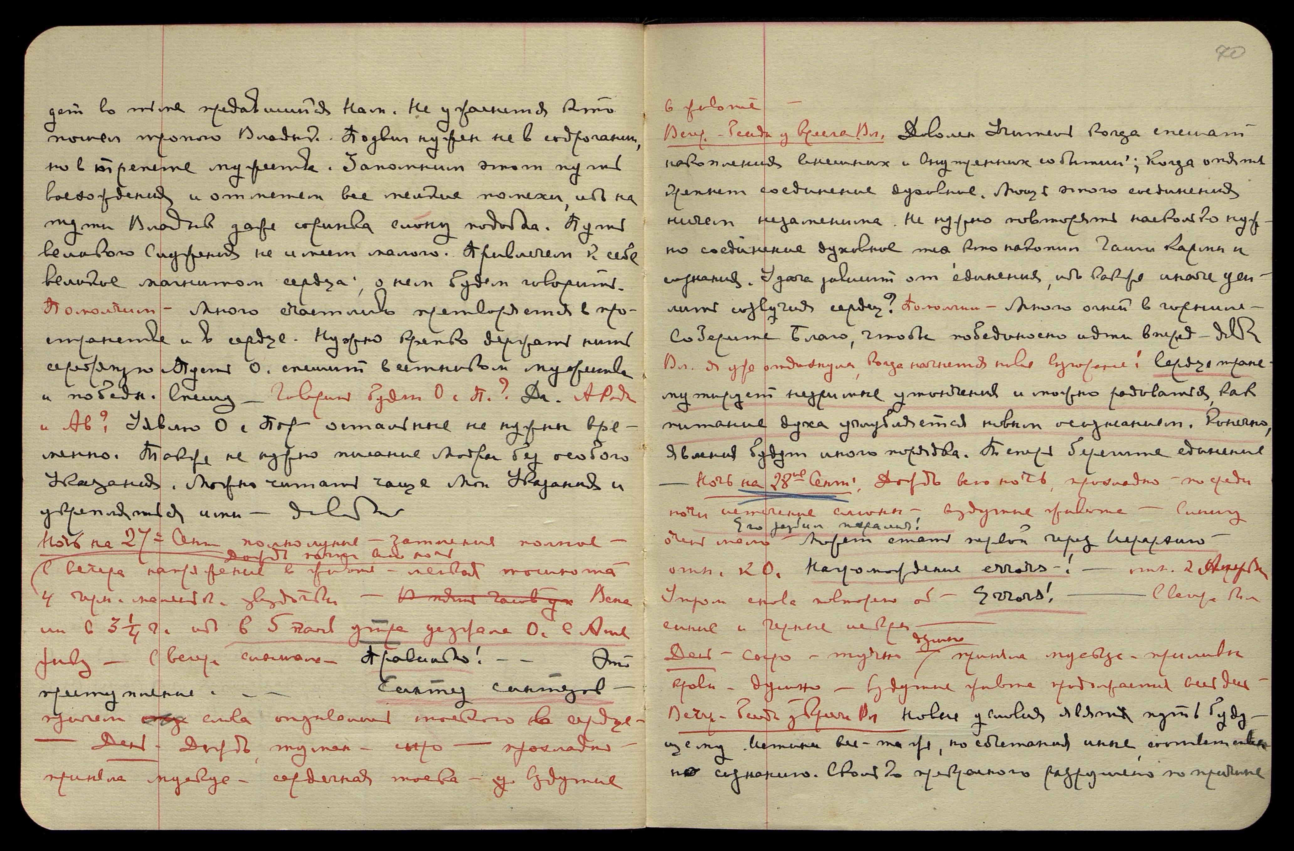 Ночь на 28-е сент[ября]. Дождь всю ночь, прохладно, посреди ночи истечение слюны, вздутие живота. Слышу очень мало. "Его разбил паралич!" "Может стать первой через Иерархию", − отн[осится] к О[яне]. "Нагромождение errors [англ.: ошибок]!" − отн[осится] к Америке. Утром снова говорилось об: "Errors!" С вечера бол[ьшие] синие и чёрные искры.
