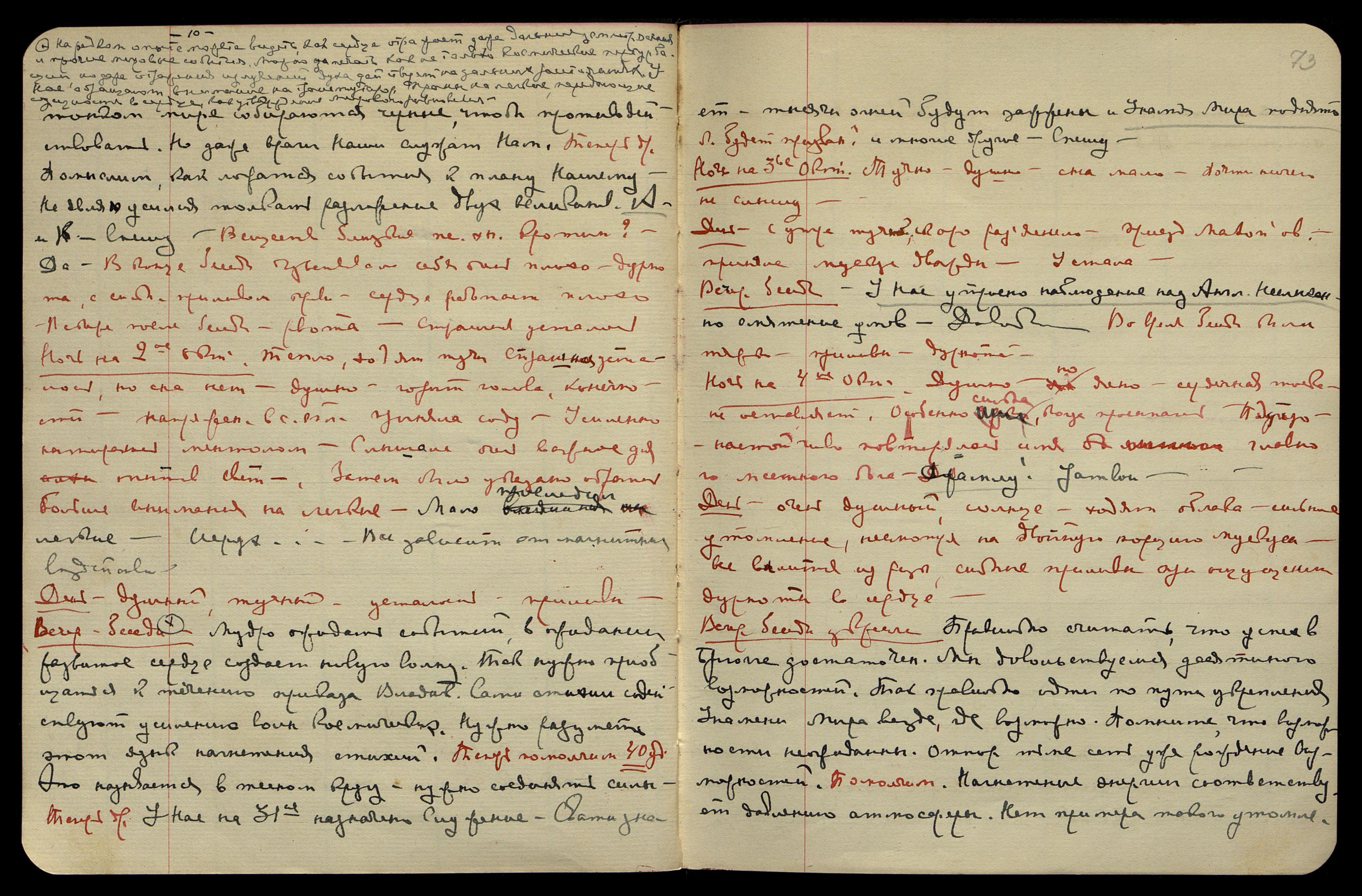 Ночь на 11-е окт[ября]. Ясно, прохладно, трудно было заснуть, почти ничего не слышала. Посреди ночи видела яркий зелёный свет на довольно большом расстоянии от себя у дверей, ведущих в мою комнату. Видела его с открытыми глазами. Позднее очень близко рубиновый свет. Сон. Ходила по большим помещениям белого мрамора, должно быть, римского периода, в одном сравнительно небольшом помещении стояли посреди две высокие колонны и на них как бы из одного куска [мрамора] с колонной, небольшие полые квадраты [на] все четыре стороны, в сложнейших барельефах, назначения их не знаю, тут же стояли и др[угие] скульптуры, фигуры, были бюсты и др. Сильно болели колени.