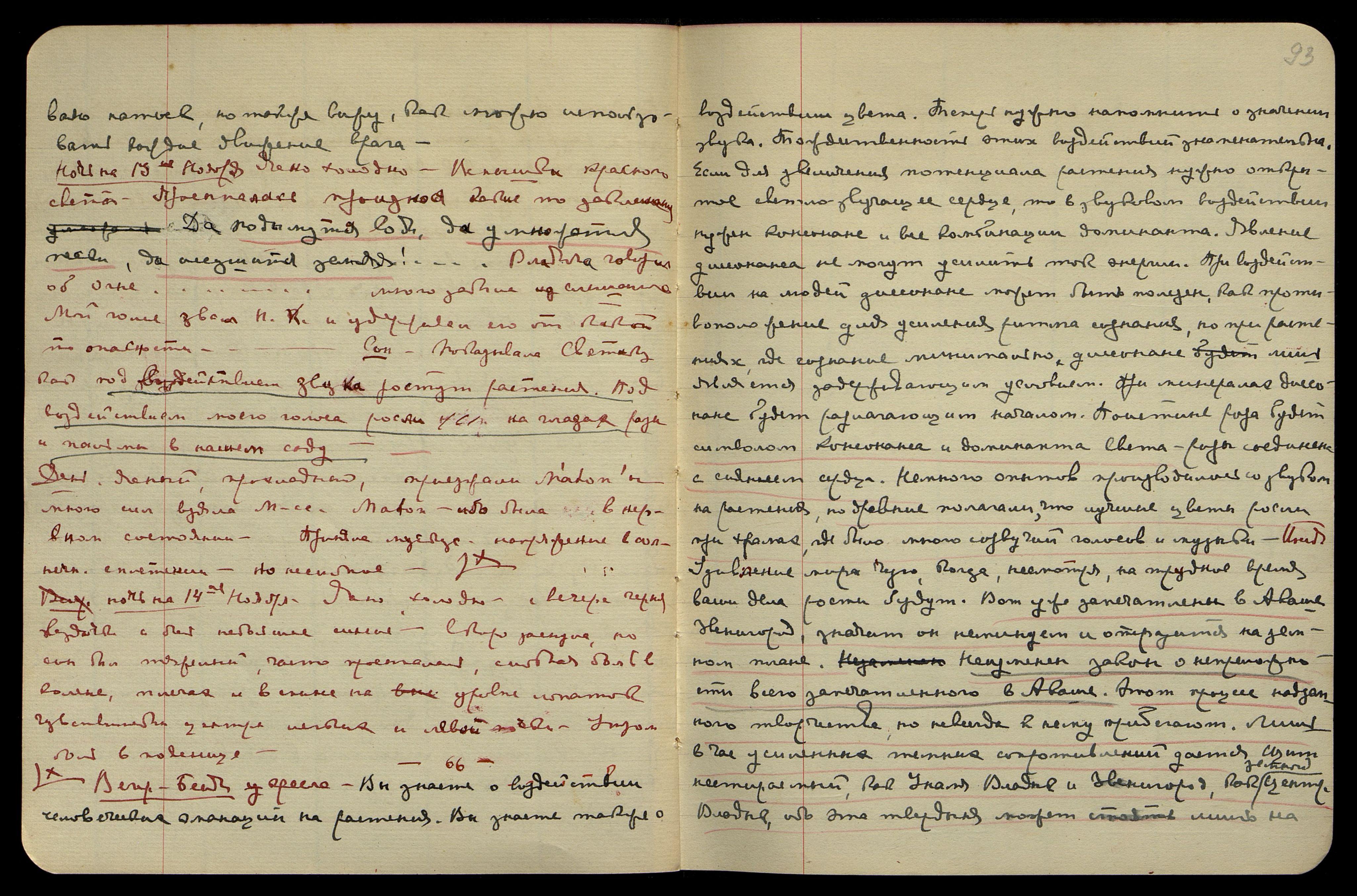 Ночь на 15-е ноября. Ясно, прохладно. С вечера много волн света синего, пурпур[ного] серебра, на одно мгновение надо мною склонилось облако света, в котором было как бы очертания Облика, глаз мой уловил как бы нежнейшие оттенки помимо серебра. Также [ощутила] двойной ритм в организме, 5/4 [нотные знаки] ударение на вторую четверть. Заснула, посреди ночи просыпаясь, ощущала, как всегда, вибрацию кровати. Вздутие живота довольно сильное. Также, просыпаясь, видела сверкание серебряных огней психоглаз. Кольца третьего глаза и часть сегмента большого круга над третьим глазом. [Текст размером 3/4 страницы тщательно зачёркнут.]