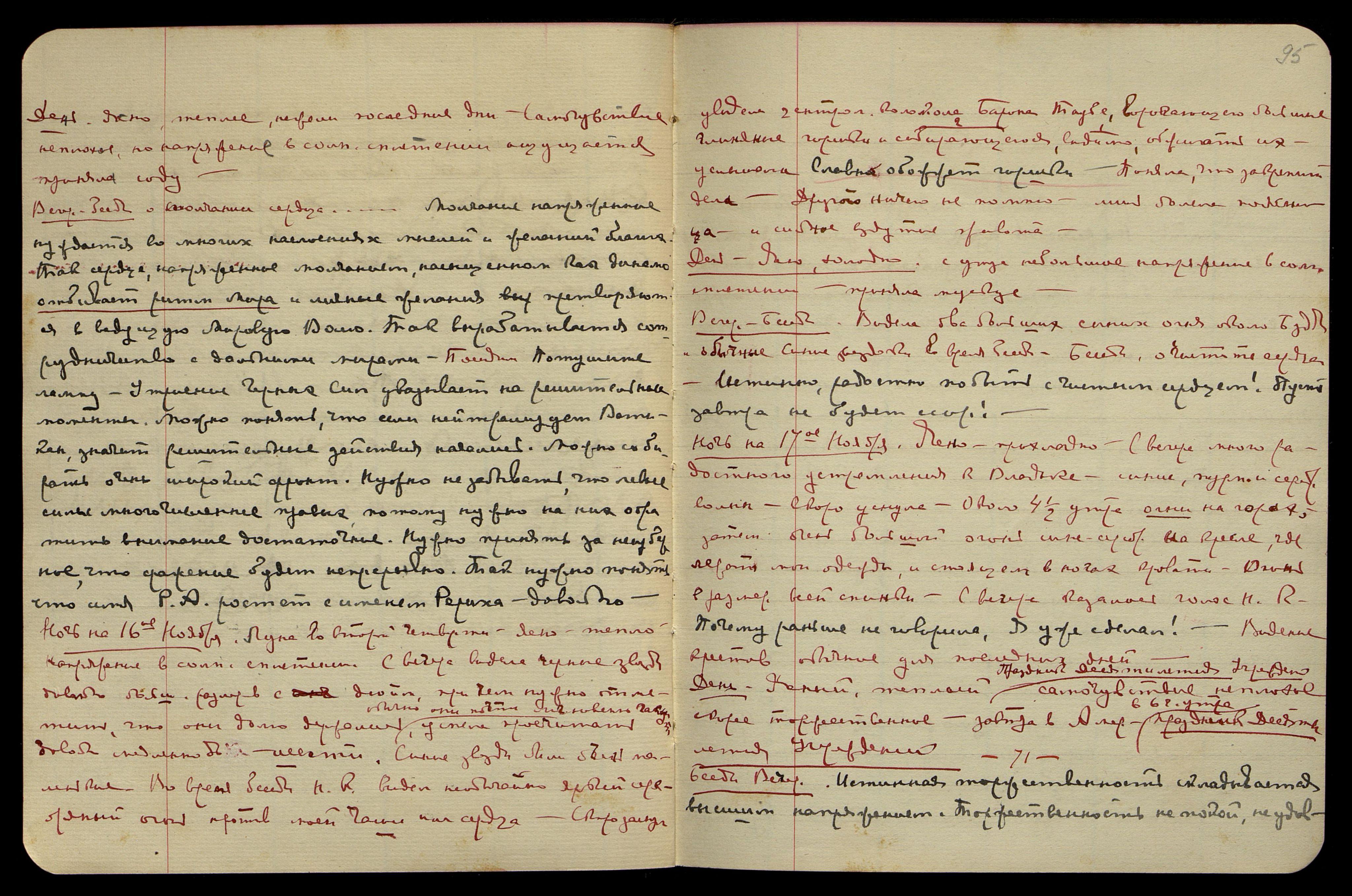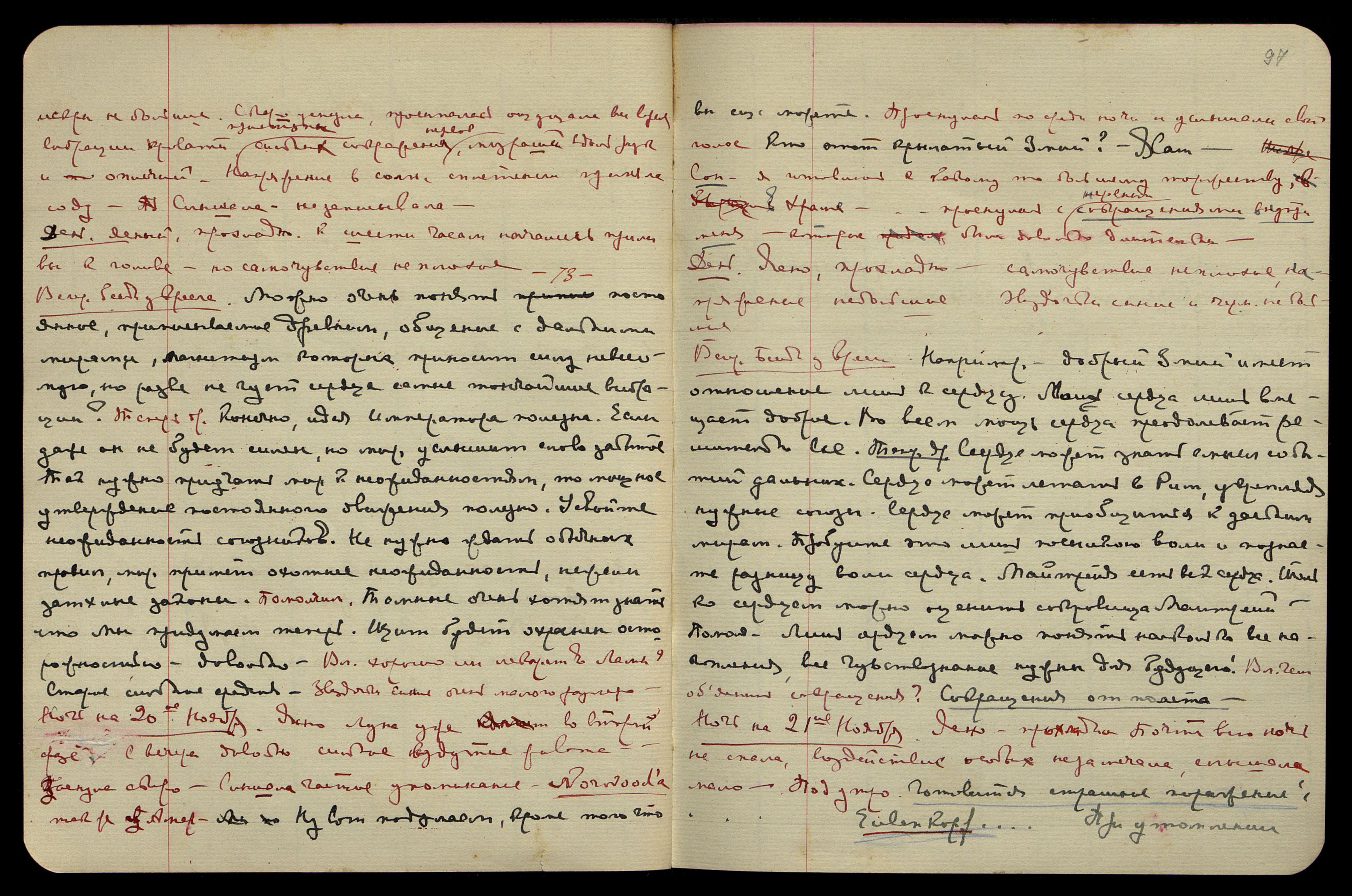 Ночь на 6-е ноября. Ясно, холодно. Сильные охлаждающие лучи на спину. Синие и серебр[яные] звёзды. Посреди ночи просыпалась и ощущала не только сильнейшую вибрацию кровати, но и всего дома, было чувство изжоги. "Жаркая битва!" Сон: все мы находимся в небольшом как бы дворе, окружённом высокими стенами. Мы знаем, что враги находятся за стеною и потому становимся под самой стеной, чтобы их выстрелы, которые следовали беспрерывно, причём и облачки от этих выстрелов образовали почти сплошную массу, пролетали бы поверх нас. Один Юрий, как бы не замечая битвы, стоит посреди двора, открытый для выстрелов, я с величайшим волнением умоляю его пригнуться к земле и встать под защиту стены. Второй сон: какой-то доктор, незнакомый, говорит о моей недолгой жизни и указывает на три опасные точки в моём животе, причём третья, которая угрожает ущемлением вроде грыжи, поведёт к смерти. "Температура тела выше, не отвечает... нормальной... Какой негодяй!" Не относится ли это к Хоршу? Как следствие битвы или, может быть, воздействие лучей, но дважды мои колени были сильно непроизвольно согнуты и подняты, и как бы прижаты к груди. Но на утро встала без особых напряжений и болей.