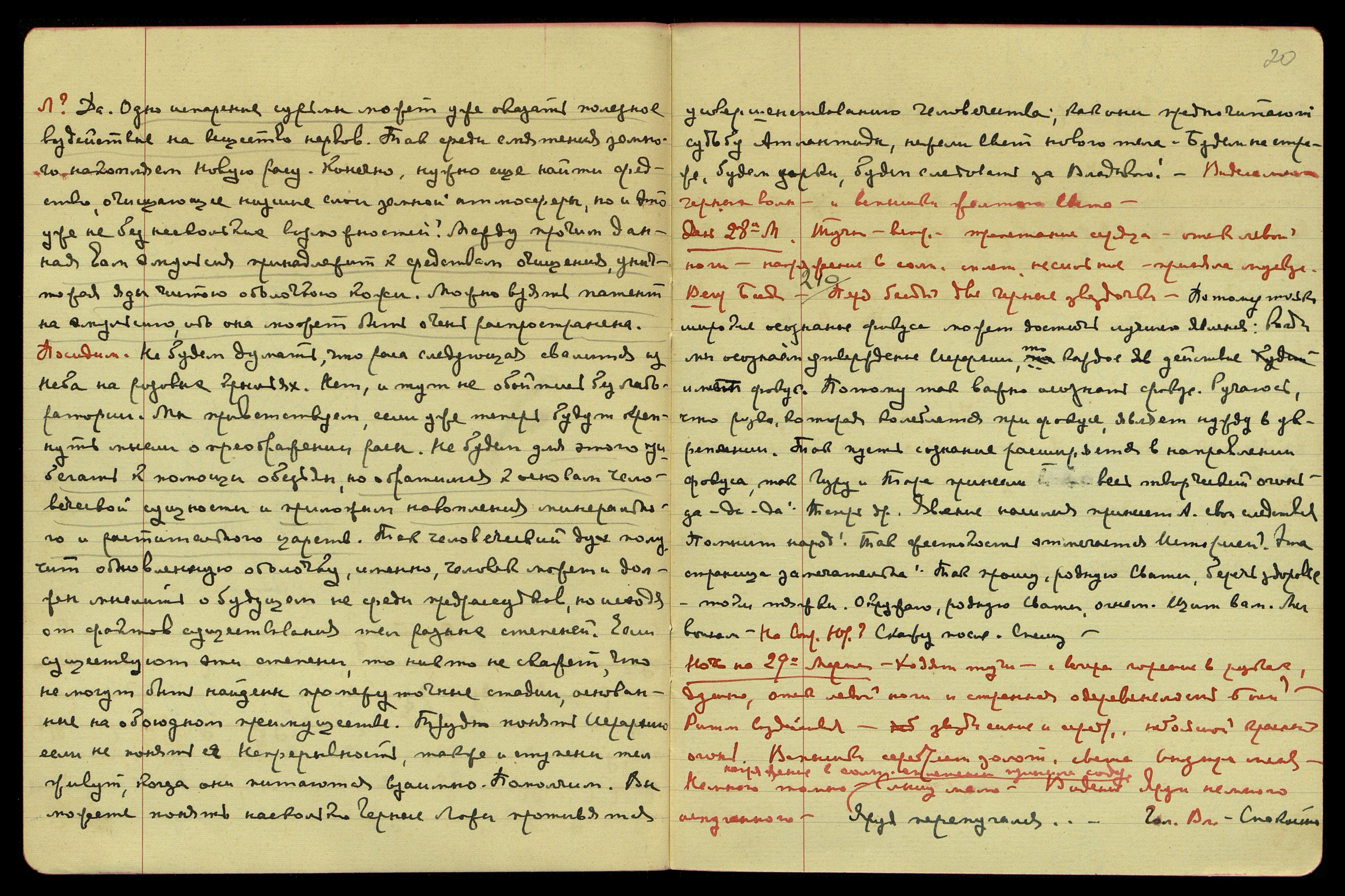 Днем. С утра ясно, после 12 затучило. С утра головокружение и как бы отсутствие, должно быть слабое выделение психической энергии, напряжение в солн[ечном] спл[етении], приняла соду и мускус. После 1 часу ужасное не ритмическое сердцебиение, трепетание, скачки, остановки, ускорение и замирание продолжались несколько минут, должна была приостановить всякую работу. Красные звезды, скоро полетели тучи, ветер. Весь день слабый и неровный пульс, вздутие живота, болезненное напряжение в голове, к вечеру усилилось. Черные звезды.