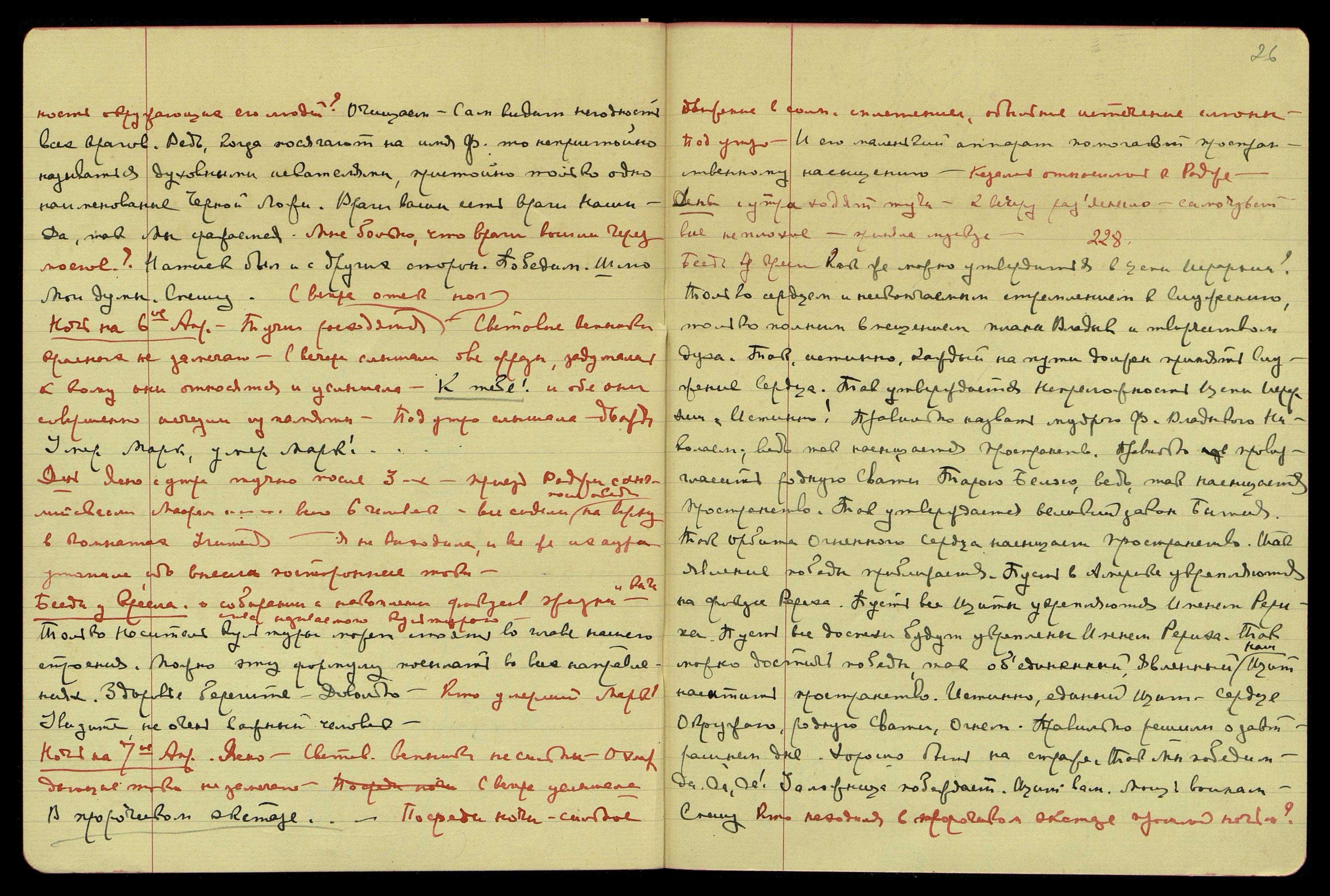 Ночь на 6-е апр[еля]. Тучи расходятся. С вечера отек ног. Световые вспышки, красных не замечаю. С вечера слышала две фразы, задумалась к кому они относятся и услышала: "К тебе!" И обе они совершенно исчезли из памяти. Под утро слышала дважды: "Умер Марк, умер Марк!..."