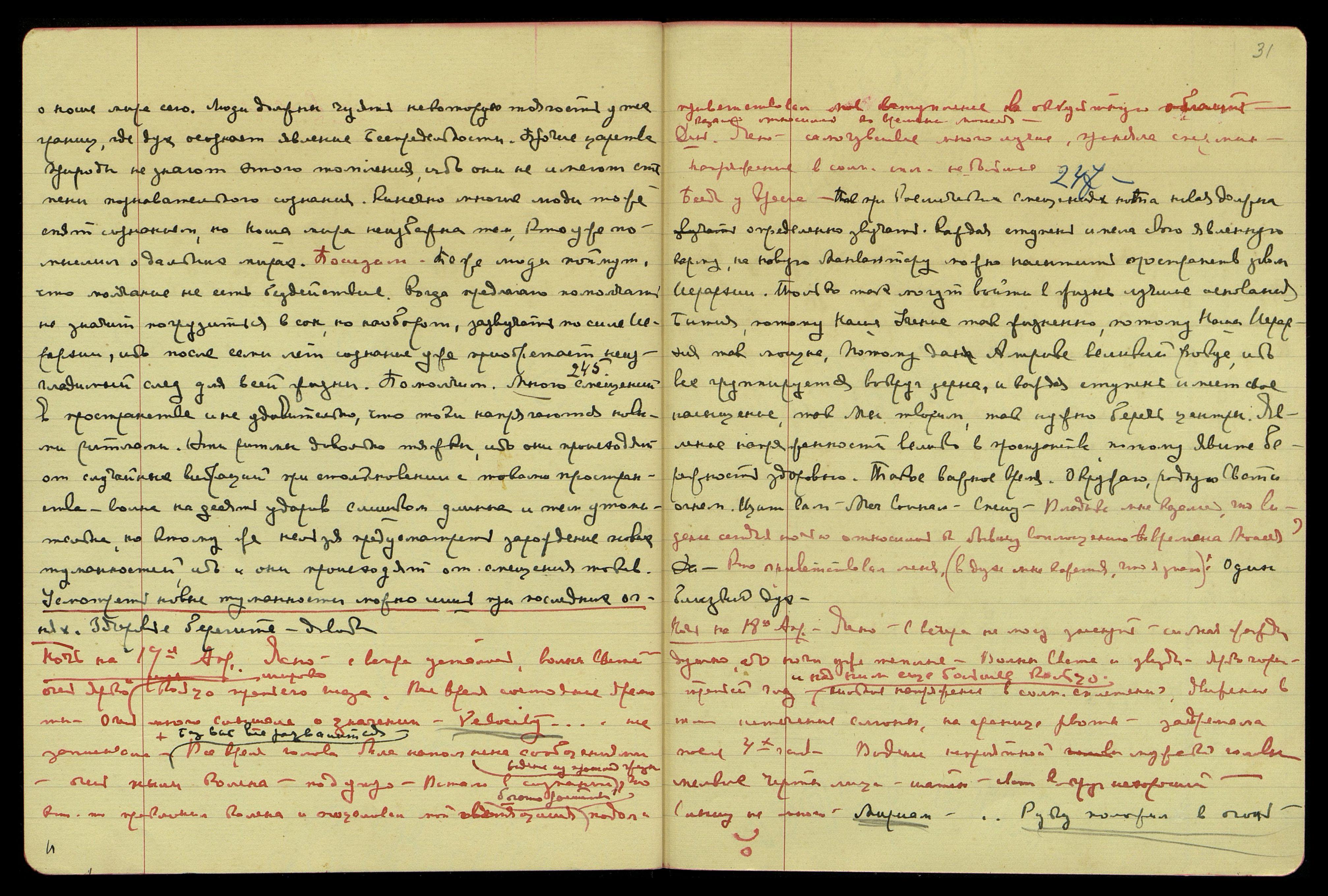 Ночь на 16-е апр[еля]. Ясно, тепло. С вечера ужасное самочувствие, тоска. Сна нет, волны Света, слышу мало. Все лучи тебе... Dia possi… les gradations out toutes les différences possibles... [фран.: Возможны... градации всех возможных различий...] Поняла, что градации зажжения центров имеют всевозможные различия. Третий глаз и психоглаз сверкают ярко. Страшно болят плечи, душно.