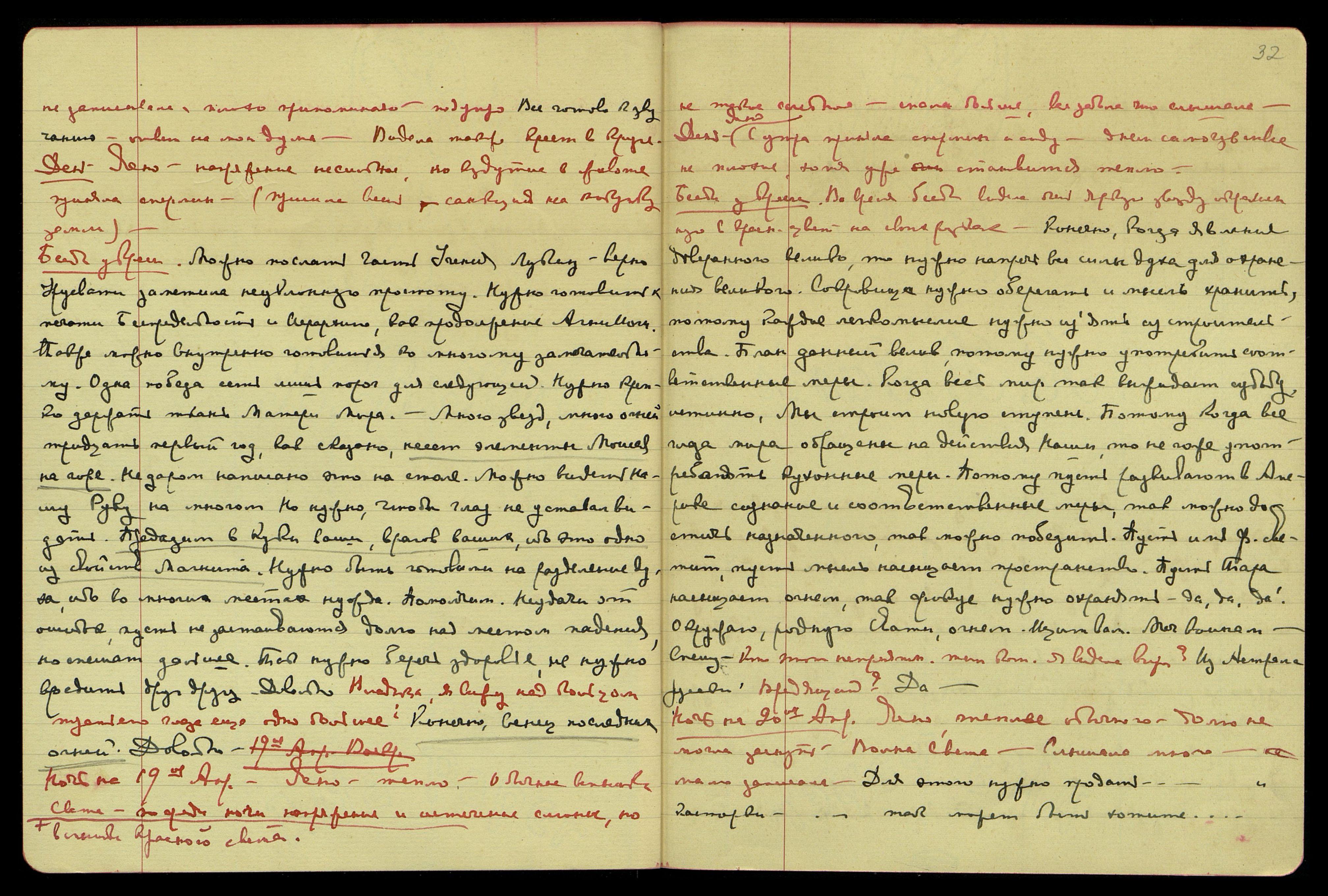 Ночь на 19-е апр[еля]. Ясно, тепло. Обычные вспышки Света (вспышки красного света). Посреди ночи напряжение и истечение слюны, но не такое сильное. Спала больше. Все забыла, что слышала.
