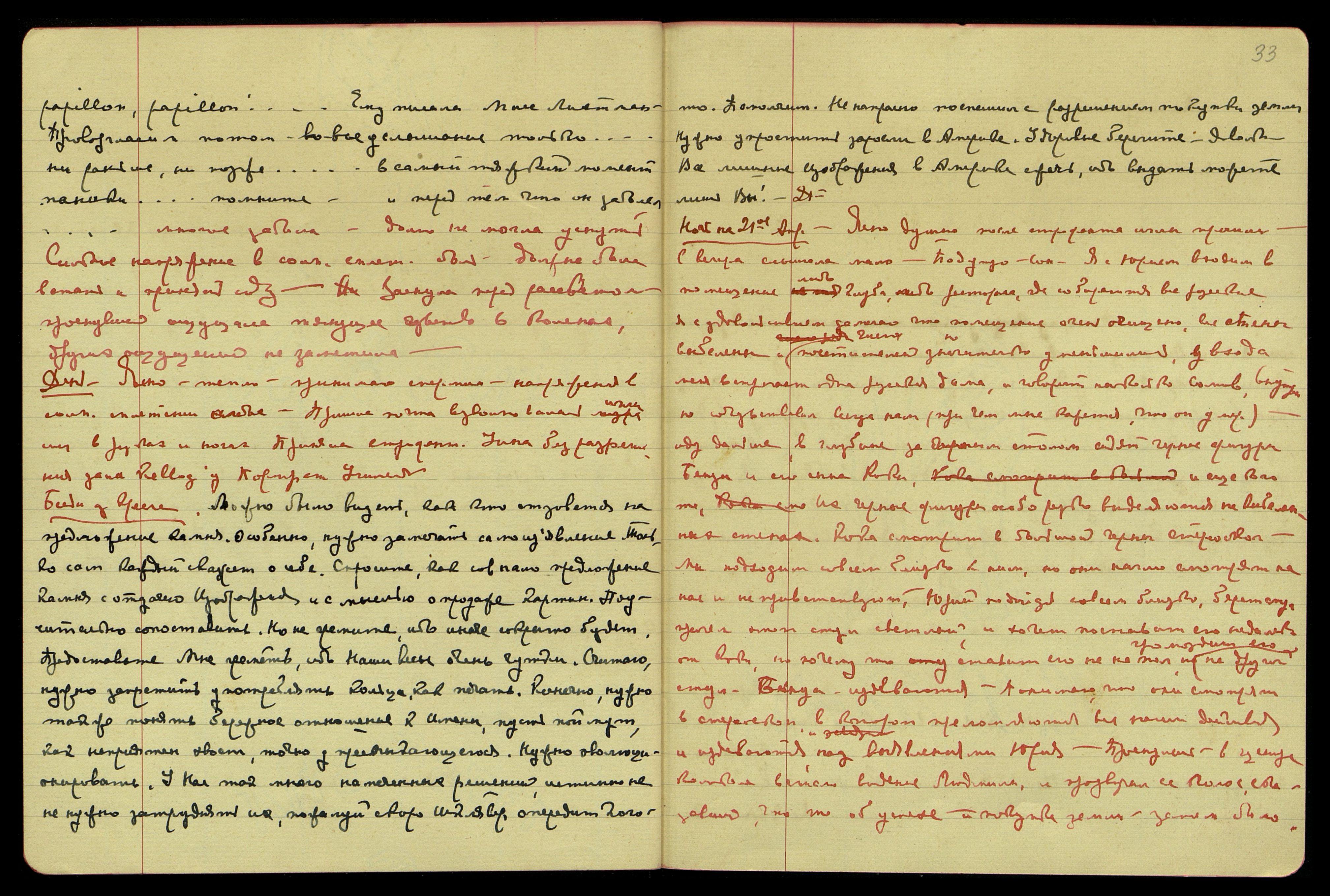 papillon, papillon… [фр: бабочка, бабочка...] Ему писала Мисс Лихтман. Провозгласил потом во всеуслышание только… ни раньше, ни позже… в самый тяжкий момент паники… помните. И перед тем, что он заболел… Многое забыла. Долго не могла уснуть. Сильное напряжение в солн[ечном] сплет[ении]. Боль, должна была встать и принять соду. Заснула перед рассветом, проснувшись, ощущала тянущее чувство в коленях, других ощущений не заметила.