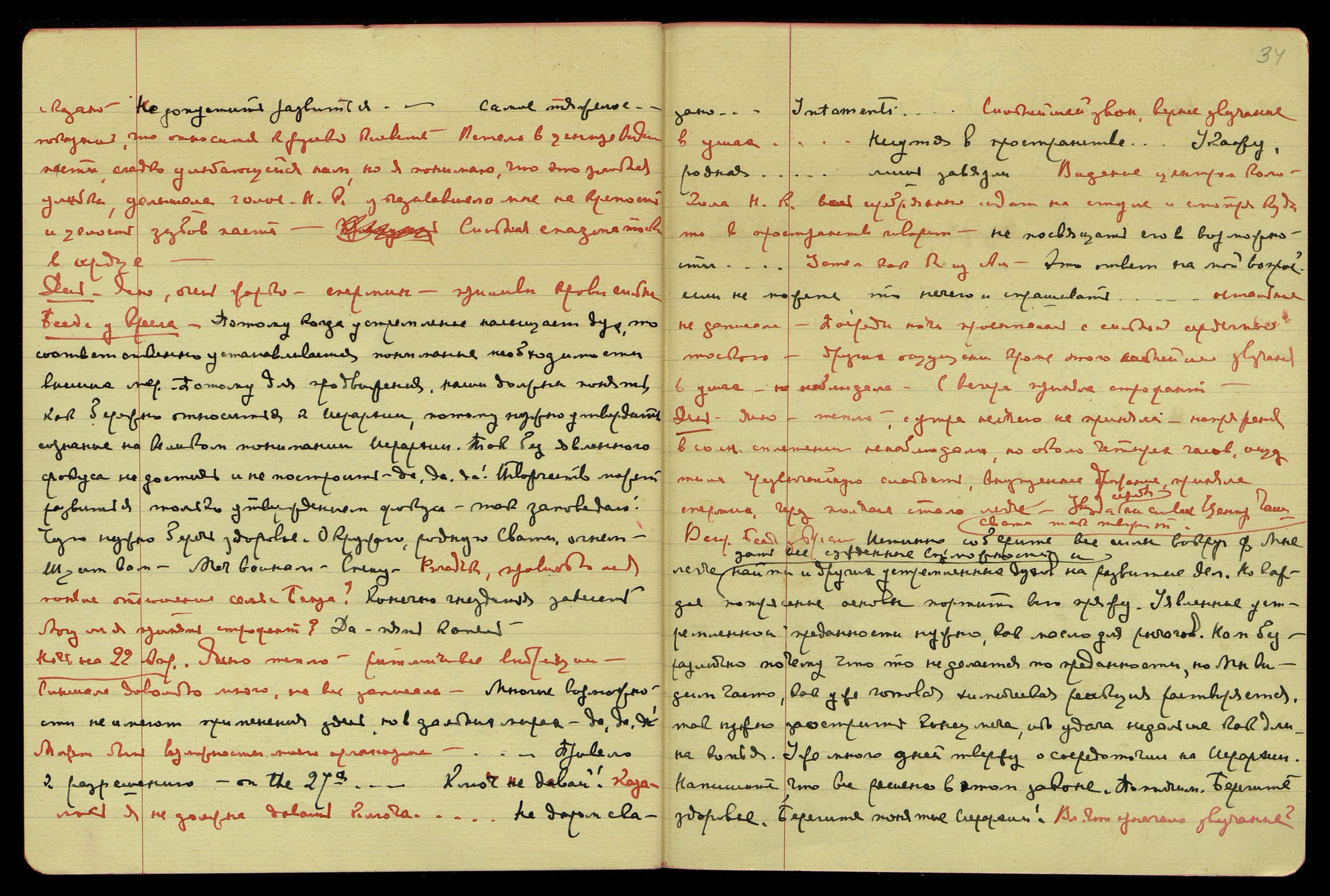 Ночь на 22-е апр[еля]. Ясно, тепло, ритмические вибрации. Слышала довольно много, не все записала. Многие возможности не имеют применения здесь, но в дальних мирах – да, да, да! Может быть, возможности моего организма. …Привело к разрешению – on the 27-th… Ключ не давай! Казалось, я не должна давать ключа… Не даром сказано… Intamenti… Сильнейший звон, вернее звучание в ушах… Несутся в пространстве… Укажу, родная… лишь завязли. Видение центром Колокола Н[иколая] К[онстантиновича] − весь серебрянный, сидит на стуле и смотрит куда-то в пространство, говорит: "Не посвящать его в возможности…" Затем как бы из Америки: "Это ответ на мой вопрос? Если не можете, то нечего и спрашивать…" Остальное не записала. Посреди ночи просыпалась с сильной сердечной тоскою, других ощущений, кроме этого сильнейшего звучания в ушах, не наблюдала. С вечера приняла строфант.