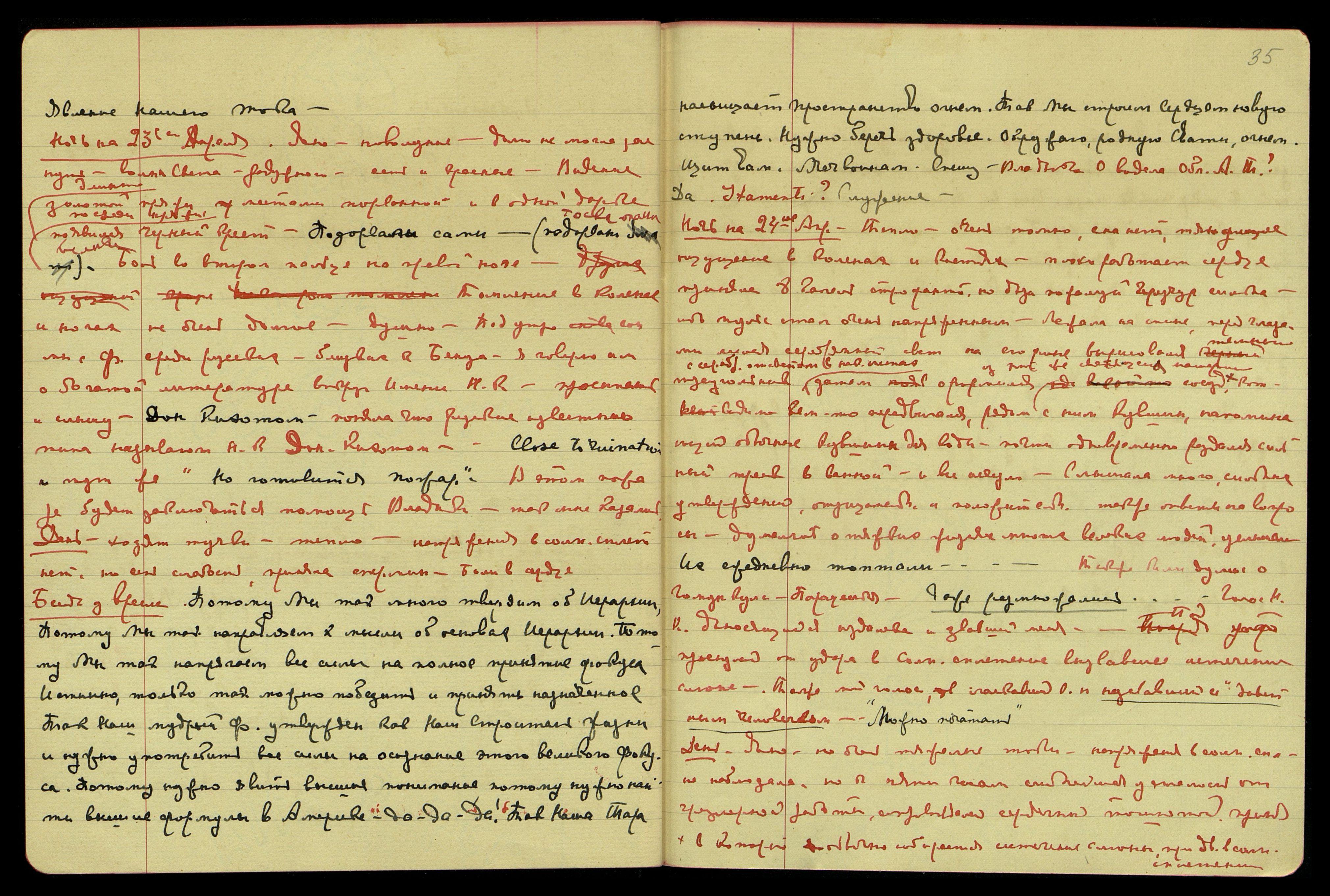 Ночь на 23-е апр[еля]. Ясно, новолуние. Долго не могла заснуть. Волны Света радужного, есть и красные. Видение длинной золотой пряжи, местами порванной и в одной дырке посреди пряжи появился черный крест. Подорвали сами. Тоска, опасность велика. Боль во втором пальце на правой ноге. Томление в коленях и ногах не очень долгое. Душно. Под утро сон. Мы с Ф[уямой] среди русских, близких к Бенуа. Я говорю им о богатой литературе вокруг Имени Н[иколая] К[онстантиновича], просыпаюсь и слышу: "Дон Кихотом", -поняла, что русские известного типа называют Н[иколая] К[онстантиновича] Дон Кихотом. Close to ruination [англ.: Близко к крушению], и тут же: «Но готовится пожар». В этом пожаре будет заключаться помощь Владыки, так мне казалось.