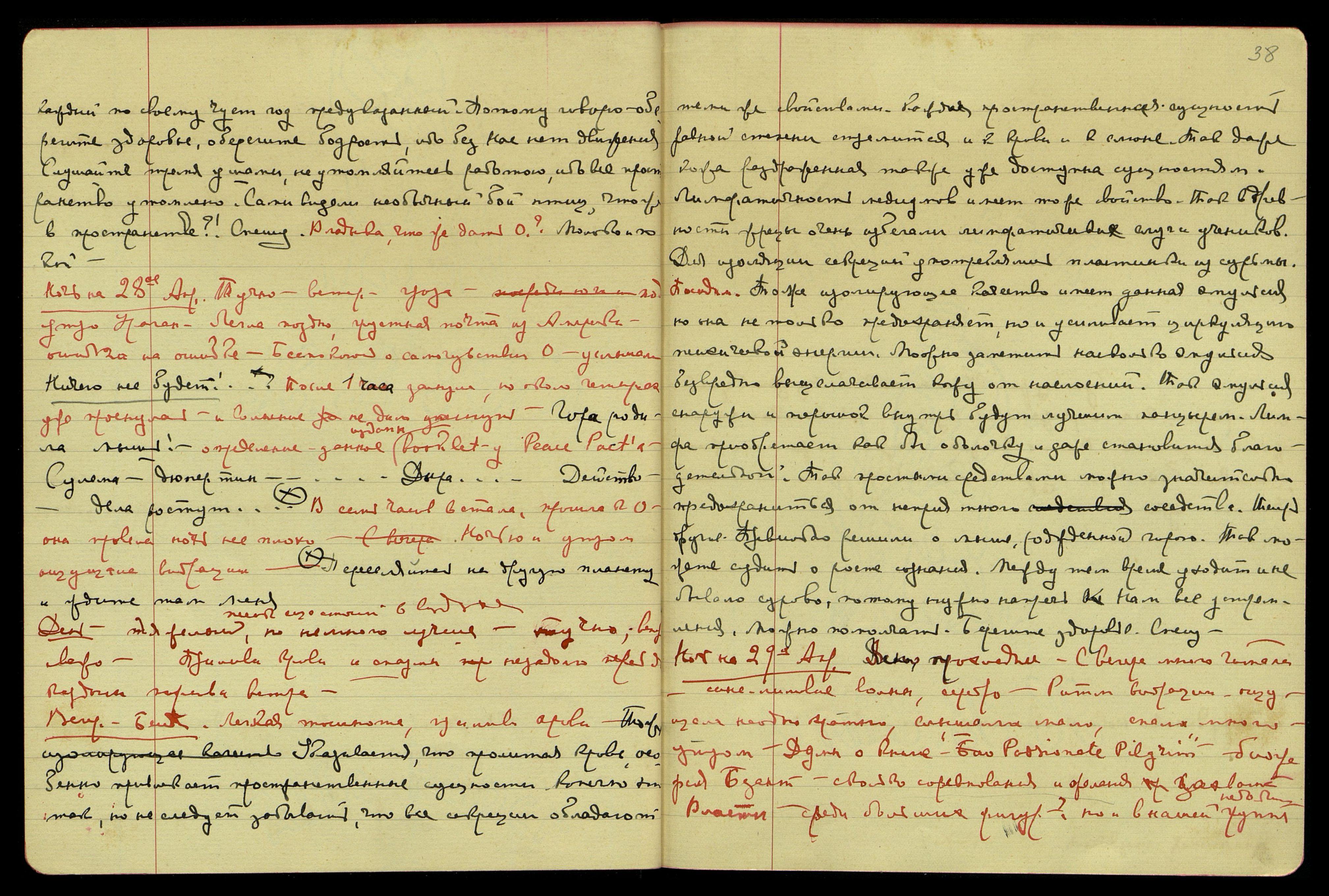 День. Ясно, тепло, принимаю спермин, напряжение в солн[ечном] сплетении слабое. Пришла почта, взволновалась, иглы (мураши) в руках и ногах. Приняла строфант. Зина без разрешения дала Kellog'у Потрет Учителя.
