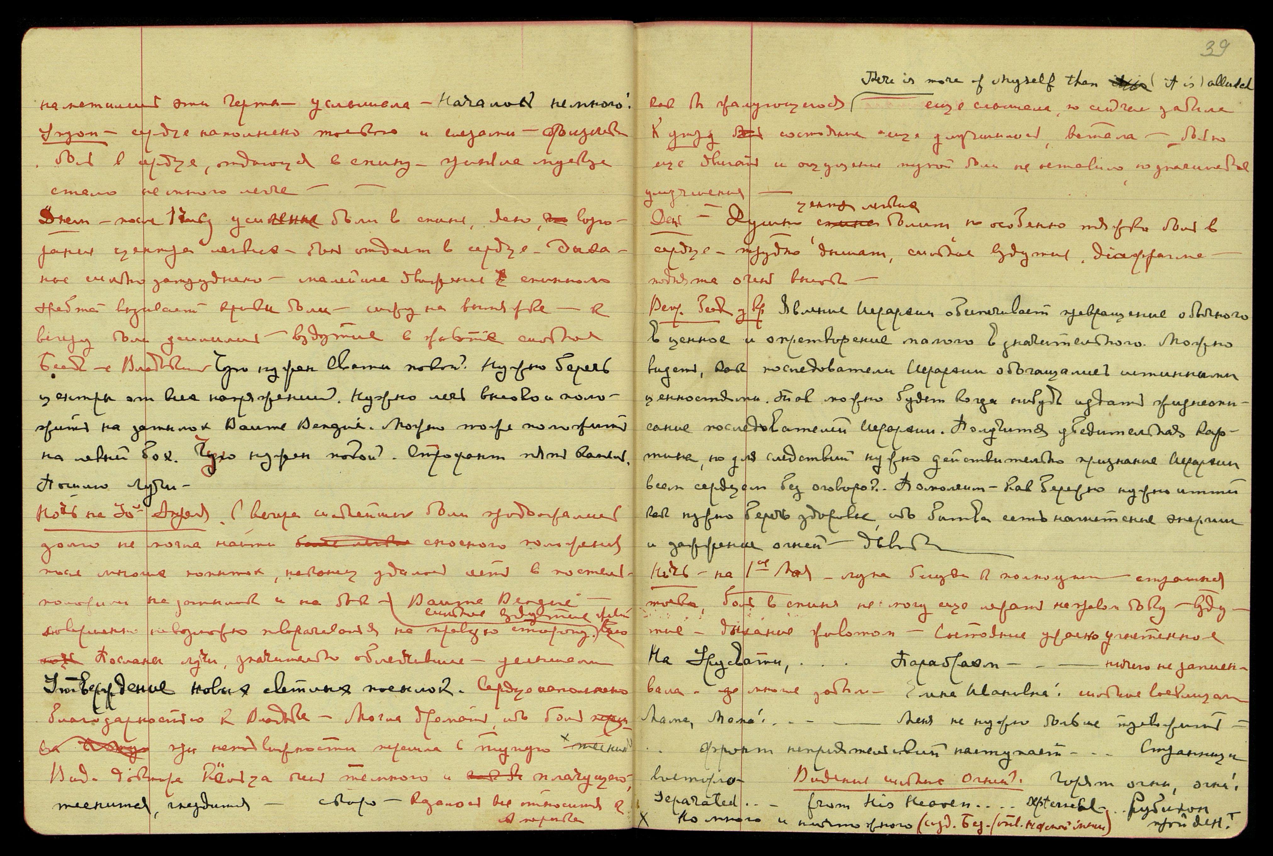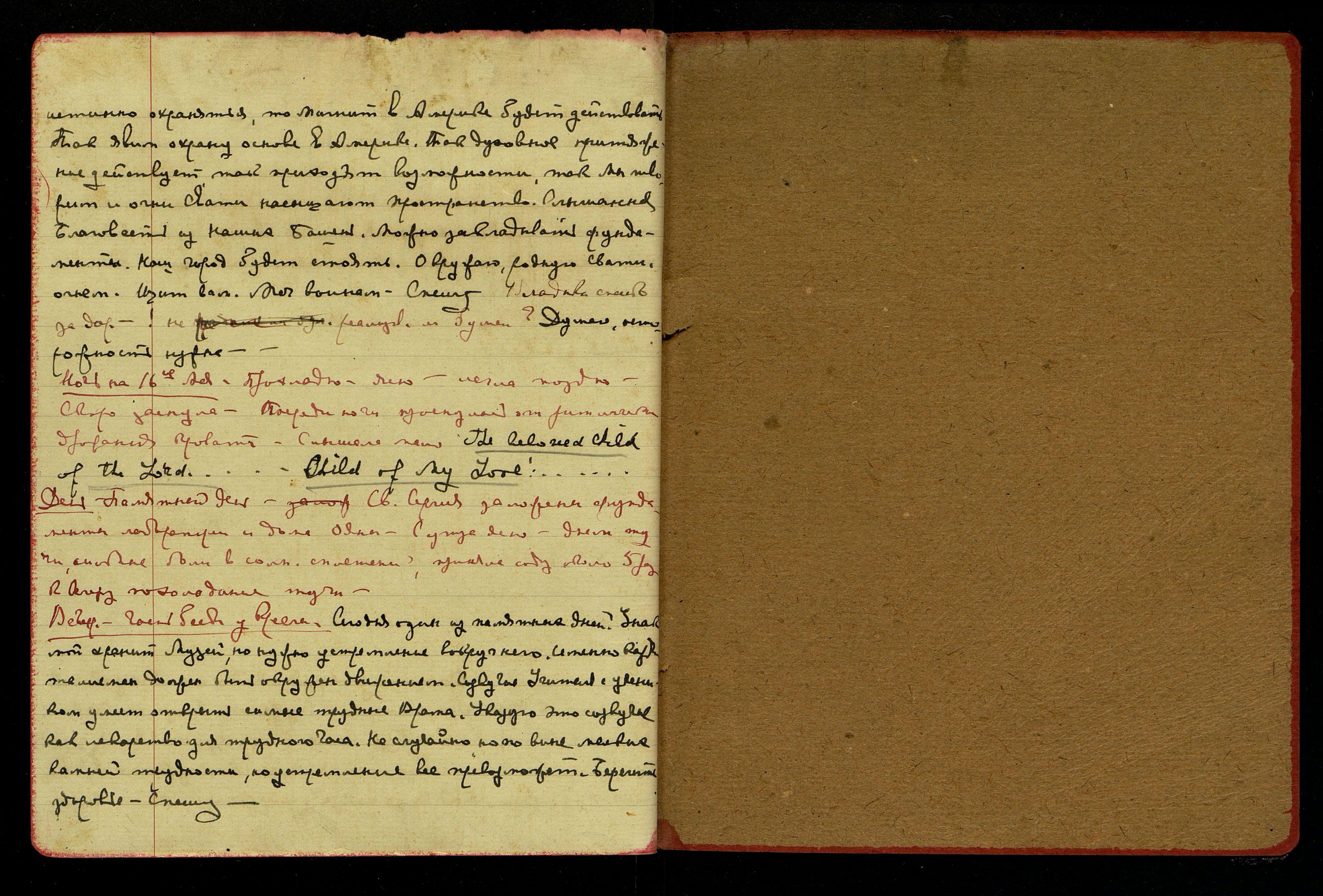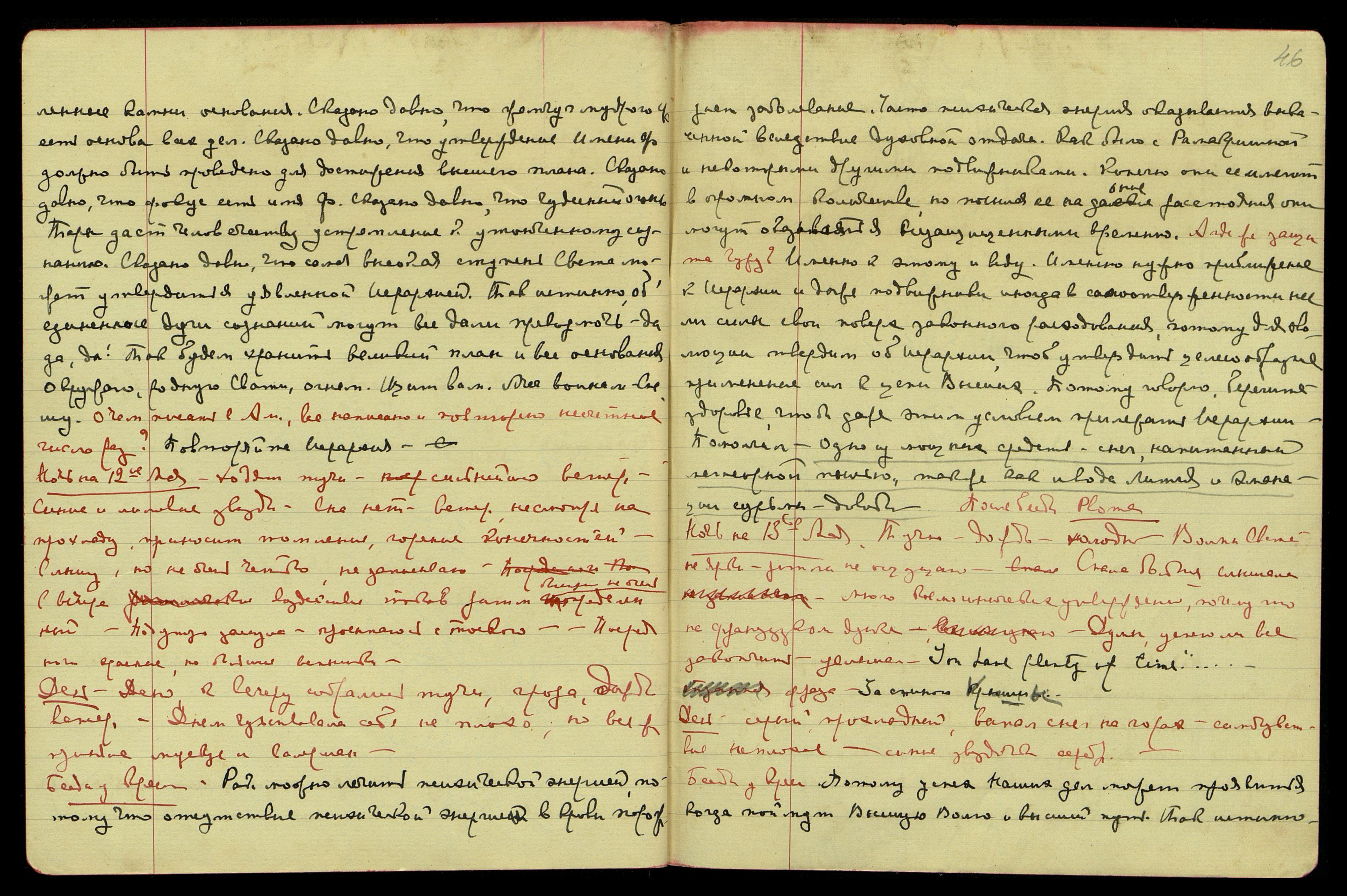 На Урусвати… Парабрахм… Ничего не записывала. Многое забыла. Елена Ивановна! Сильное восклицан[ие]. Мама, Мама!... Меня не нужно больше тревожить… Фронт неприятельский наступает… Странницы восторга. Видение сильных Огней. Горят огни, огни! Separated from His Heaven... [англ.: Отделен от Его Небес...] [одно слово неразборчиво]. Рубикон пройден