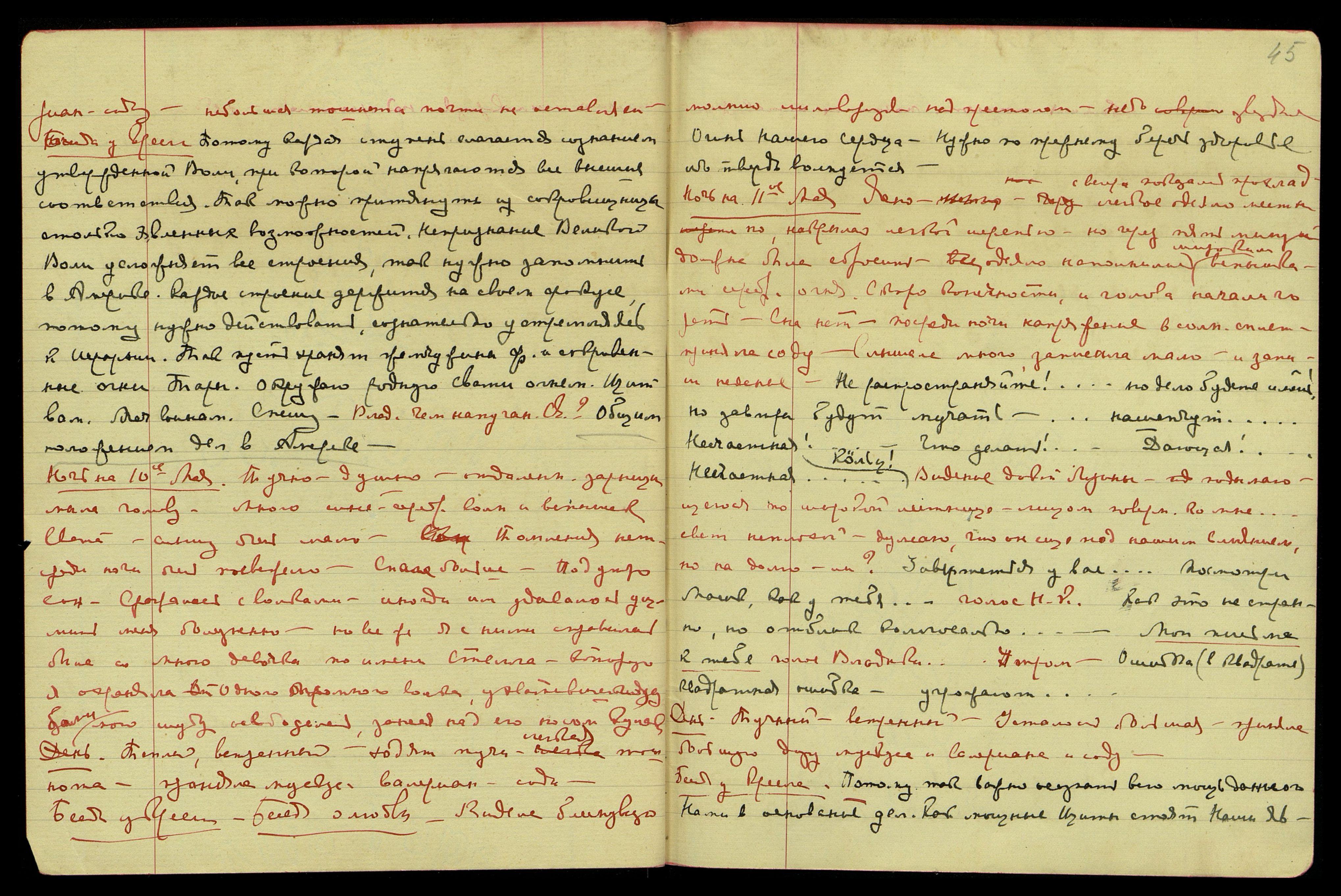 Ночь на 11-е мая. Ясно. С вечера показалось прохладно, легкое одеяло не хватало, накрылась легкой шерстью, но через пять минут должна была сбросить. Одеяло наполнилось широким[и] вспышками серебр[янного] огня. Скоро конечности и голова начали гореть. Сна нет. Посреди ночи напряжение в солн[ечном] сплет[ении]. Приняла соду. Слышала много, записала мало, и записала неясное: Не распространяйте!... Но дело будете иметь! Но завтра будут мучать… нашепчут… Несчастная!... Что делать!... Дающая!... Несчастная… Кельц
