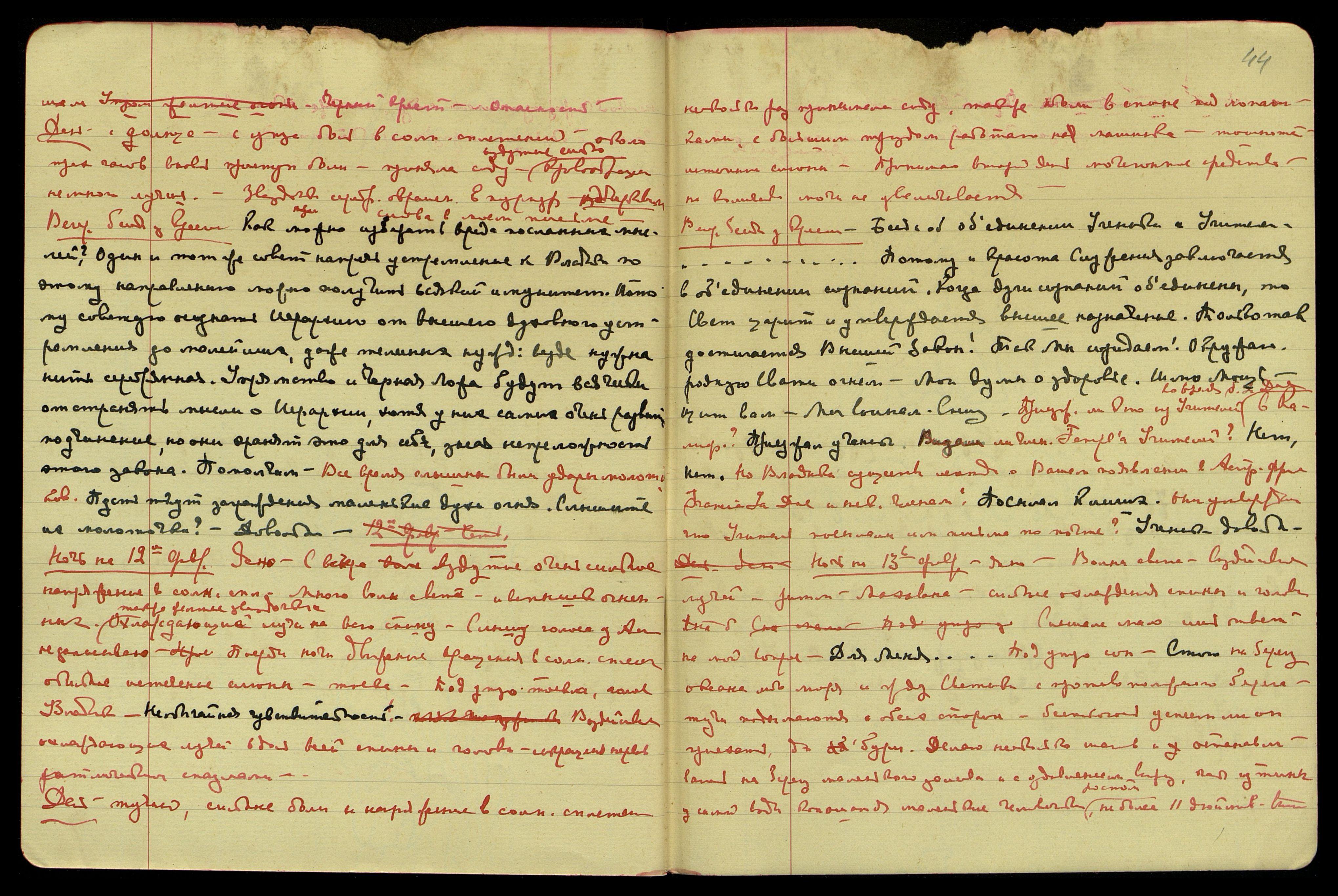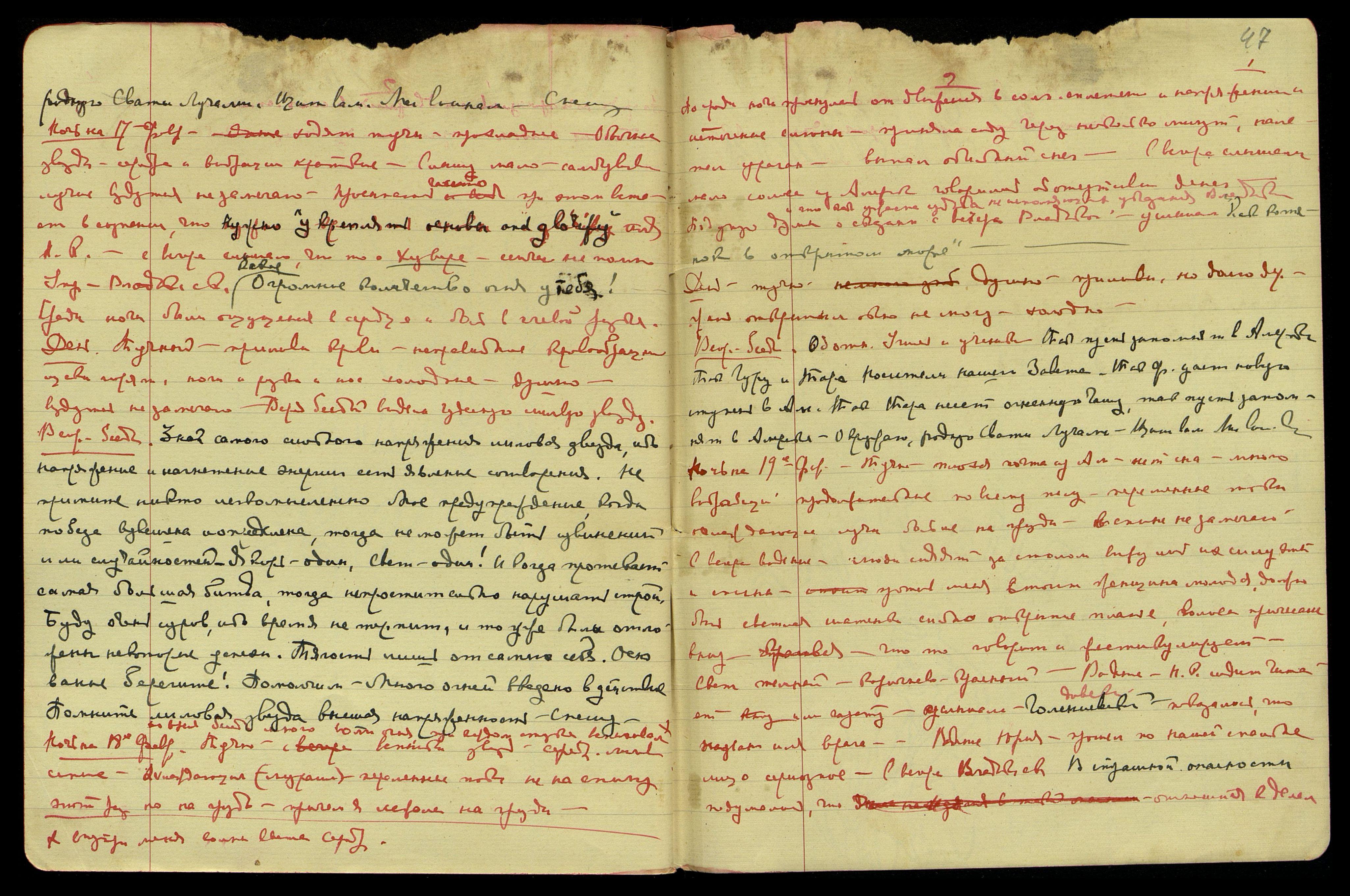 Ночь на 19-е февраля. Тучно, плохая почта из Ам[ерики], нет сна, много вибраций продолжительные, по всему телу переменные токи, охлаждающие лучи больше на груди, в спине не замечаю. С вечера видение − люди сидят за столом, вижу лишь их силуэты и спины, против меня стоит женщина молодая, должно быть светлая шатенка, сильно открытое платье, волосы причёсаны вниз, красивая, что-то говорит и жестикулирует. Свет тёмно-коричнево-красный. Видение − Н.К. сидит, читает книгу или газету, услышала: "Голиевский" Показалось, что названо имя врага. Видение Юрия, прошёл по нашей спальне, лицо серьёзное. С вечера Владык[ой] ск[азано]: "В страшной опасности", - подумалось, что относится к делам.