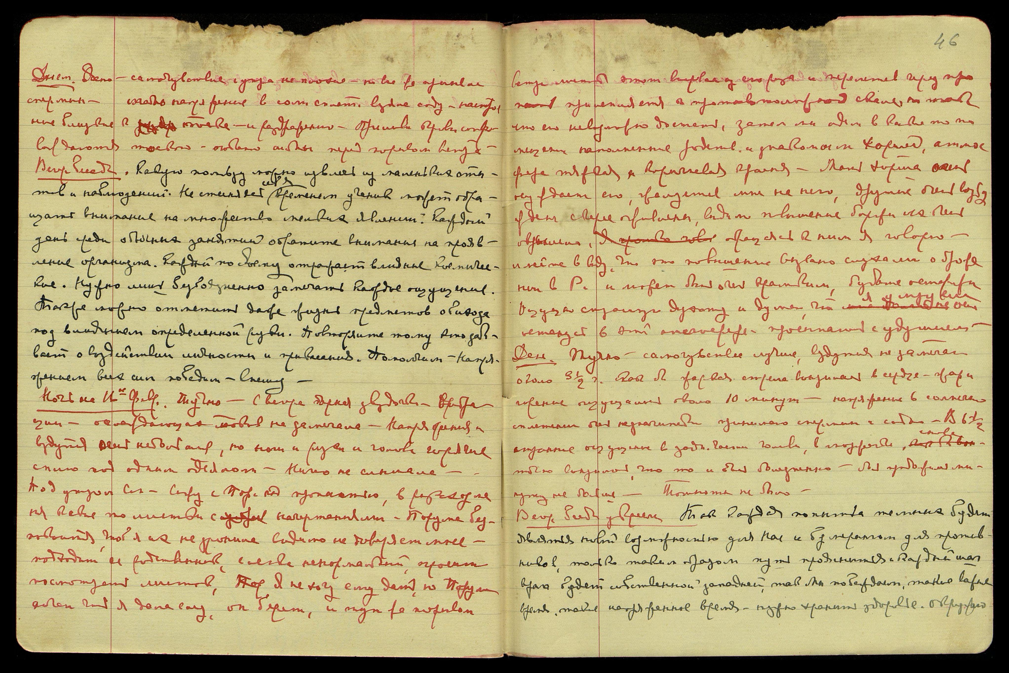 День. Есть много угроз со стороны врагов. Тяжкое кровообращение. Спина и уши горят, когда как руки синие от холода. Прим[ерно] около 4-х часов движение в солнечном сплетении, истечение слюны продолжались долго, головная боль, вернее, сильнейшее напряжение.