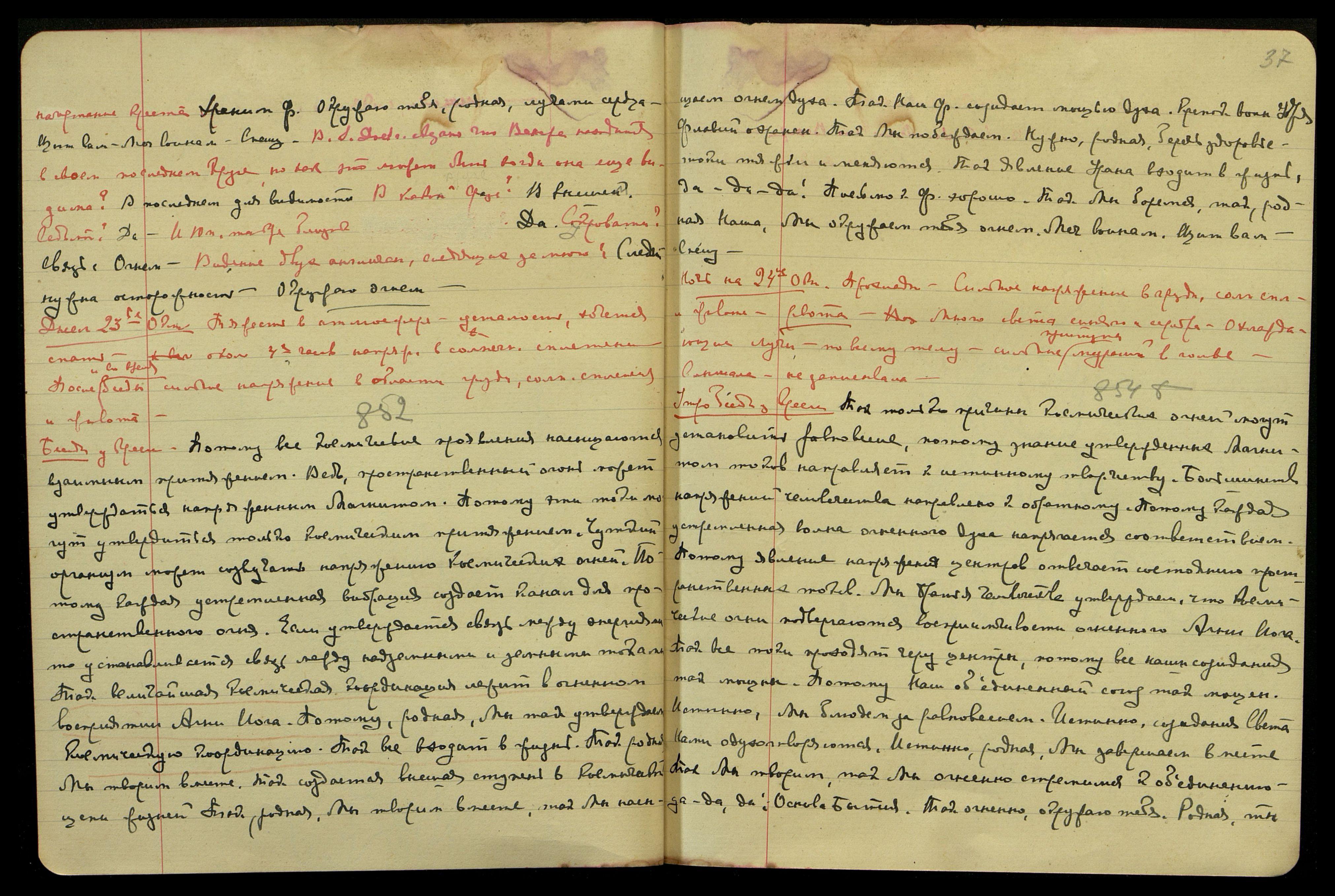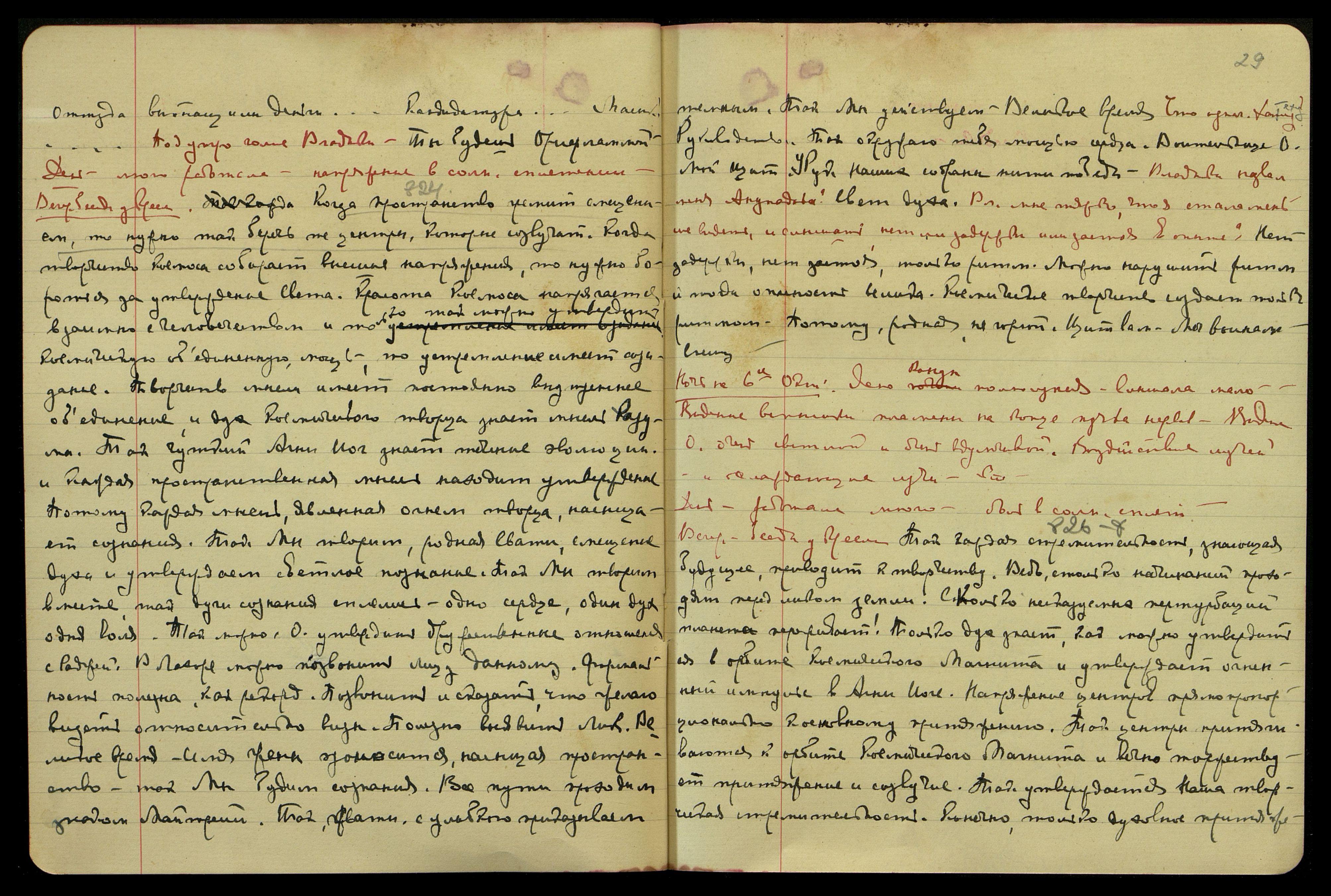 Ночь на 11-е окт[ября]. Луна не убыли, тяжкие токи. Сильный озноб от пояса к темени, и в тоже время горение ног. Тяжёлое самочувствие - томление. Заметила, что космическая нота, тональность которую обычно слышу ночью, понизилась, как мне казалось, более, нежели на пол-тона. Слышала много, но вследствие тяжёлого состояния мало записывала и очень неясно, одна запись на другую. Он так же глуп как и ... - запись неразборчива. Красивый путь под покровительством государства... But of Kalpa- неясная запись. The live explained [англ.: в жизни объяснили]... не пропало даром... Пропеллер величайшая сила в - снова одна запись на другую.. К совершенно меняющему жизнь существованию... Там "Лев" пришёл. Слышала очень много.